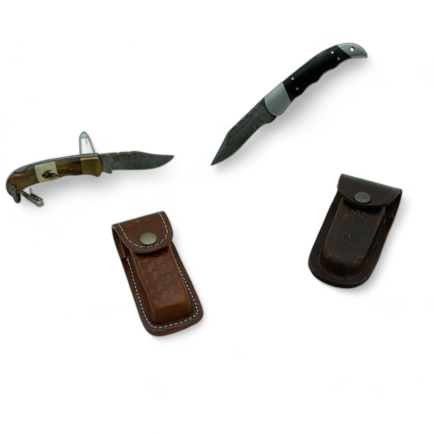 Lot 923 Folding Damascus 2 1/2" Blade Knife and Folding 3" Blade Knife with Leather Sheaths