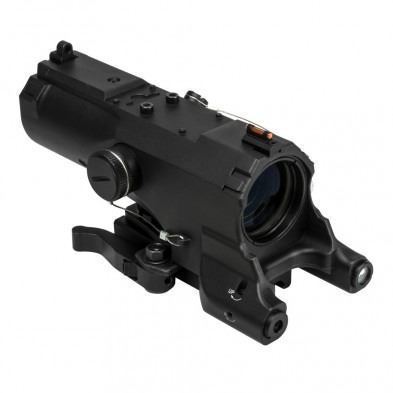 Glass Etched Urban Tactical Reticle (Blue illuminated) for Quick Target Acquisition. Electronic Control Panel for: Blue Reticle Illumination levels, Green Laser On/Off, and NAV LED Light cycles mode to Red LED/ White LED/ Off