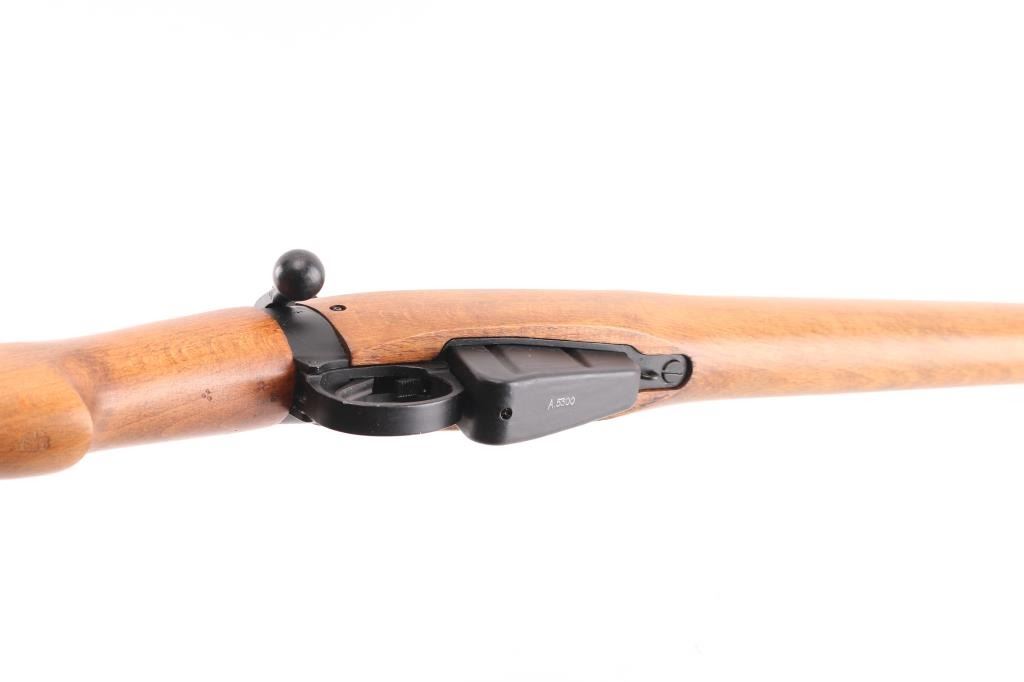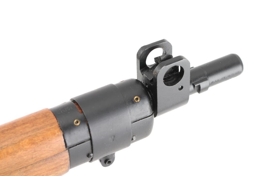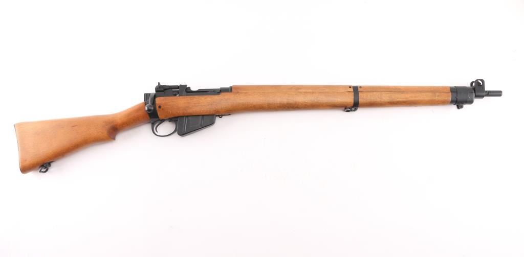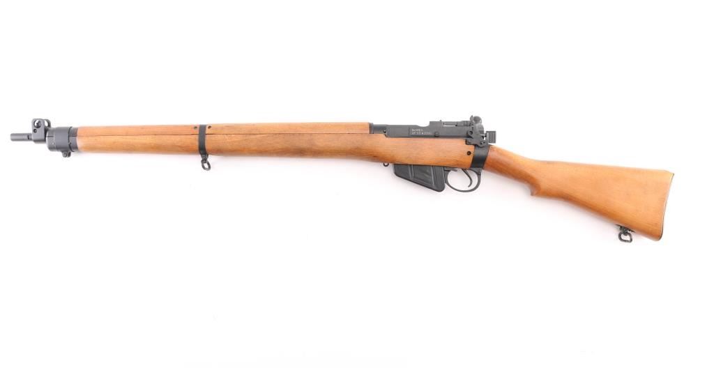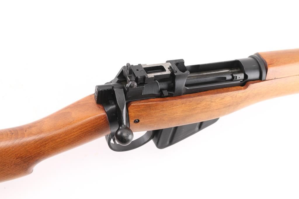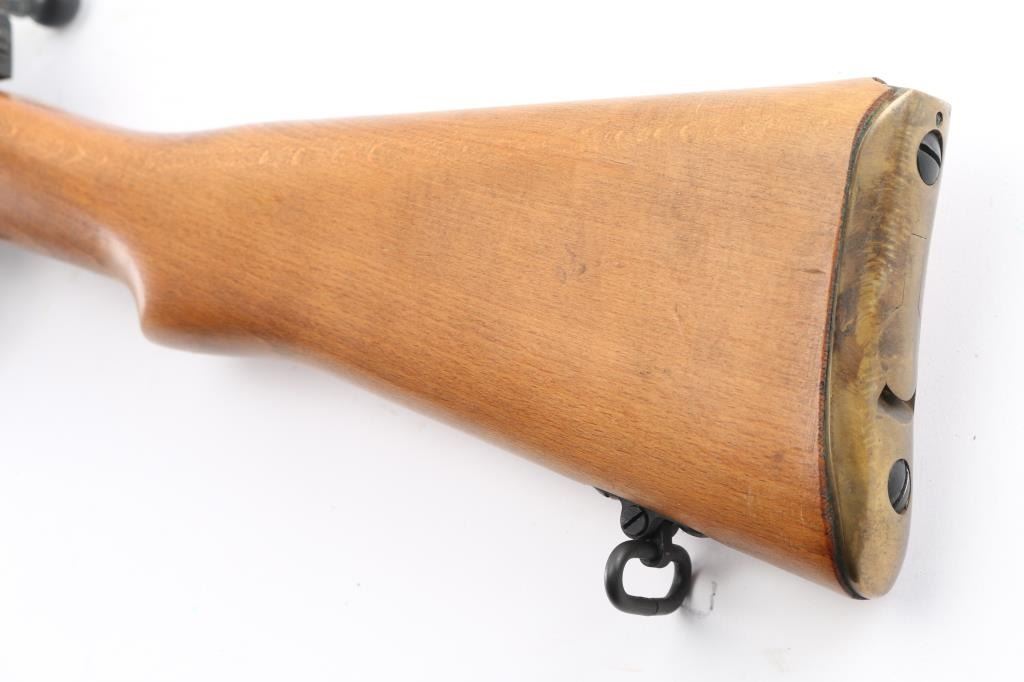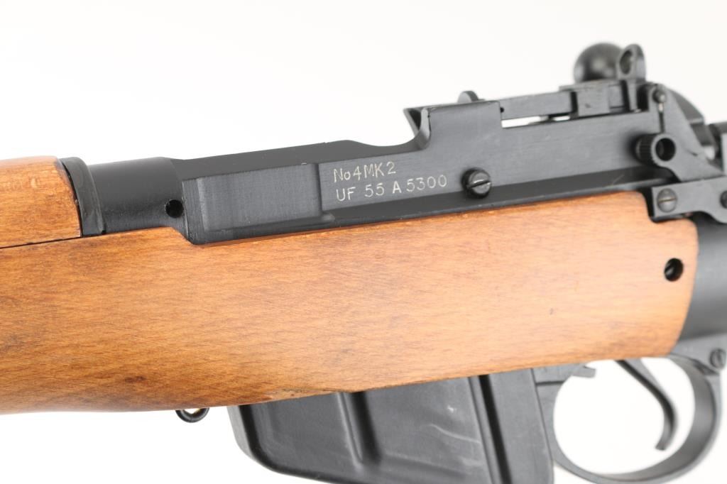 SN: A5300 'UF 55' British military bolt action rifle dated 1955, imported by CAI, St Albans VT. Features black finished metal, two piece straight gripped stock with full length handguards, brass buttplate, 25" barrel, bayonet lug, protected blade front sight, rear peep sight with flip-up elevation ladder, sling swivels, detachable 10 round magazine, manual safety. Bore is very good bright condition. Overall condition is near new with handling marks, thinning of finish on bolt body from rubbing during operation. Numbers match on bolt, magazine, under forend in wood. Condition is NRA Excellent *** C&R Firearm ***