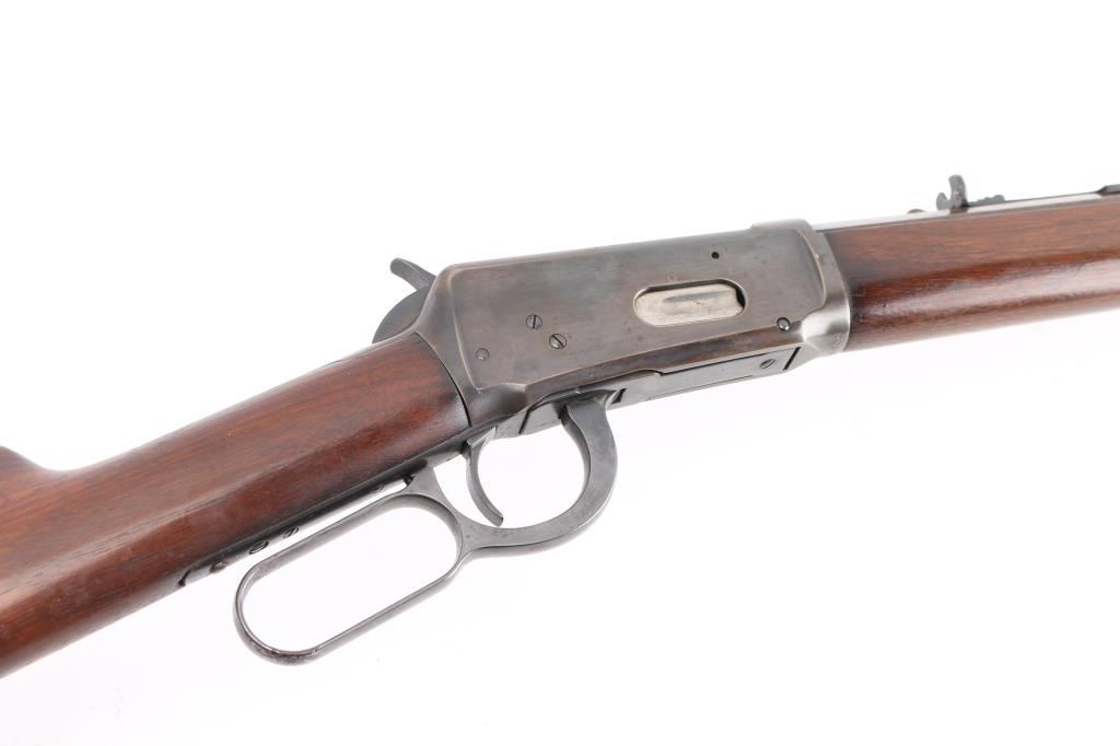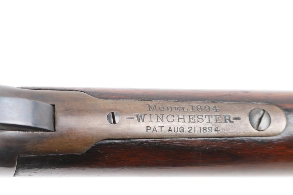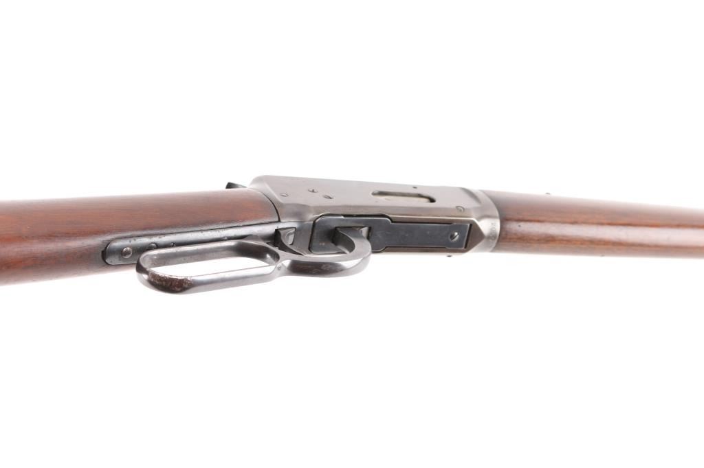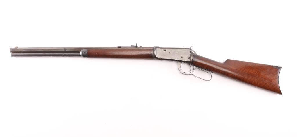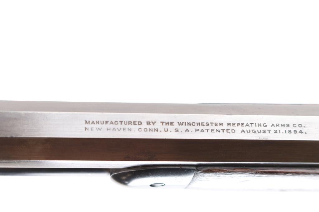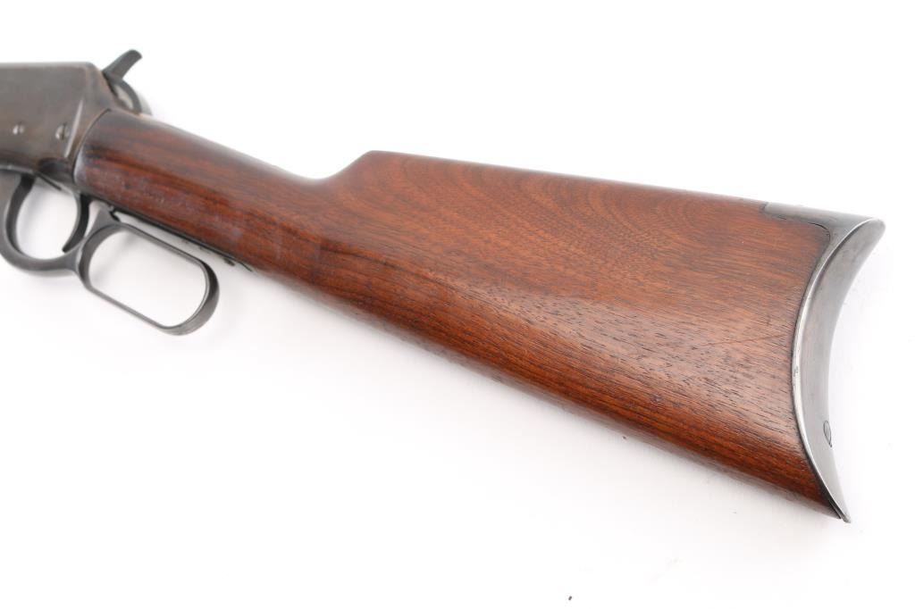 Vintage lever action rifle manufactured circa 1901. Features 21.5" octagon barrel (appears shortened, no dovetail for mag tube bracket, no forward band), full length magazine tube, dovetailed blade front sight, buckhorn rear sight, smooth walnut forend & straight wristed buttstock, steel forend cap & crescent buttplate. Bore is fair to good condition, dark and lightly pitted throughout, strong rifling. Retains 20% finish with much fading and drifting, overall showing dark colors with brown tones, some patina on barrel (with moderate patina and pitting near muzzle, including forward part of mag tube), few small pits on receiver. Probably reblued, or some parts re-done, colors look "off" on receiver, with finger lever showing strong fresh blued color. Mag loading gate appears nickeled or polished bright metal. Markings are crisp. Wood is good or better condition, some gapping around buttplate, some losses at tang, appears lightly sanded & refinished with tung oil or similar, oil staining at wrist. Action is sound, smooth operation. Condition is NRA Good+ (reworked) *** C&R Firearm ***