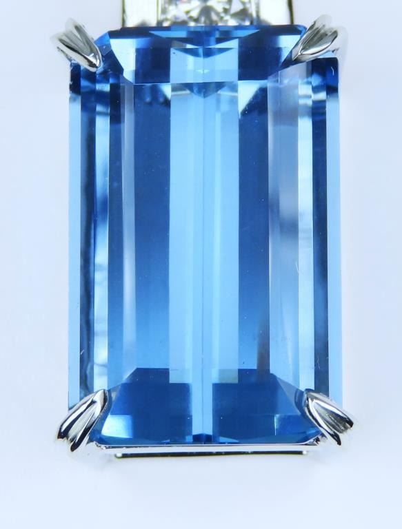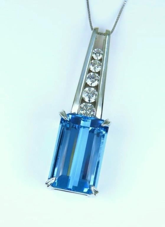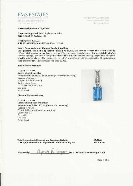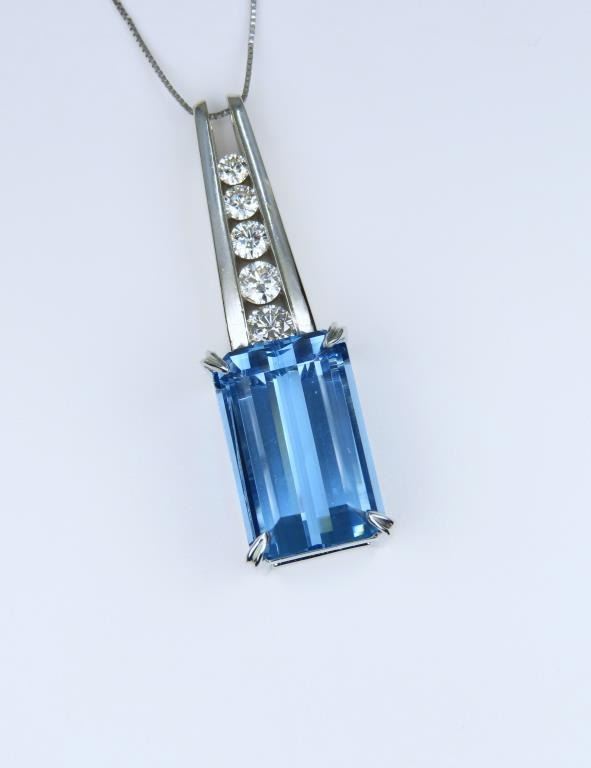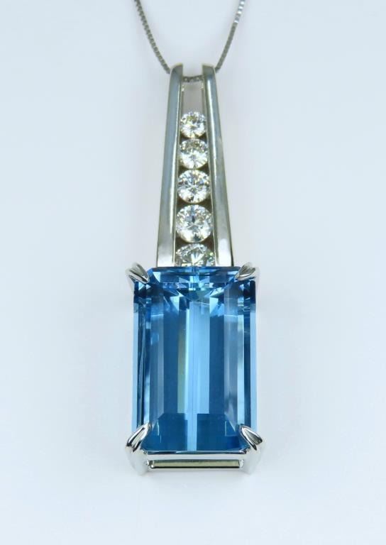 BLUE Santa Maria Aquamarine and Diamond Pendant featuring a brilliant 14.60 carat Emerald cut Aquamarine accented with 5 round cut channel set Diamonds weighing approx. 0.91 carat with G-H colors and VS clarity set in a stunning C.A. Gems 14 karat white gold custom pendant. Full Retail Appraisal - $22,000.00