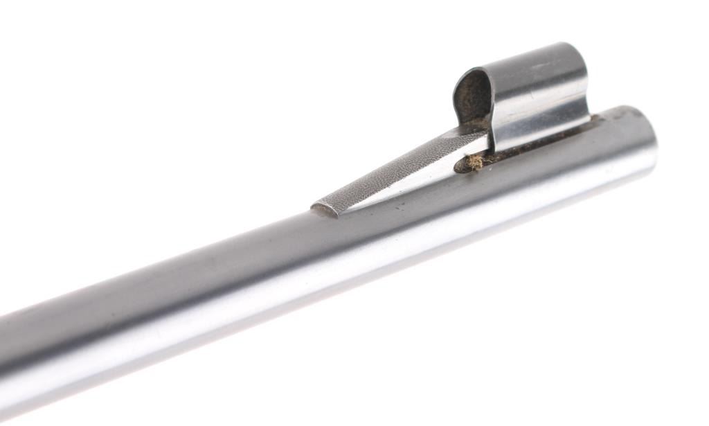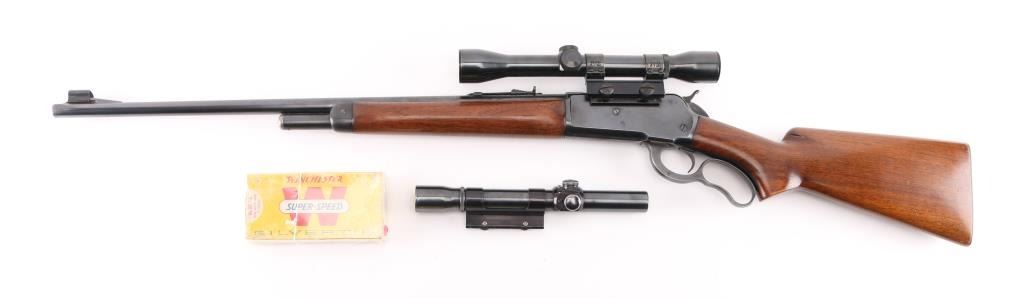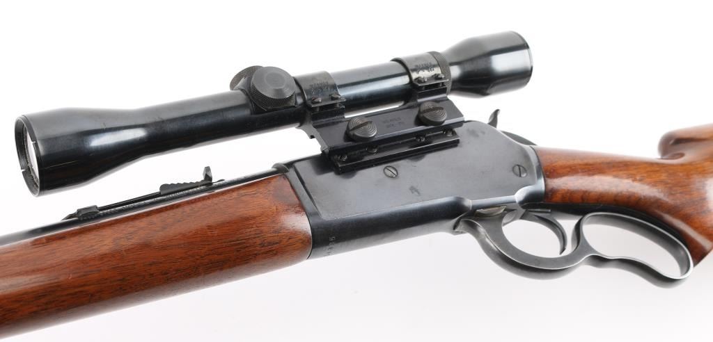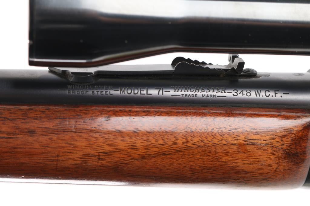 American made, pre-war, lever action rifle with a long tang, standard version, manufactured circa 1938, blued steel, approximately 24" barrel, tunneled ramp front sight, buckhorn rear sight, tube fed, side loading, top ejection, checkered hammer spur, curved oval loop, smooth trigger, checkered metal buttplate, finish is excellent, Walnut pistol grip stocks are complete but show some dings, unmarked scope with Weaver mount. Includes a leather buttpad, Weaver K25 scope, one sealed 20-round box of Winchester .348 Win Silvertip 200 grain expanding bullet ammunition. The Model 71 was never chambered to any cartridge except .348, and the .348 was never factory-chambered to any rifle other than the 71. It was—and remains—a big-game go-to combination. Stock style and barrels differed, but cosmetically and almost mechanically, it is an 1886, although few parts are interchangeable. **NRA Excellent** Modern Firearm