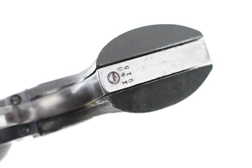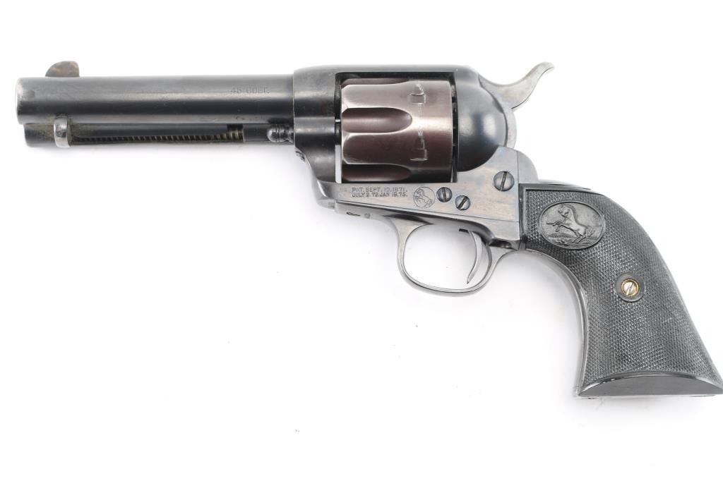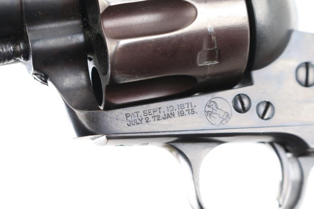 Restored. Antique 1st Generation SAA manufactured 1892. 4 3/4" barrel with front blade and v-notch rear sights. Top of barrel stamped "COLT'S PT.F.A.MFG. CO HARTFORD CT. U.S.A." in two lines. Two-line black powder patent dates are visible on the left frame, along with the 'Rampant Colt'. "45 Colt" stamped on left barrel. The serial number matches on the frame, triggerguard, and backstrap, assembly number '677' on the loading gate, all marking are clear, except for the barrel address, which is readable, but a little shallow from the re-blue. The grips are later replacements. Bore is fair with strong rifling, but has some light scattered pitting. Action is crisp, and hammer locks up tight. The replaced grips are excellent. Reblued finish is very good, with minor muzzle wear, tracking, and edge wear on the refinished plum colored cylinder. NRA Condition-Good/Restored. Antique Firearm.