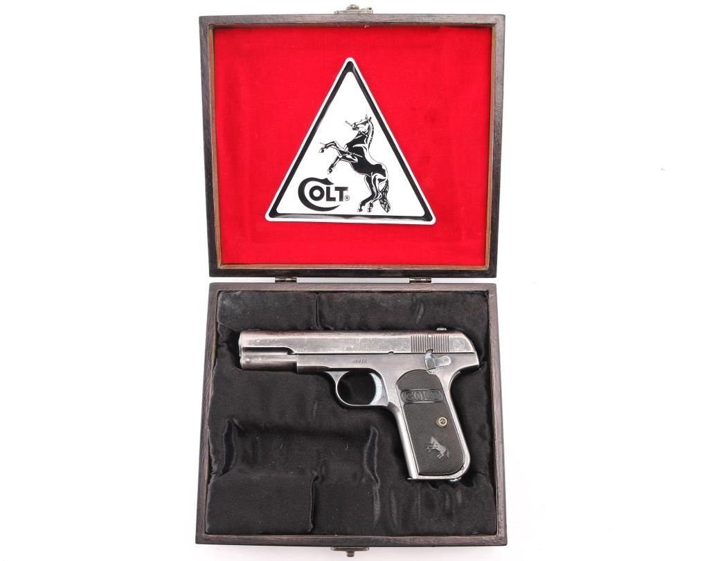 'Type 1' Vintage semiautomatic pistol features blued finish, black hard rubber grips with embossed "Colt" banners, and "Rampant Colt", 4" barrel (unmarked, possible replacement), fixed sights, manual safety, grip safety, heel magazine release. Bore is very good/bright. Metal surfaces retain about 40% original blue, with handling wear, scratches, bright nitre blue visible on the trigger, and slide stop. Grips are good condition, no visible cracks. Trigger guard is marked with "&", Colt's returned to factory marking. Includes an unmarked magazine. Comes in a nice form fitted display case with black lining, includes the Colt factory letter, shipped to the Marshall-Wells Hardware Co., October 27, 1906. Condition is NRA Good. C&R Firearm.