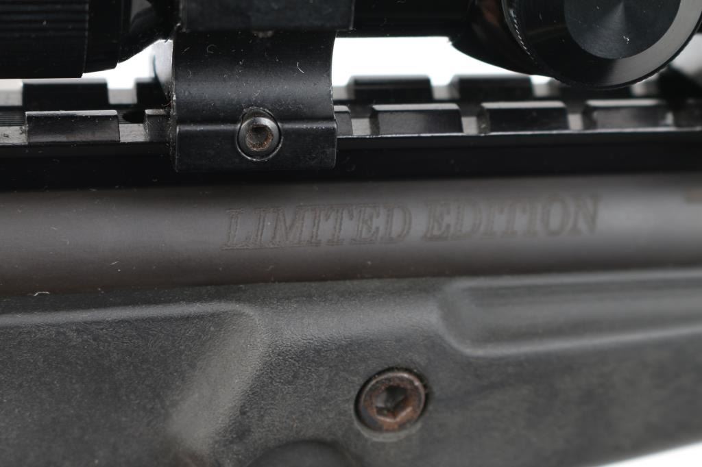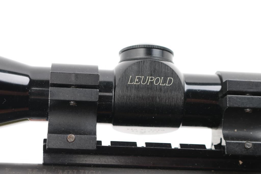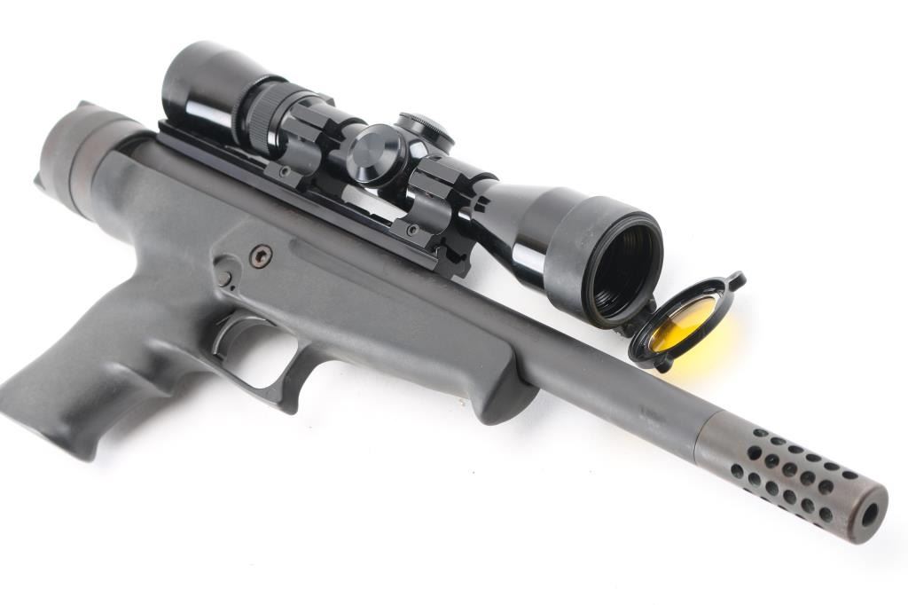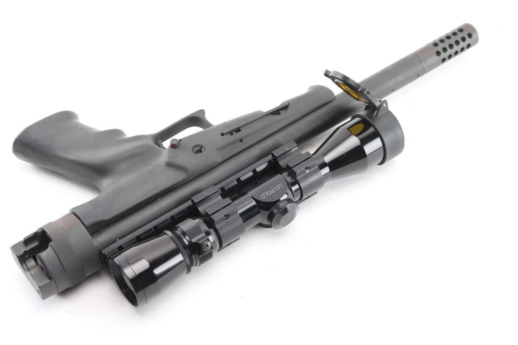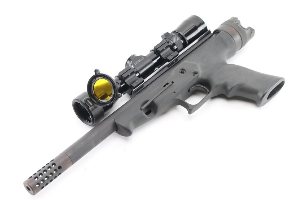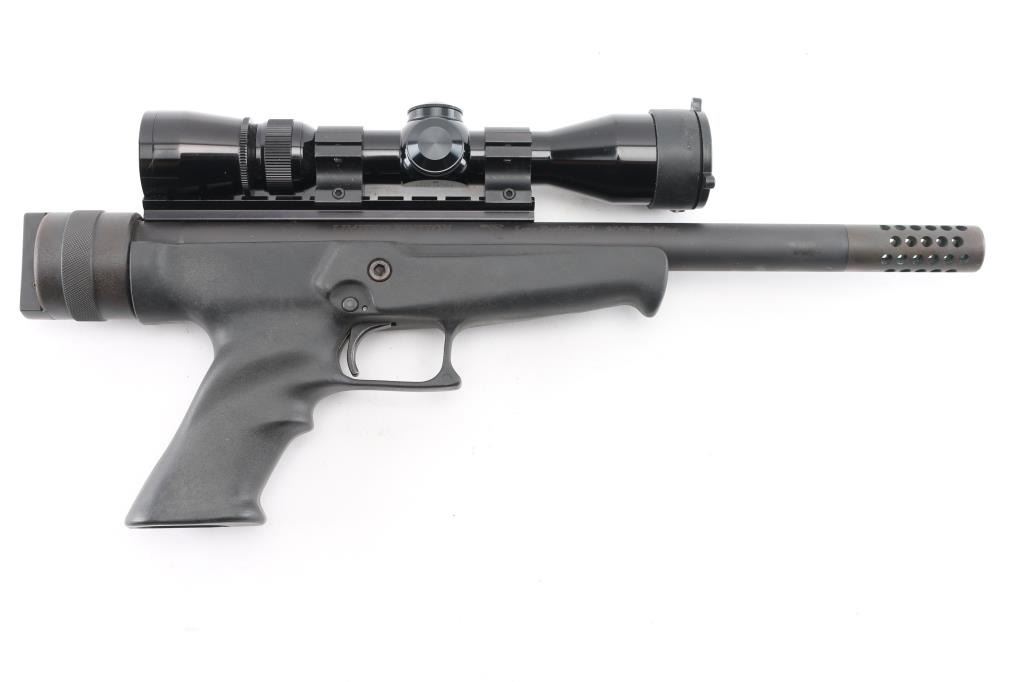 SN: A01358 Single shot silhouette/hunting pistol chambered in 300 Winchester Magnum. Features matte black finish, black polymer grip assembly, 14" barrel, muzzle break, side charging lever, cocking indicator, cross bolt safety, rotating breech block at rear. Mounts a Weaver rail with Leupold VARI-X 2.5-8x EER pistol scope with duplex reticle. Bore is very good bright condition. Retains 95% finish with handling marks. Polymer is very good. Condition is near NRA Excellent *** Modern Firearm ***