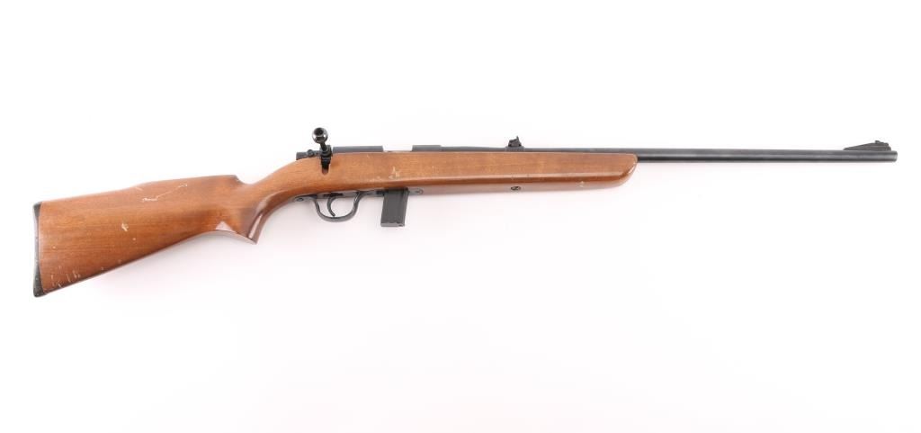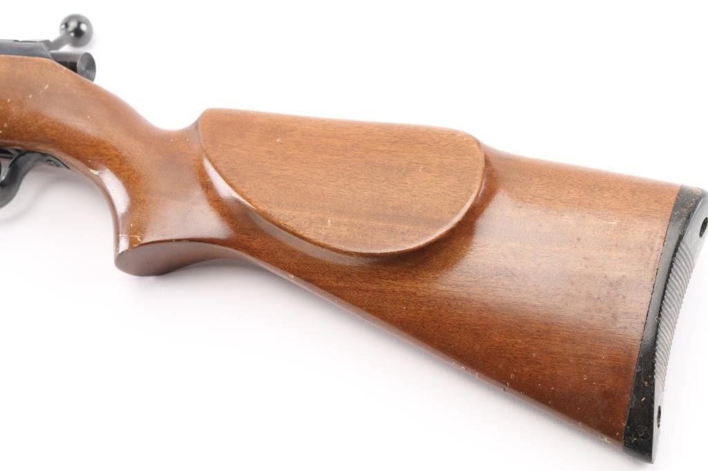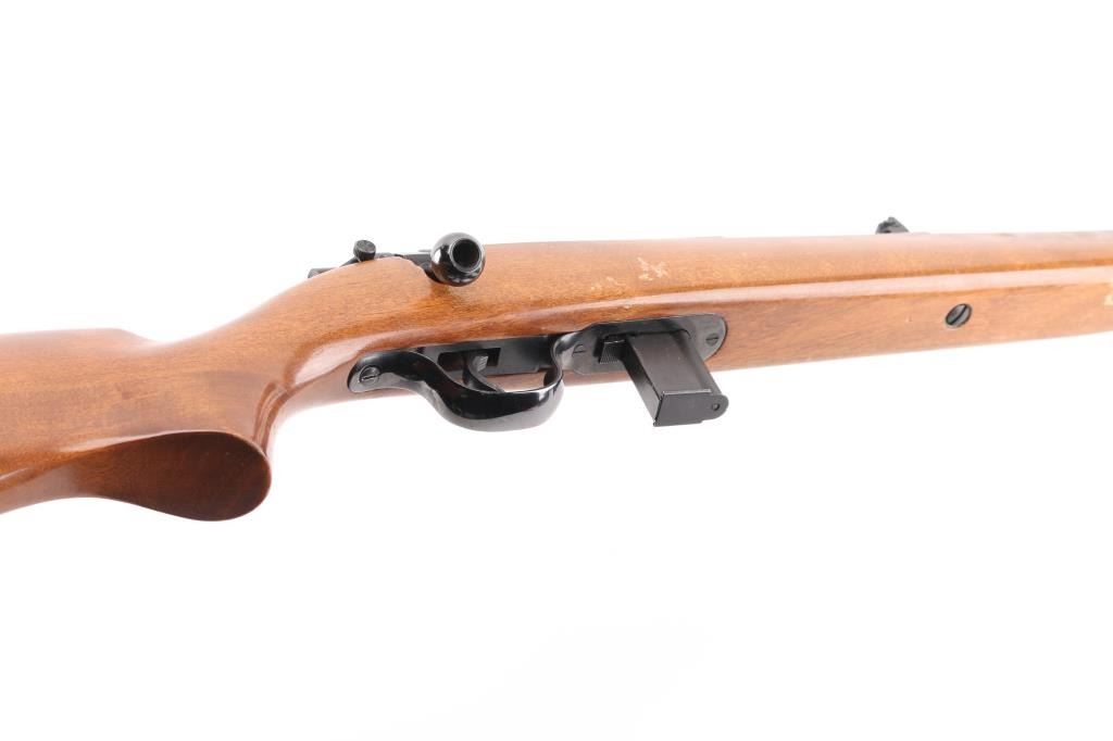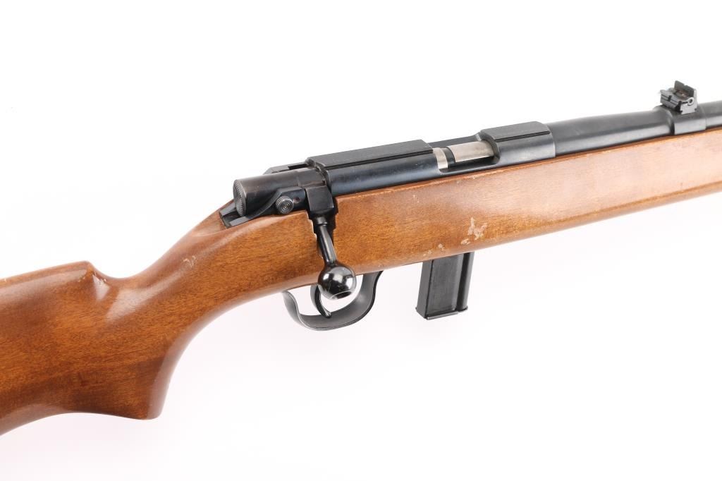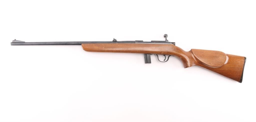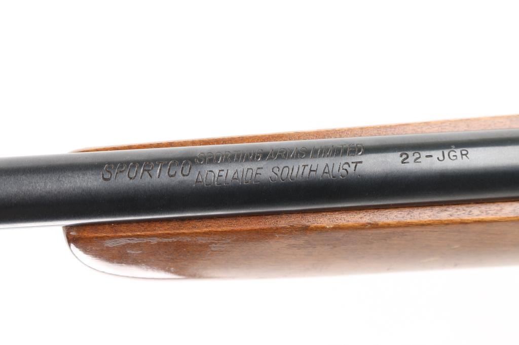 Made in Adelaide, South Australia. Magazine fed from a 10-rd box magazine. 22" barrel, blade/bead front, adjustable V-notch rear sights. .22 JGR is .32 ACP necked down to .22 caliber. Receiver slotted for optics. Straight bolt handle. Manual safety. One piece hard wood stock with left cheek piece, serrated plastic buttplate, serrated trigger. Bore is excellent/bright, blue finish is about 98%. wood is sound, has numerous scratches. Rare to find in the U.S. No import marks. Went out of business in the early 80's. NRA Condition-Very Good. Modern Firearm.