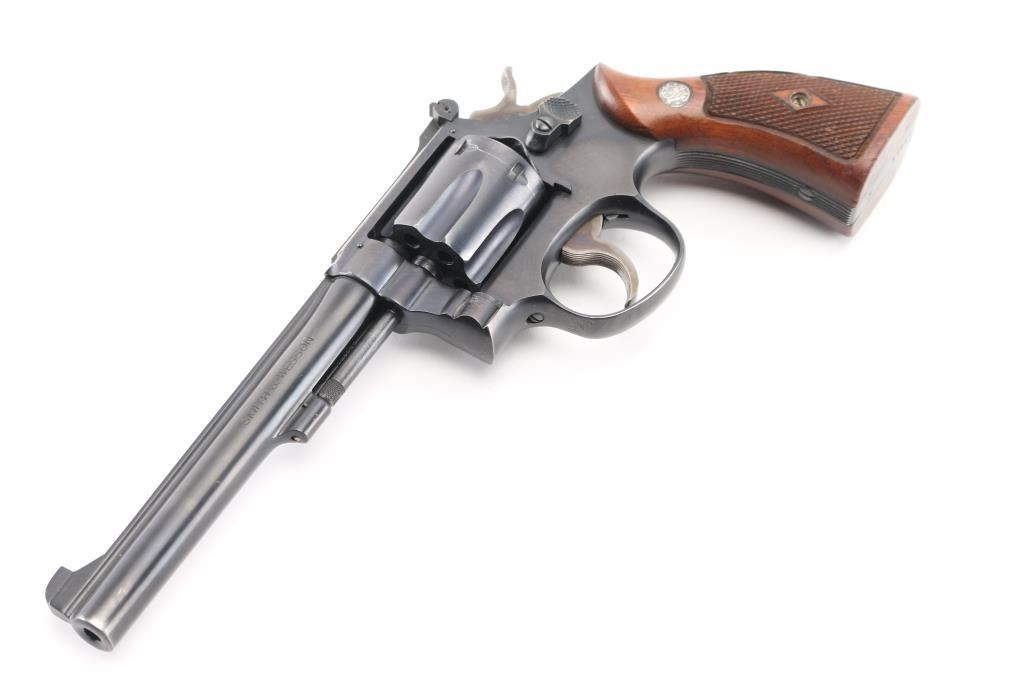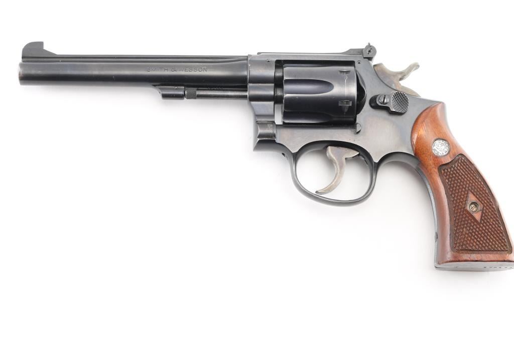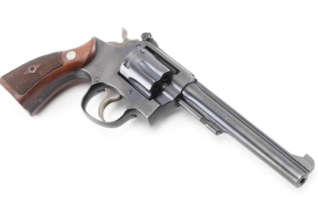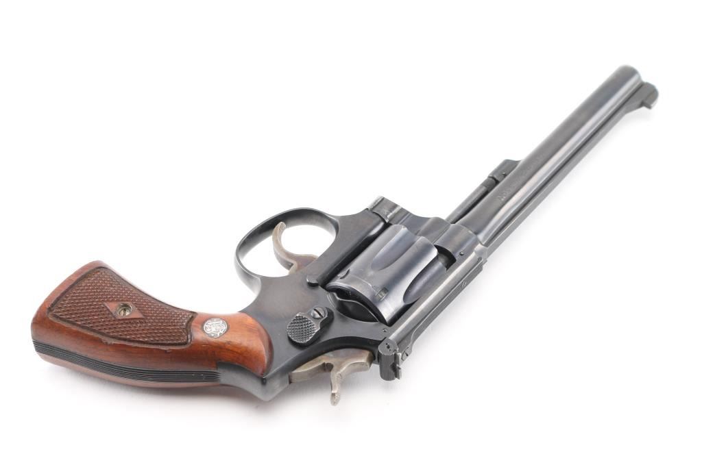'K-22 Masterpiece" double action target revolver manufactured circa 1952, chambered for 22 Long rifle. Features blued finish, checkered wood Magna style grips with S&W medallions, 6" pinned barrel, 6 shot fluted cylinder, Partridge front sight, adjustable rear sight, case colored grooved narrow trigger, case colored checkered medium width 'hump back' spur hammer. Five screw target K frame square butt with grooved backstrap. Bore and charge holes are very good bright condition. Retains 90% blue with handling marks, drag line, edge losses. Grips are very good condition with small dents. Action is smooth with tight lock-up. Condition is NRA Very Good++ *** C&R Firearm ***