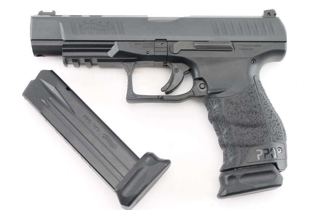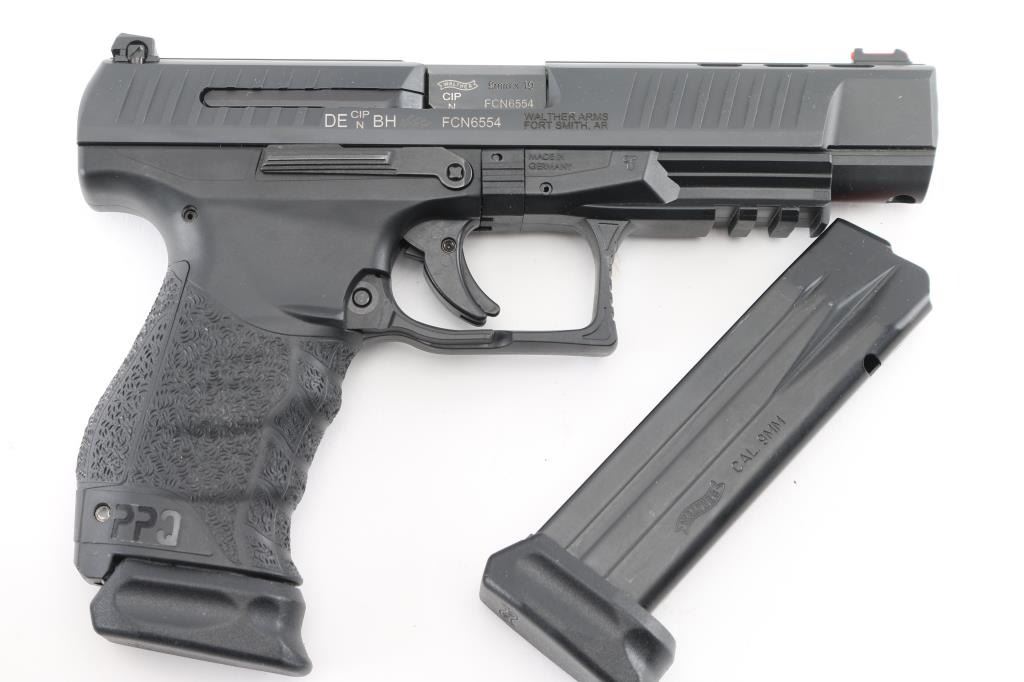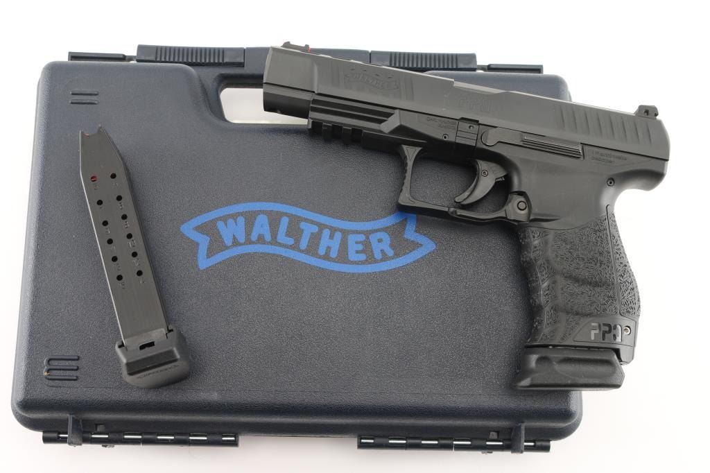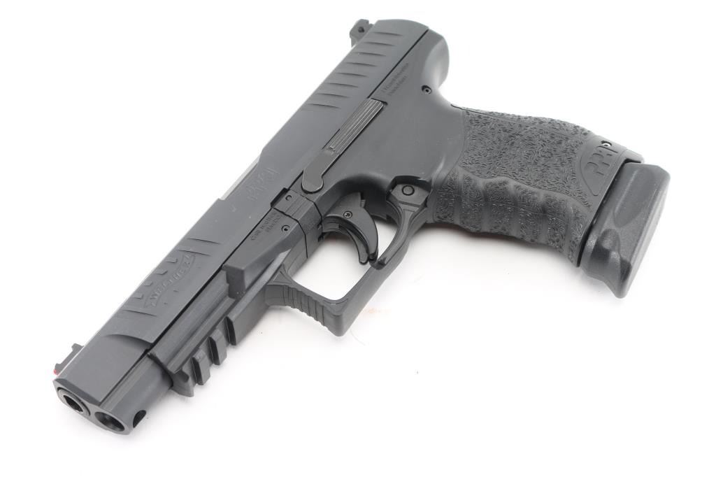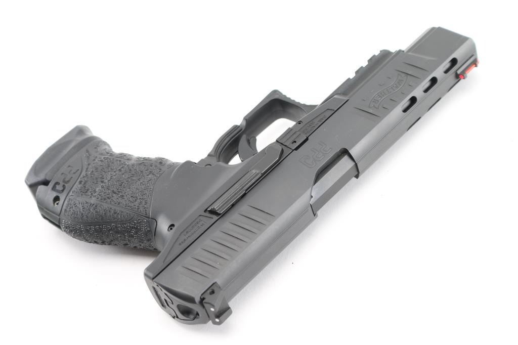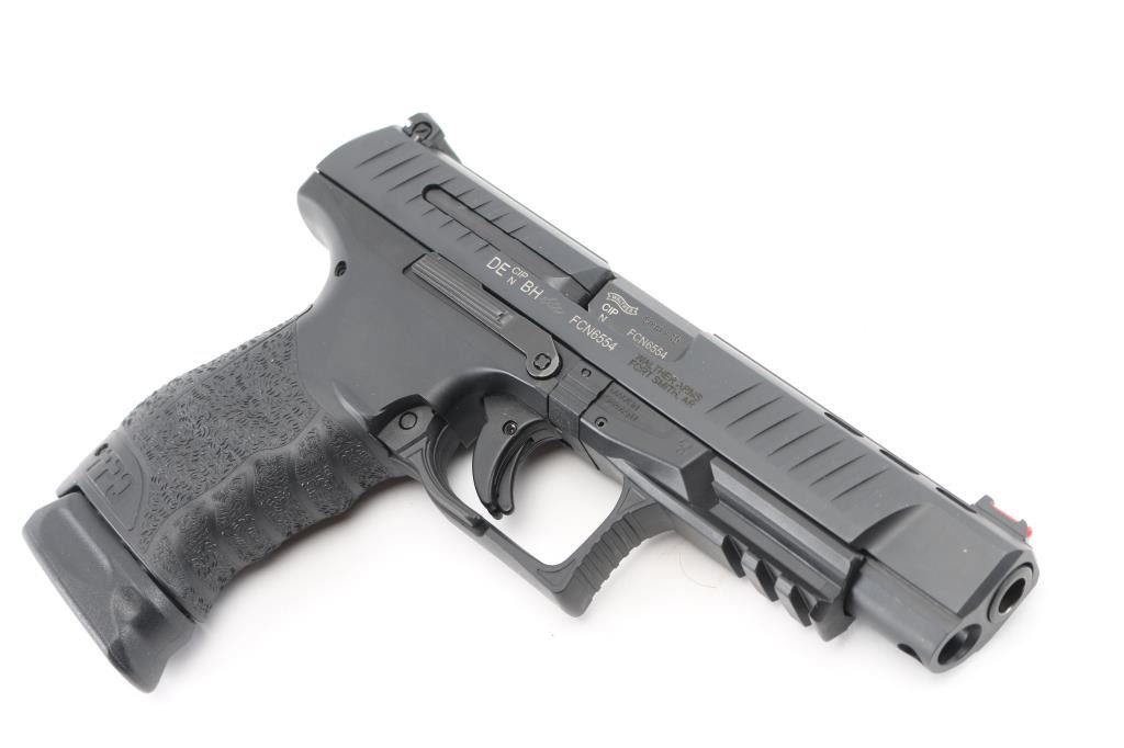 Semi-automatic striker fired pistol chambered in 9x19mm. Manufactured in Germany, imported by Walther Arms of Fort Smith, AR. Features a black Tenifer finished slide with fore & aft cocking serrations, 5”, three-dot sights with fiber optic front & windage adjustable rear sight, integrated trigger safety, ambidextrous slide catch, ambi push-down lever magazine release on sides of triggerguard, black polymer frame with integral accessory rail, interchangeable backstrap, lanyard bar in butt. Bore is excellent. Overall condition is like new with few handling marks. Includes 2 magazines, original factory hard case with manual, two additional backstraps. Condition is NRA Excellent - like new *** Modern Firearm ***
