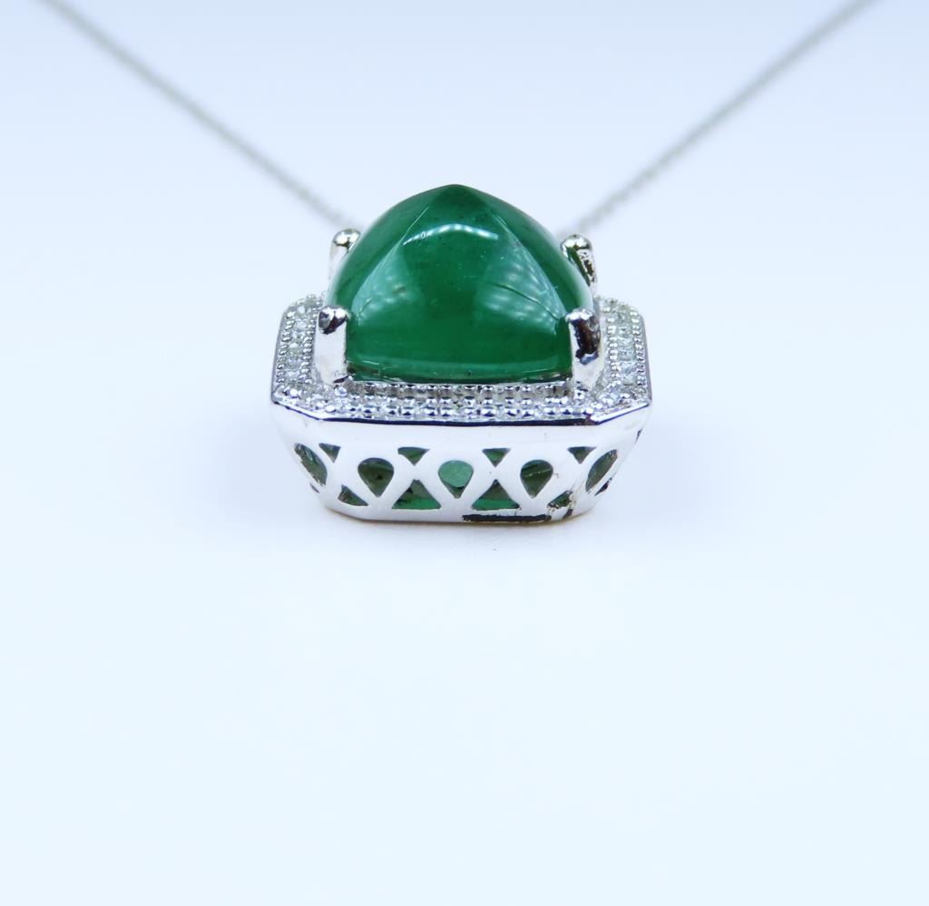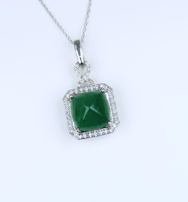 Cabochon Emerald and Diamond Pendant featuring a Natural Emerald with rich Blue Green color accented with 44 round Diamonds with H-I colors and VS clarity set in a detailed 14 karat white gold setting. Full Retail Appraisal - $7,800.00