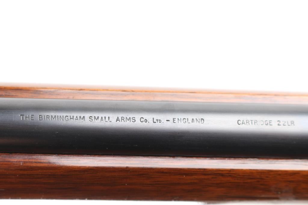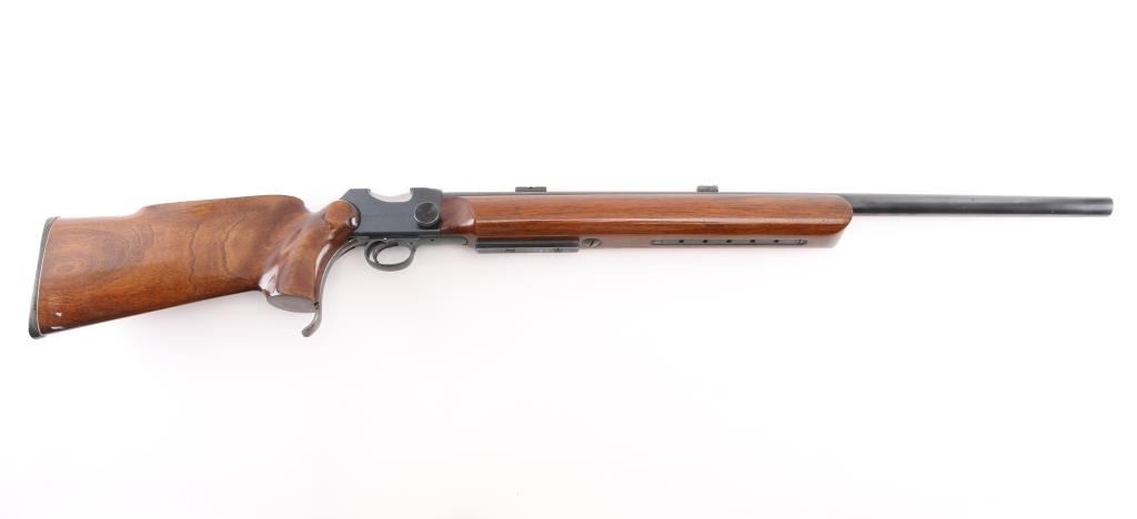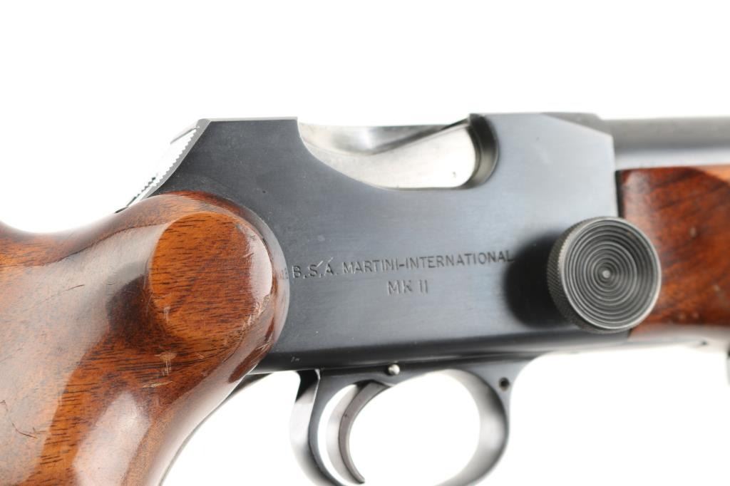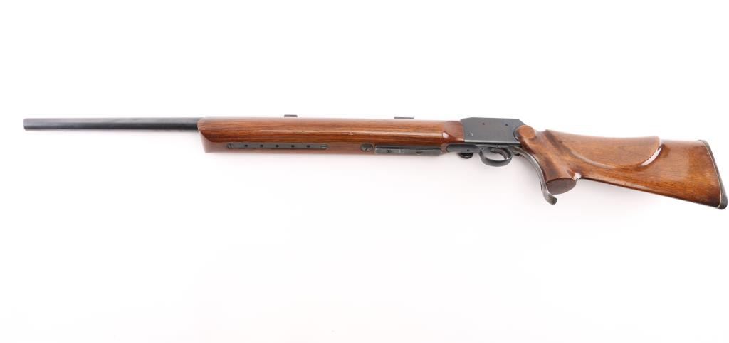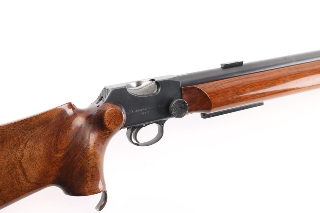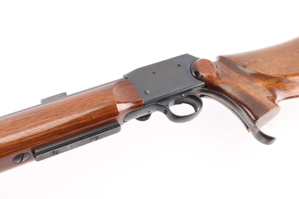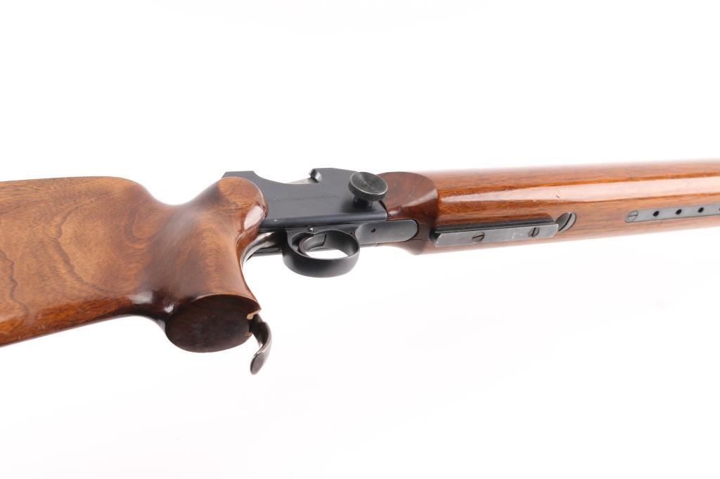 SN: UE7254X English made tilting-breech lever-action single-shot target rifle made circa 1953-1959, with a 29" heavy barrel, recessed crown, smooth wood beavertail forend, hand stop rail and dovetail block below forend, smooth wood shoulder stock with right handed roll over cheek piece and factory butt plate, scope dovetails mounted on barrel. No optics nor iron sights installed. Blued finish is about about 95% with handling marks, letters are sharp, does not appear refinished. The finger lever shows very good case colors, lengthened, possibly reworked. Bore is very bright, looks pristine. Action is faultless and has a very light trigger pull. Wood is very good/sound with some minor scratches. Condition is near NRA Excellent *** C&R Firearm ***