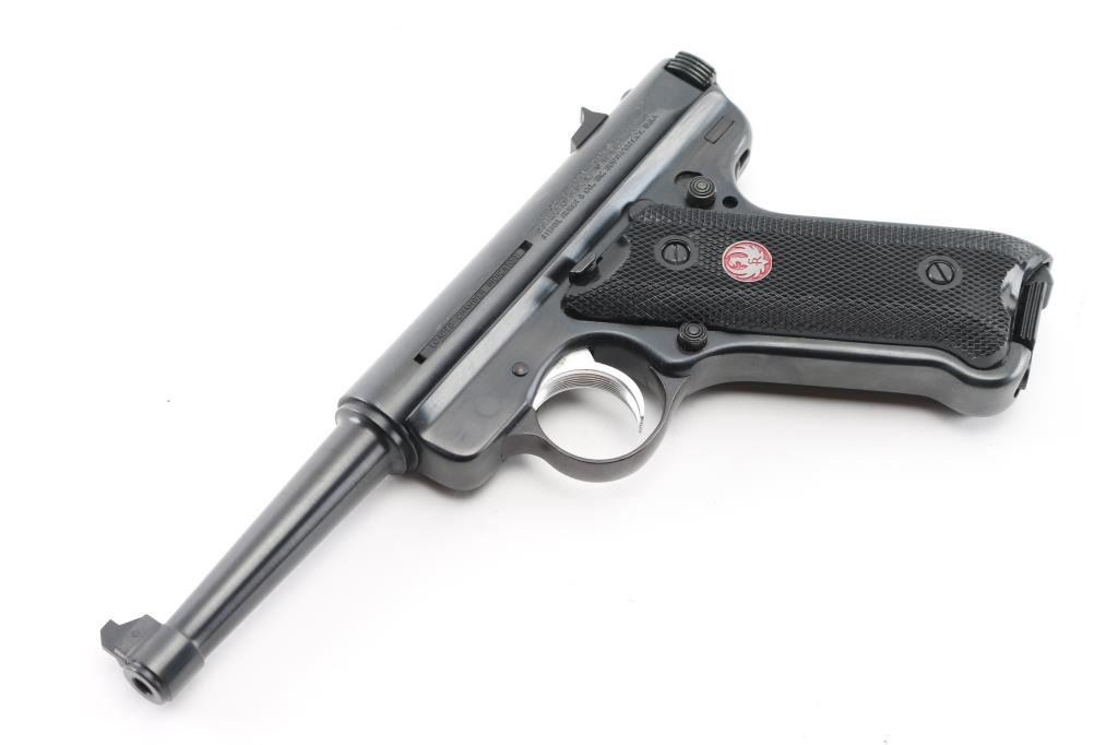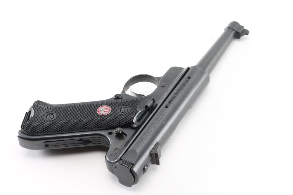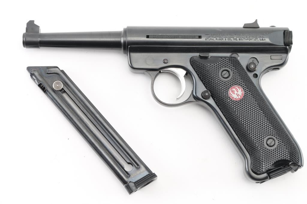 American made single action semi-automatic pistol chambered in .22 Long Rifle, manufactured circa 2008. Features a blued finish, 4 3/4" tapered barrel, patridge front sight, dovetailed rear sight with square notch, serrated wide trigger, manual safety on the left side of the frame, loaded chamber indicator, push button magazine release, two factory 10 round magazines, and two-piece checkered black plastic grips with red/silver Ruger medallions. Includes the original factory hard case, owners manual, lock, and keys. Bore is pristine. Retains 98% finish with handling marks. Condition is NRA Excellent - like new *** Modern Firearm ***