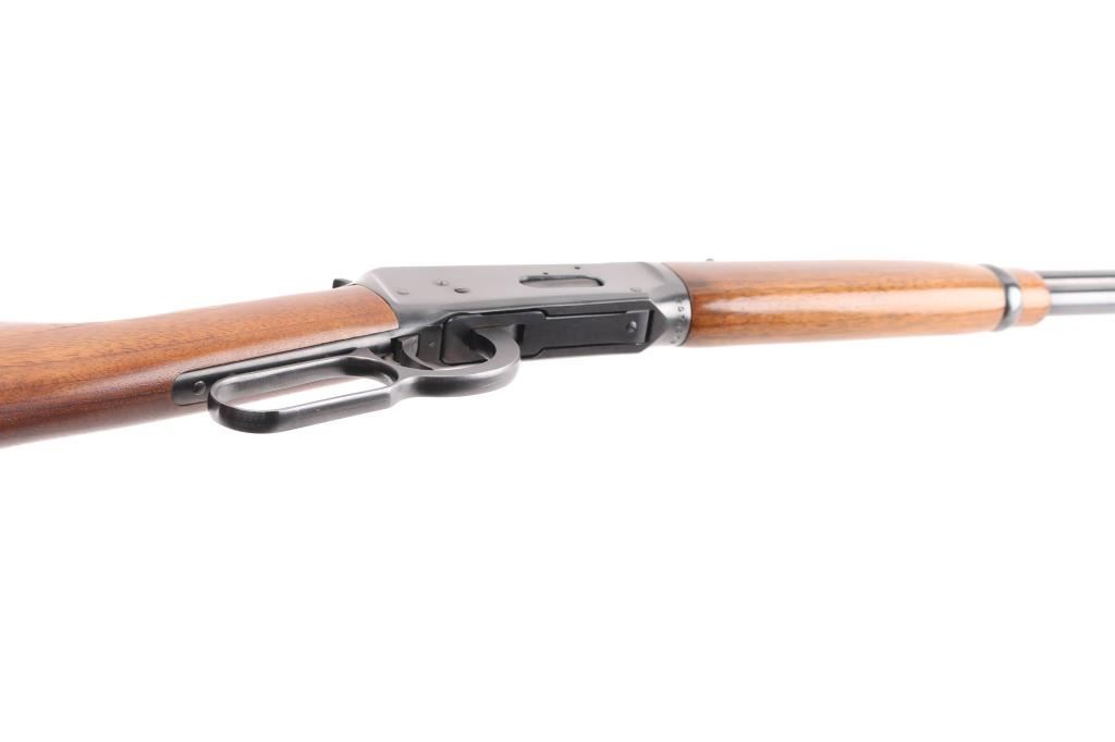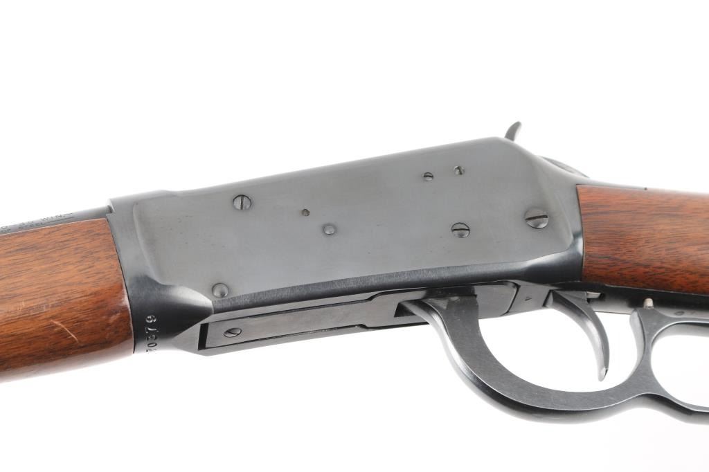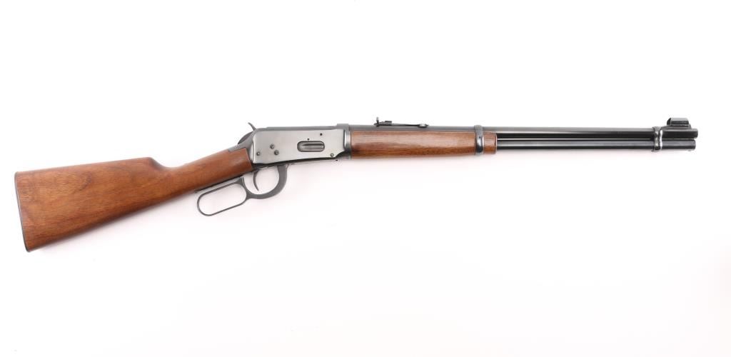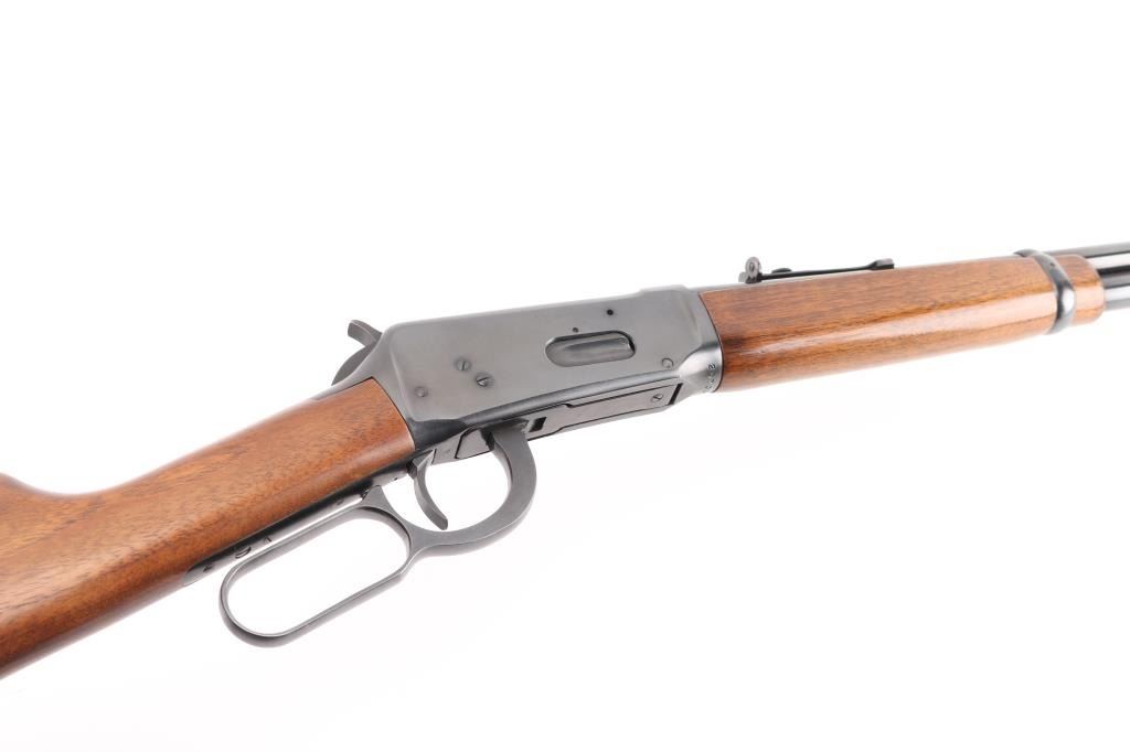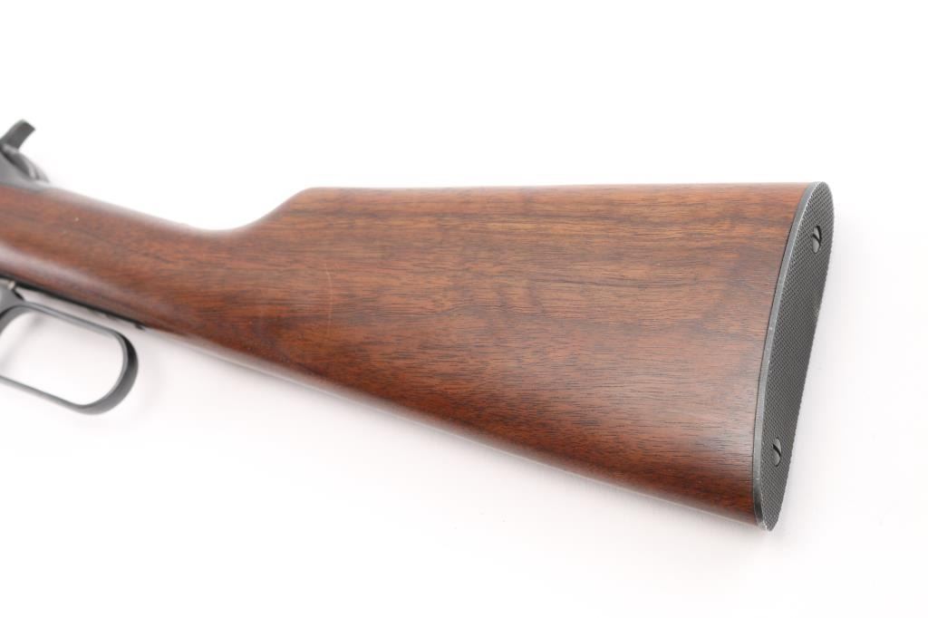 'Pre-64 Eastern Carbine' Lever action repeating rifle manufactured in New Haven, CT circa 1963. Features a blued finish, 20" barrel, full-length tube magazine, hooded ramped blade front sight, sporting adjustable rear sight, smooth trigger, serrated hammer spur, two barrel bands, smooth walnut forend and straight grip shoulder stock with checkered steel buttplate. Bore is very good condition. Retains 98% finish with minor handling marks. A bit of patina on front face of mag cap. Wood is very good condition with few light dents. Condition is near NRA Excellent *** C&R Firearm ***