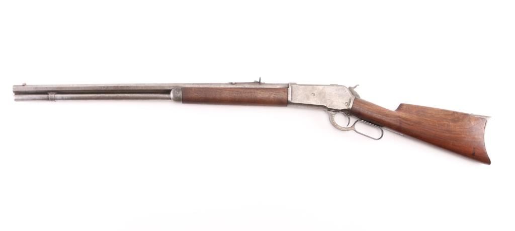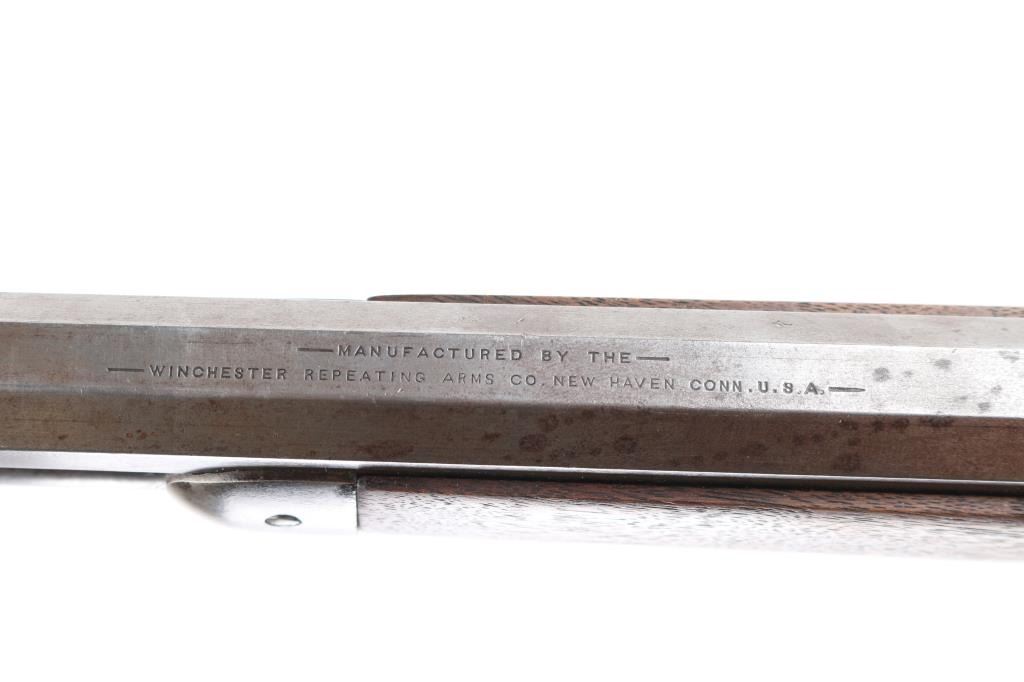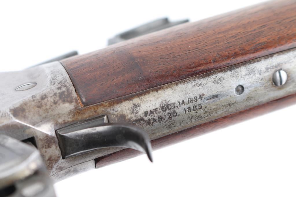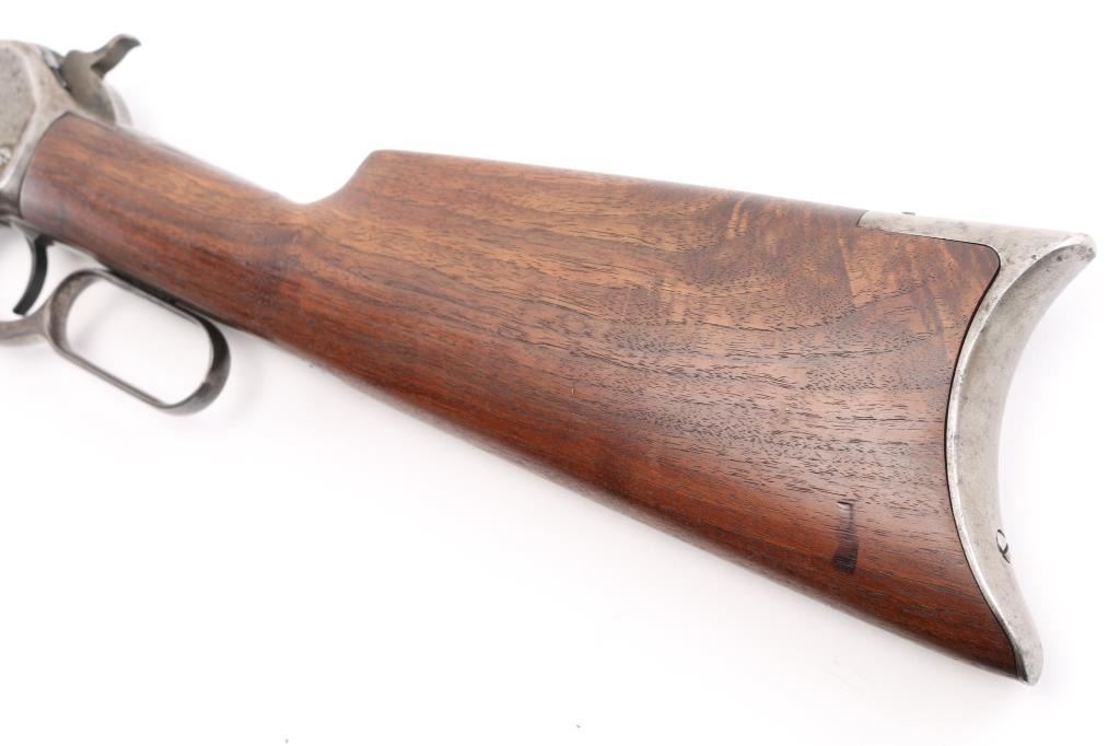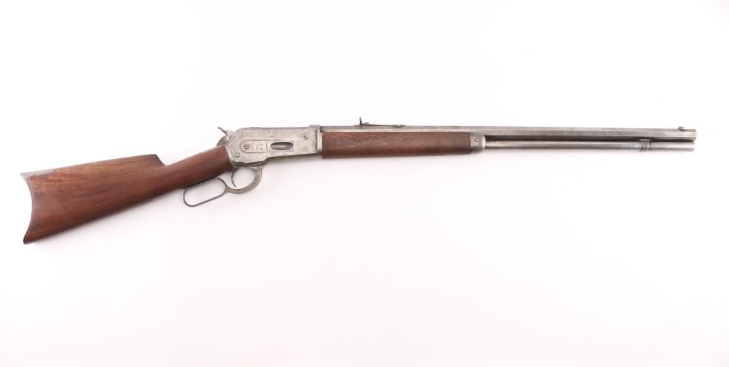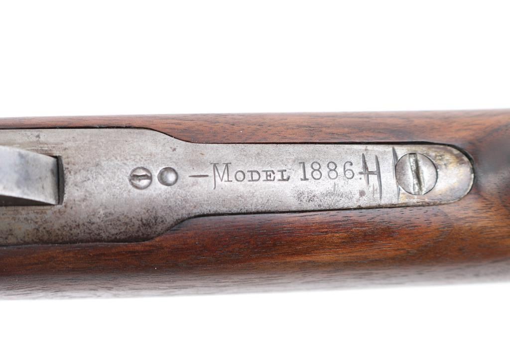 Antique lever action rifle manufactured circa 1887, second year of production. Features 26" octagon barrel, full length magazine tube, blade front sight, sporting rear sight, smooth walnut forend & straight wrist shoulder stock, steel crescent buttplate. Bore is fair to good condition, fairly bright, showing some frosting, a bit dark in grooves, good rifling with a bit of visible erosion to sharp edges. Metal surfaces are generally grayish bright metal, appears cleaned, scattered pin prick pits. Top of bolt retains much original bluing. Few visible shallow dents to mag tube. "IH" scratched in upper tang. Several screw slots show marring. Markings fairly crisp, readable. Wood is very good condition, some minor losses on sharp corners, good fit to metal, nice grain in butt. Action is sound, a little stiff. Condition is NRA Very Good *** Antique Firearm ***
