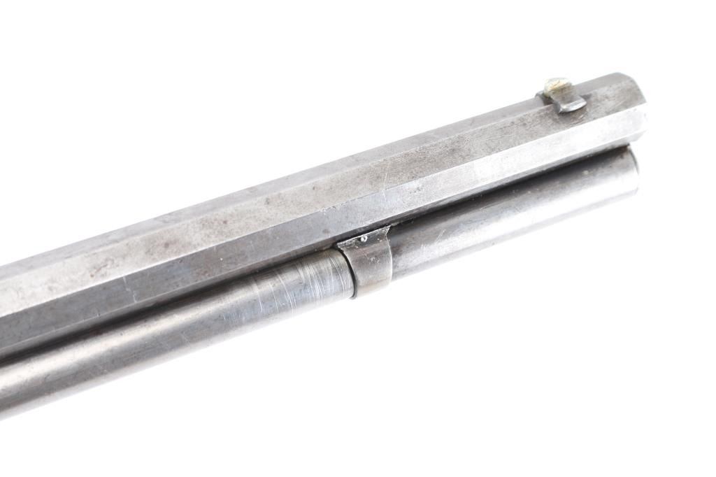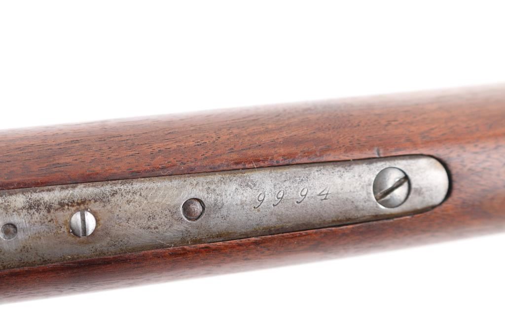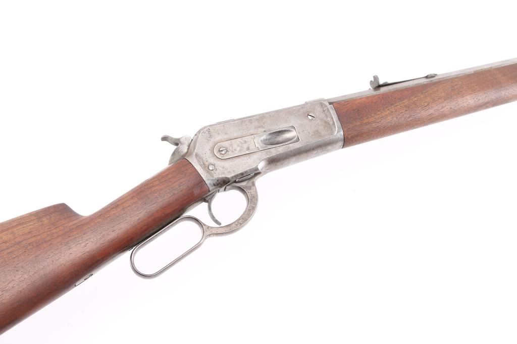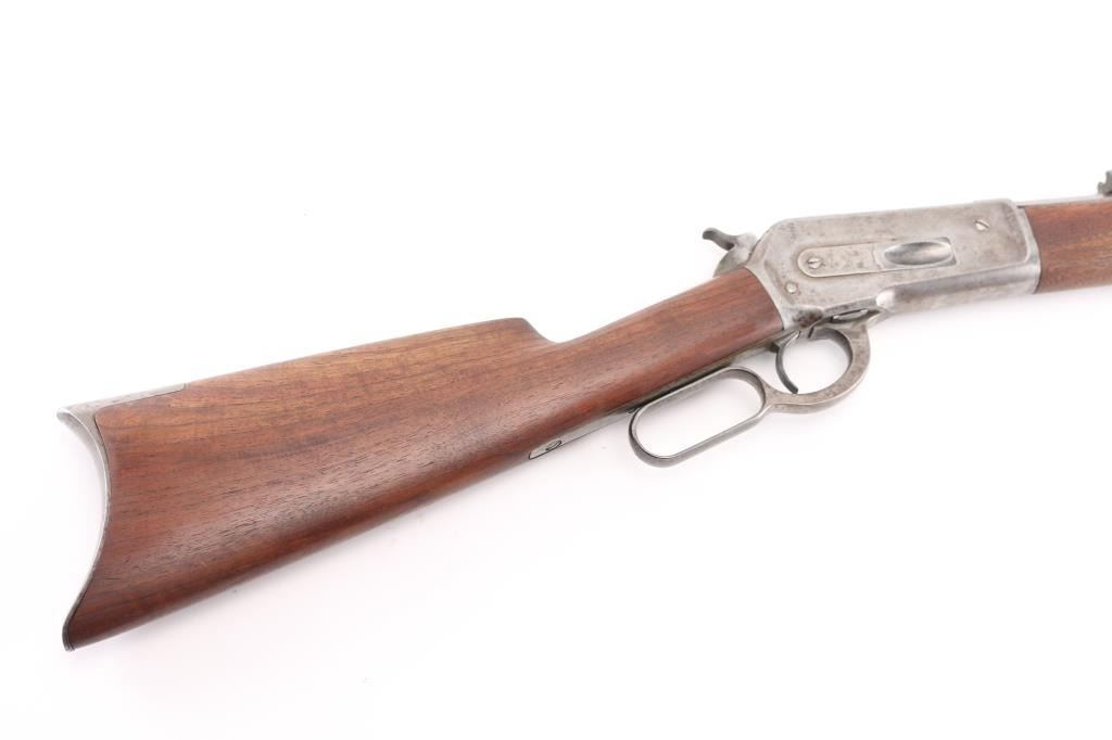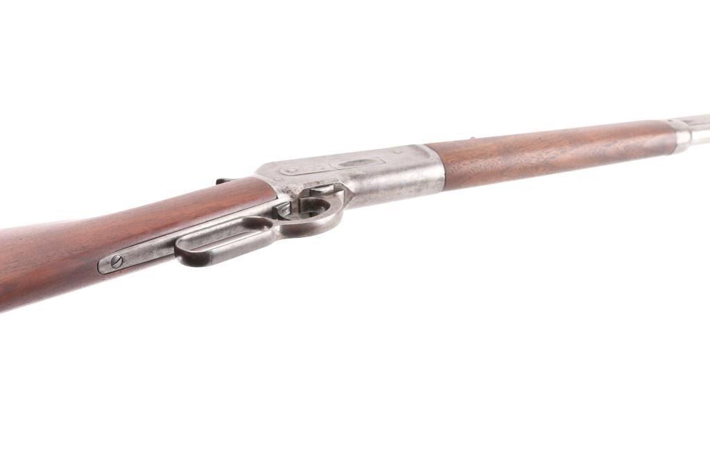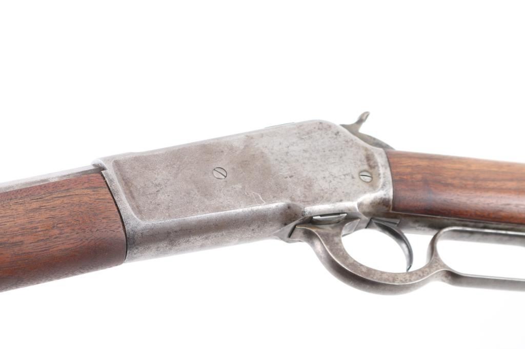 Antique lever action rifle manufactured circa 1887, second year of production. Features 26" octagon barrel, full length magazine tube, blade front sight, sporting rear sight, smooth walnut forend & straight wrist shoulder stock, steel crescent buttplate. Bore is fair to good condition, fairly bright, showing some frosting, a bit dark in grooves, good rifling with a bit of visible erosion to sharp edges. Metal surfaces are generally grayish bright metal, appears cleaned, scattered pin prick pits. Top of bolt retains much original bluing. Few visible shallow dents to mag tube. "IH" scratched in upper tang. Several screw slots show marring. Markings fairly crisp, readable. Wood is very good condition, some minor losses on sharp corners, good fit to metal, nice grain in butt. Action is sound, a little stiff. Condition is NRA Very Good *** Antique Firearm ***