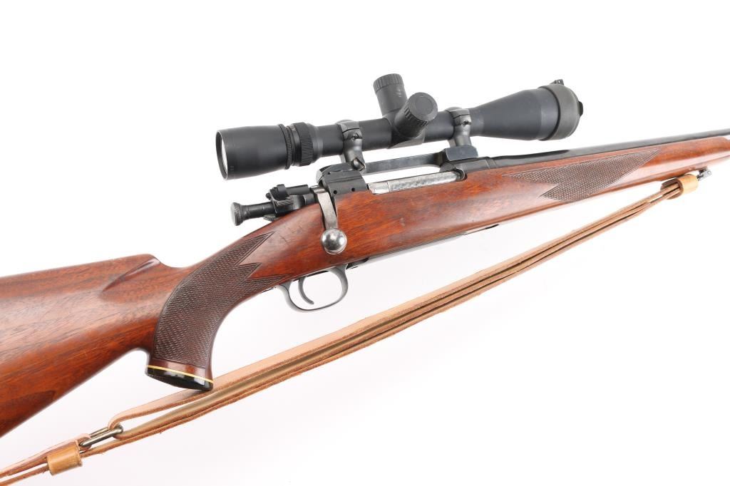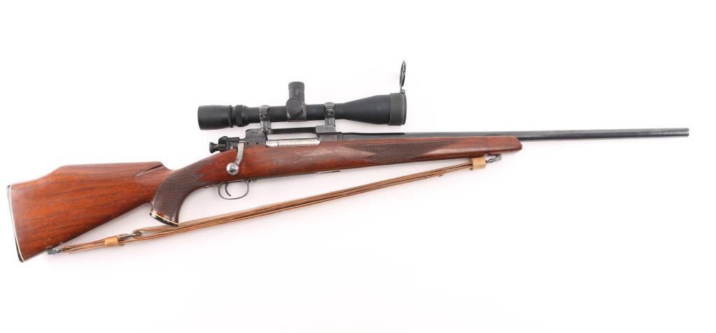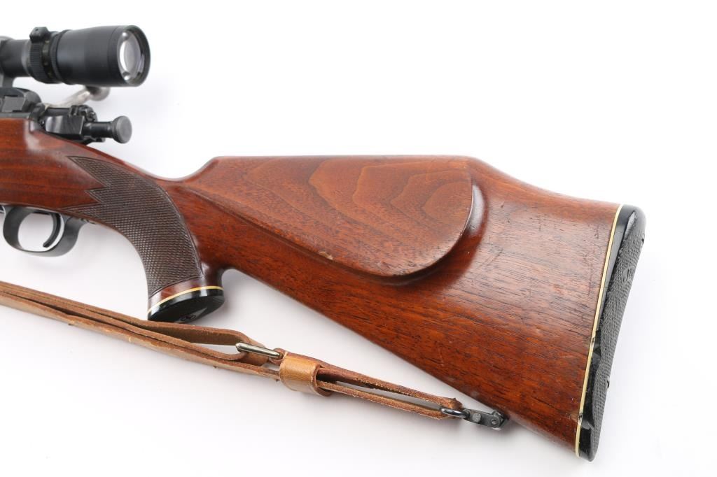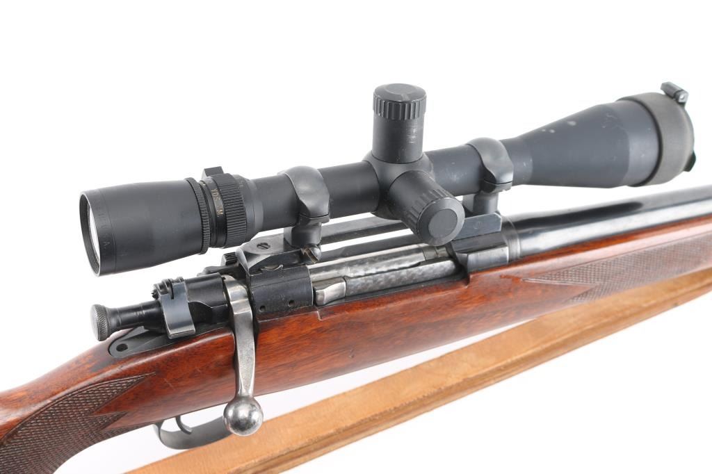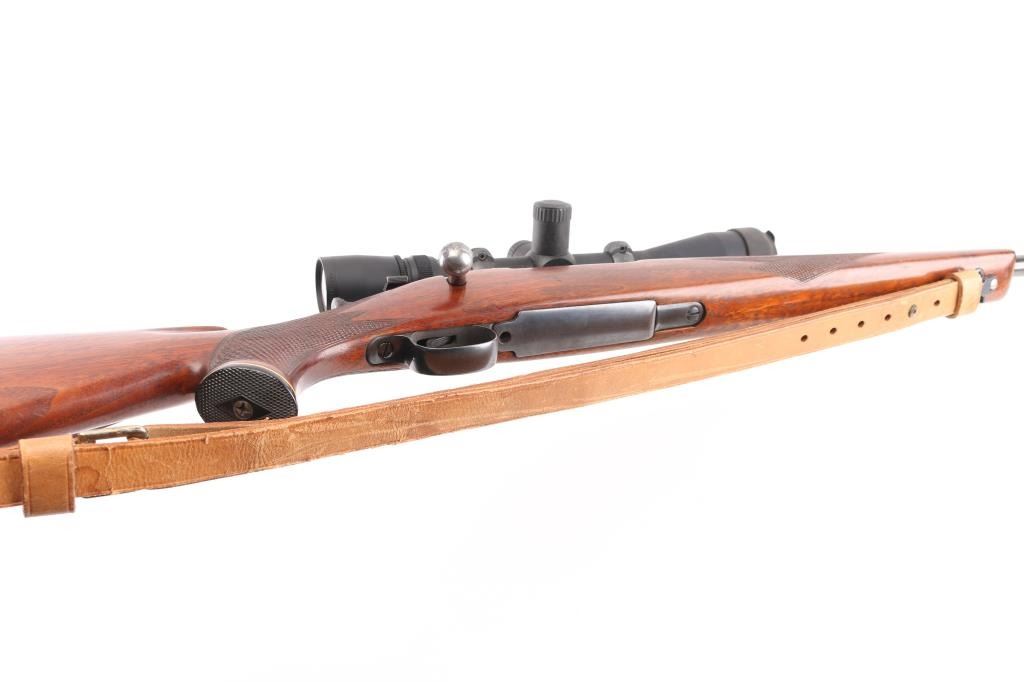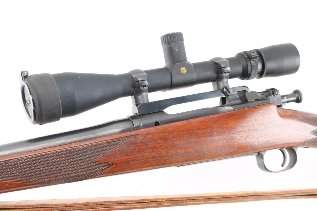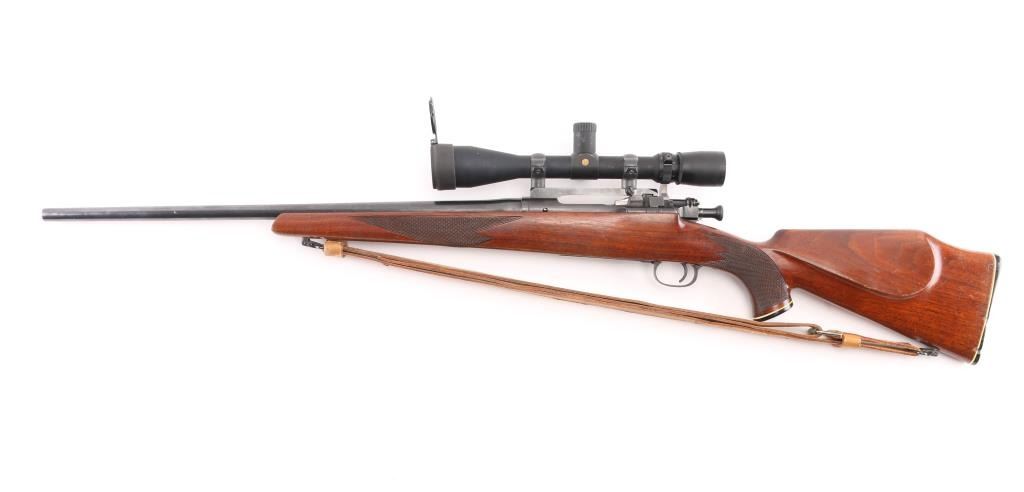 Sporterized bolt action rifle built using a US military model 03A3 rifle, original made circa 1942. Features 23" tapered barrel (appears to be a shortened original military barrel), no sights, Redfield one piece base on receiver mounting a Leupold Vari-X III 3.5-10x scope, bent & swept bolt handle, aftermarket low swing two position safety. Bishop walnut sporter stock features right hand cheek piece, checkered wrist & forend, Bishop plastic buttplate, sling studs. Bore is very good bright condition. Retains 85% coverage of blued finish, with handling marks, scrapes, thinning on bottom metal. Wood is very good condition with dents & some small gouges. Scope is very good overall with clear view. Lifting the bolt while on "safe" moves the safety to "off". Includes good condition tan leather sling. Condition is NRA Very Good as sporterized *** C&R Firearm ***