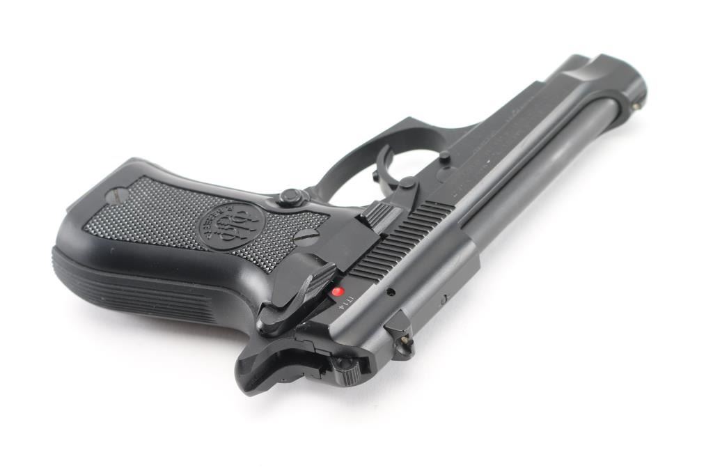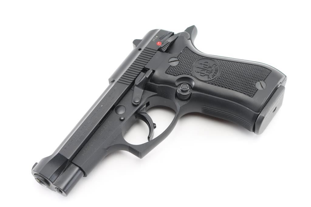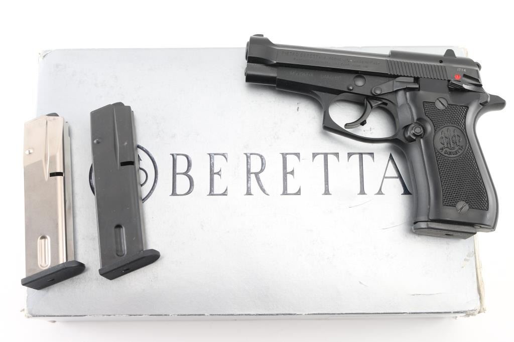 Italian semiautomatic pistol imported by Beretta USA Corp, Accokeek MD. Features matte blued finish, black plastic checkered grips, 3.8" barrel, fixed sights, frame mounted safety/decocker, magazine disconnect safety, operates double and single action. Bore is pristine condition, hard chrome lined. Retains 98% finish on metal parts with few handling marks. Grips are in excellent condition. Includes factory hard plastic case with cardboard sleeve, manual, two spare magazines (total of 2 blued & one nickel finished mags). Condition is NRA Excellent - like new *** Modern Firearm ***