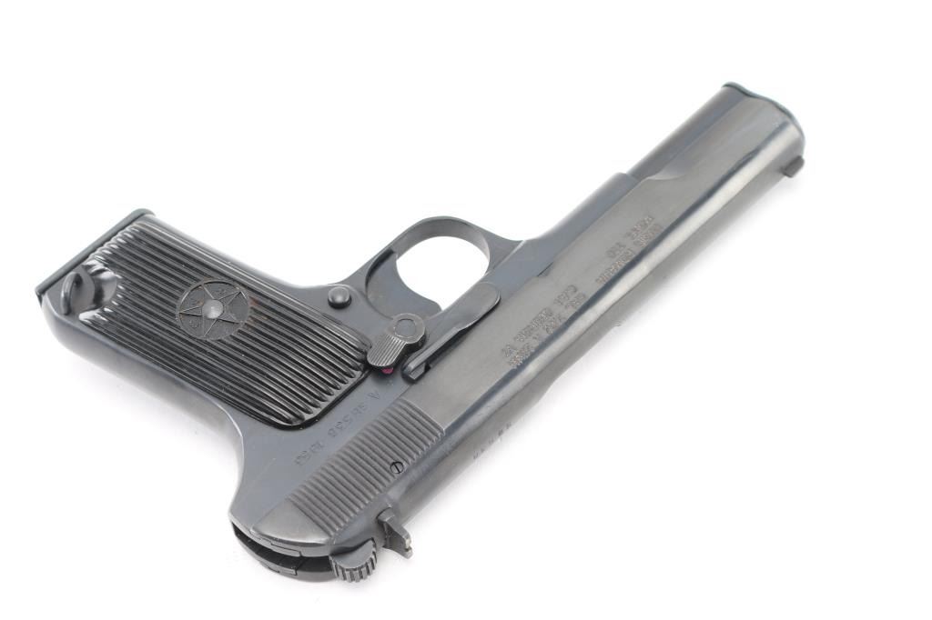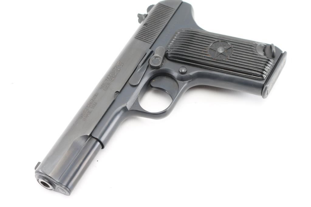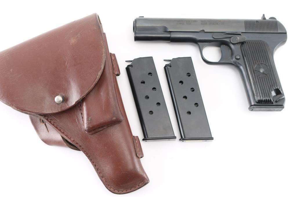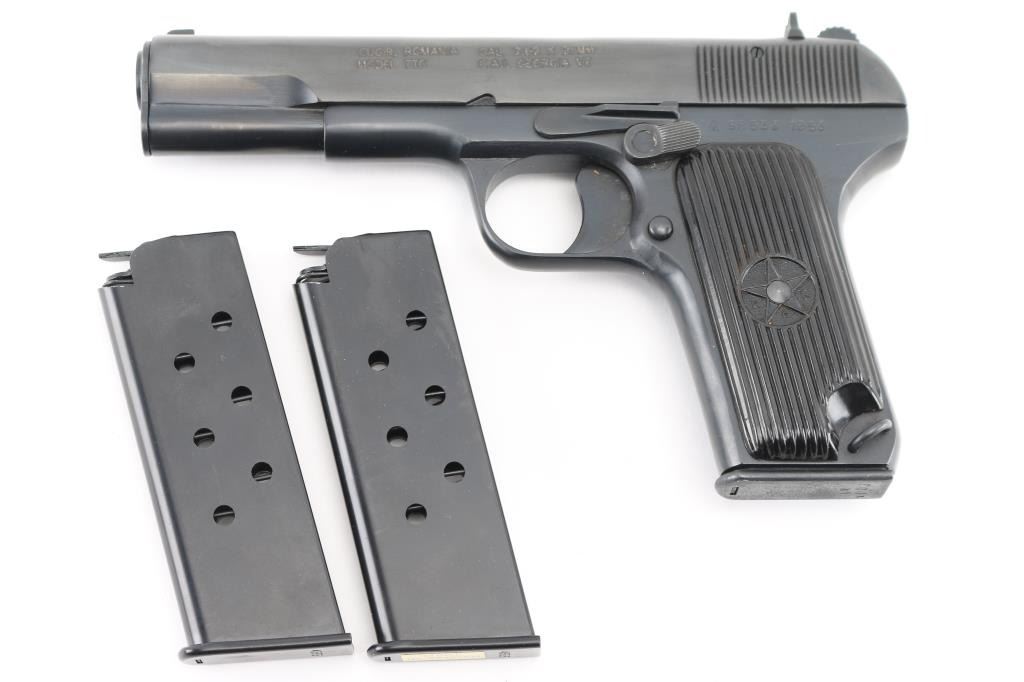 Romanian military semiautomatic pistol, dated 1953, copy of the Russian/Soviet TT-33 Tokarev. Features blued finish, ribbed black polymer "star" emblem grips, 4.4" barrel, fixed front blade & dovetailed rear notch sights, external serrated round hammer, single action trigger, pushbutton magazine release, lanyard loop at left bottom of frame. Modified with a manual safety on the left side of frame for importation. Bore is excellent/bright condition. Retains 98% of finish with two small dents and rub marks on right side of slide. Importer marking on left side of slide. Includes three magazines and brown leather full flap holster in used good condition. Condition is NRA Excellent *** C&R Firearm ***