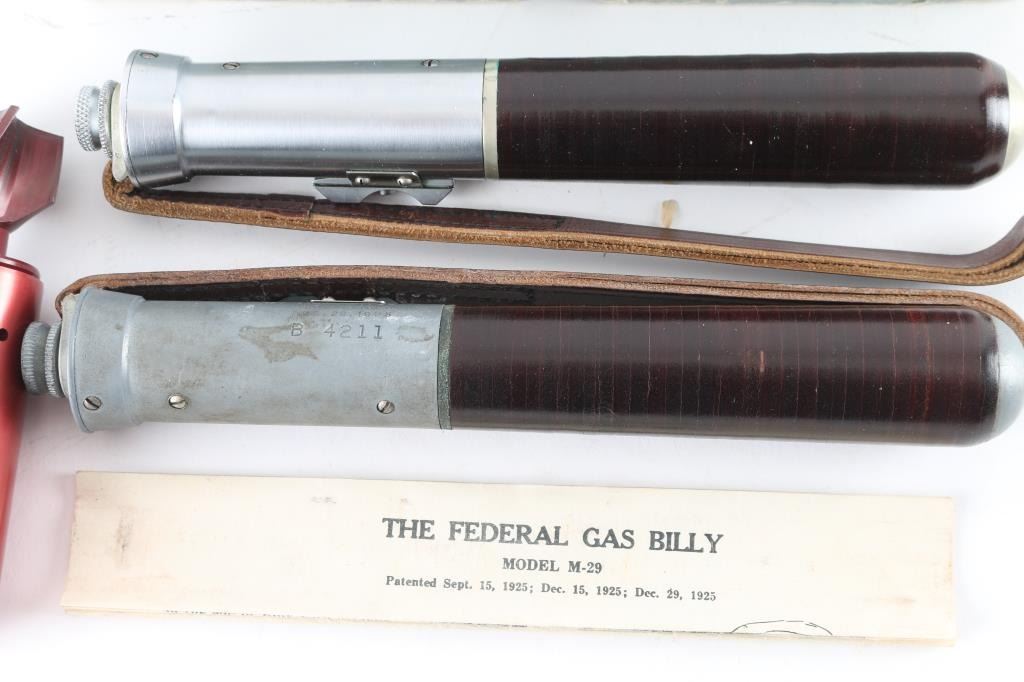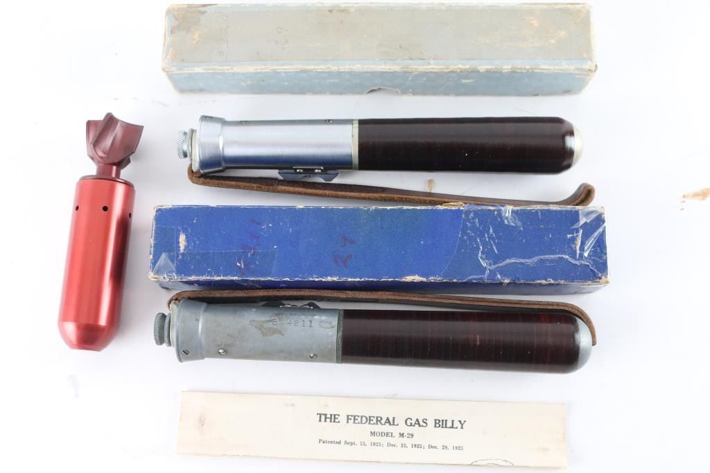 (1) Tear Gas Billy Club, made by Federal Labs, Inc., Model 29, made 1925, serial #3320, leather tassel is attached, measures 9 1/2" with box and instructions. Good condition (2) Tear Gas Billy Club, made by Federal Labs, Inc., Model 29, made in 1925, serial #4211, leather tassel is attached, measures 9 1/2" with box, and instructions. Fair condition. (3) Tear gas dummy shell with fins, measures 5 1/2" long, from 1960s, no box included, in good condition.
