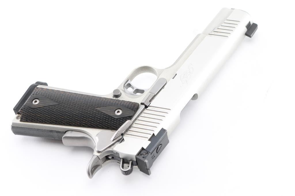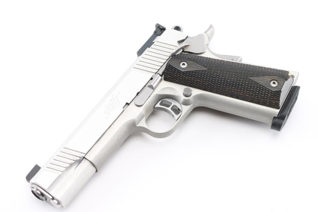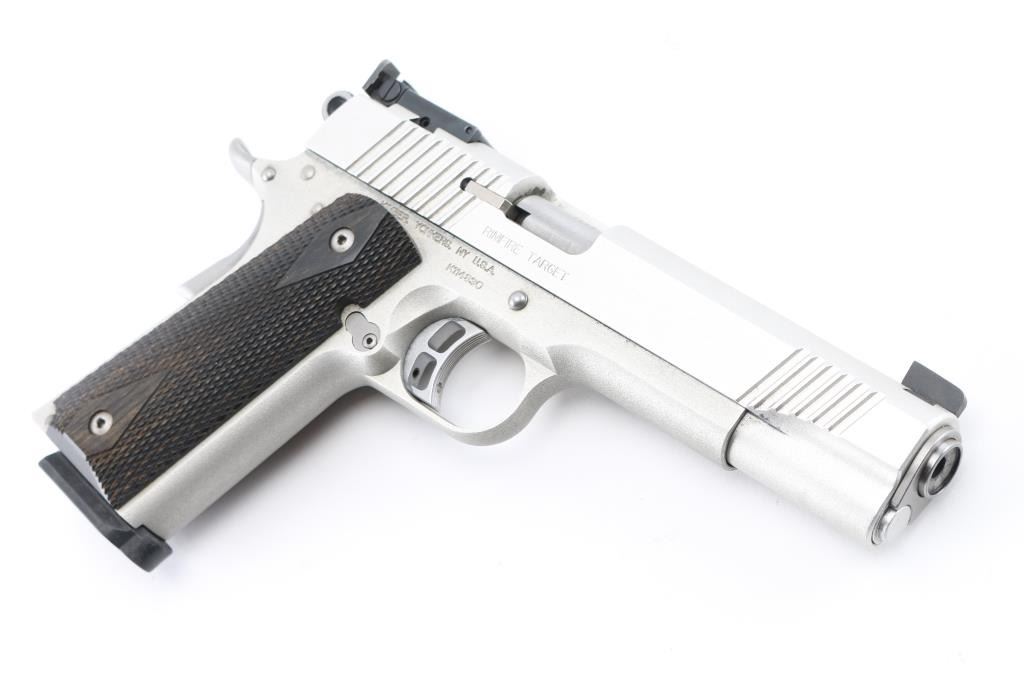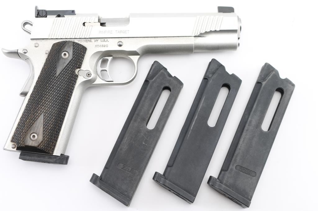 High quality stainless steel 1911A1 platform single action semi-automatic rimfire target pistol chambered in .22 Long Rifle. Features a matte finish, matching color aluminum alloy frame, 5" barrel, dovetailed Partridge front sight, dovetailed adjustable rear sight, fore & aft cocking serrations on the slide, serrated skeletonized trigger with overtravel adjustment, skeletonized hammer, extended thumb safety on the left side of the frame, upswept beavertail grip safety, push button magazine release, checkered flat mainspring housing and two-piece double diamond checkered dark color wood grips. Slide does not lock back on empty magazine. Bore is pristine condition. External appearance is near excellent with few blemishes. Includes a total of four magazines. Condition is near NRA Excellent *** Modern Firearm ***