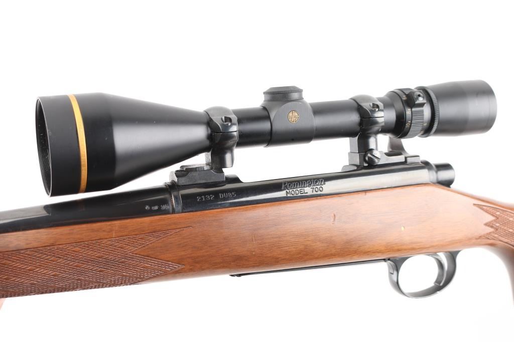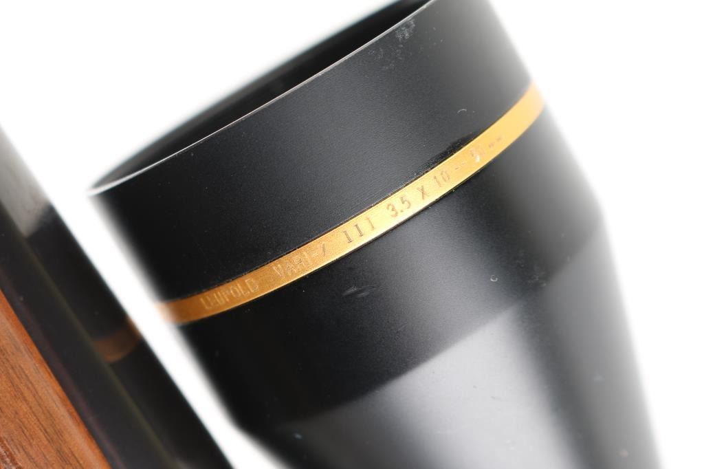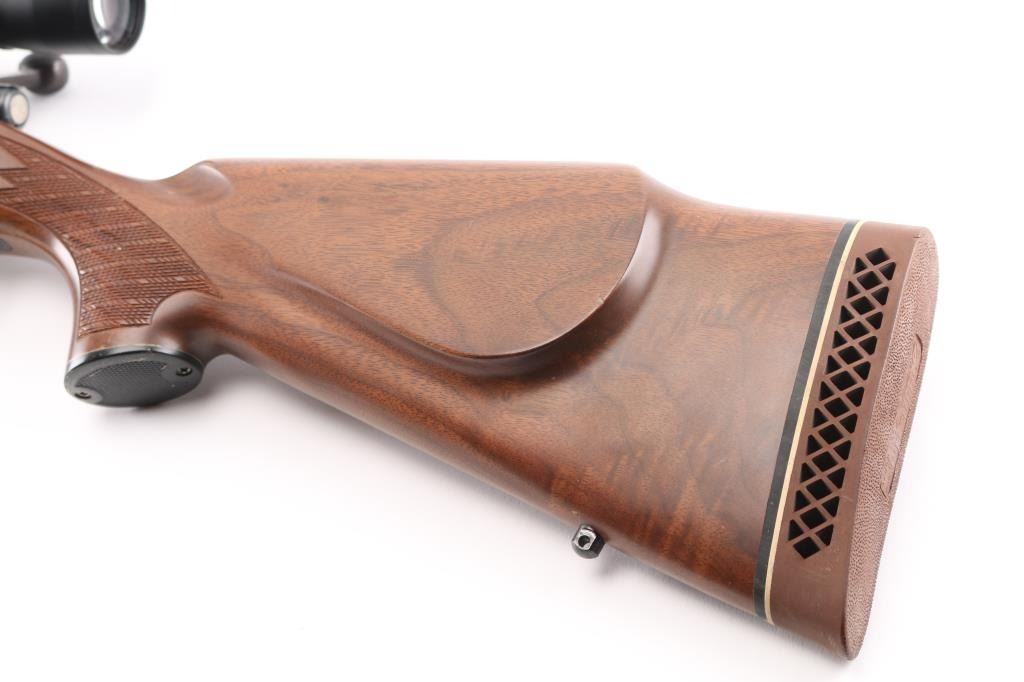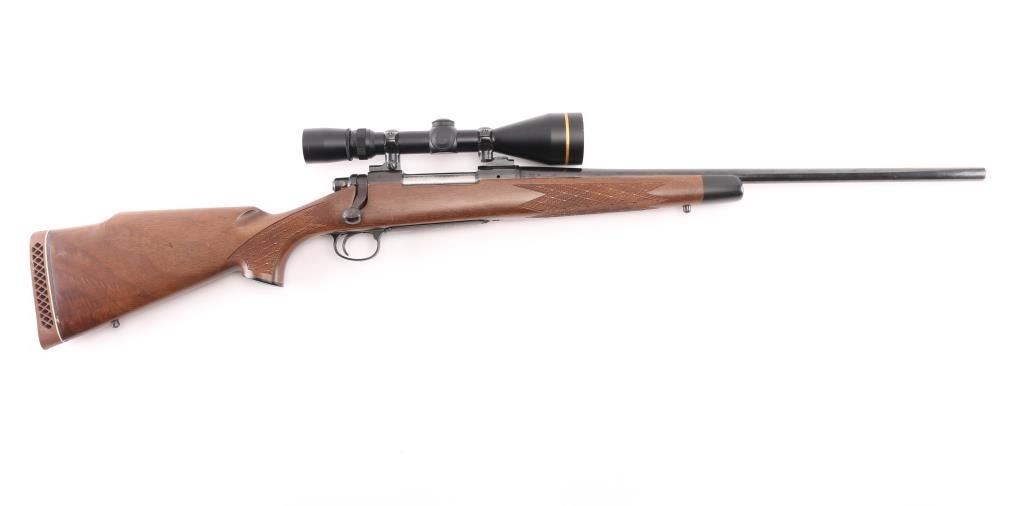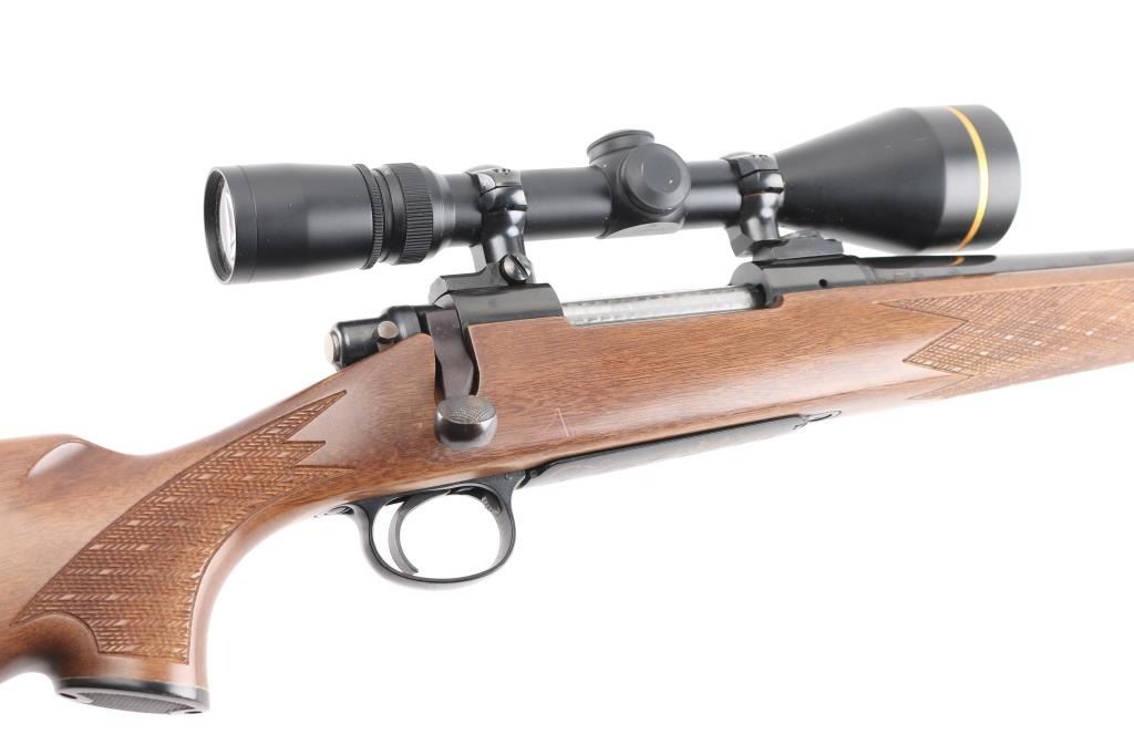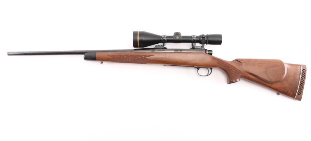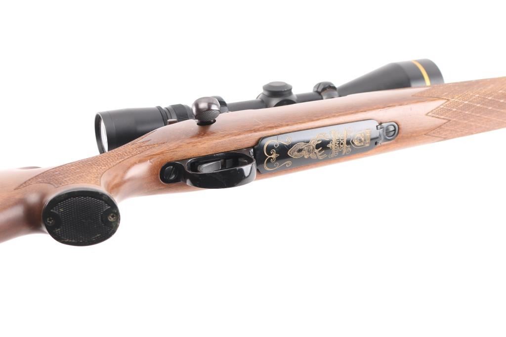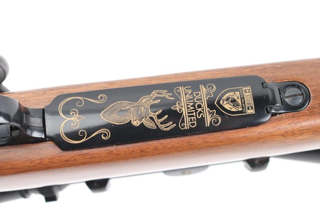 Ducks Unlimited Special Edition bolt action rifle features blued finish, 22" barrel, no sights, two piece Leupold bases & rings with Leupold Vari-X-III 3.5-10x50mm scope with duplex reticle, hinged floorplate, manual safety. Walnut stock has checkered panels at forend and curved wrist, right hand cheek piece, contrasting black forend tip and grip cap, sling studs, ventilated rubber recoil pad. Bore is very good bright condition. Retains 85% finish with some color fading and other blemishes to the bluing, light rust on bolt knob and under barrel at muzzle. Wood is very good condition with small dents, some fiddle grain in butt. Scope is very good condition, clear view. Condition is NRA Good++ *** Modern Firearm ***