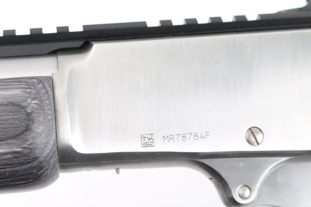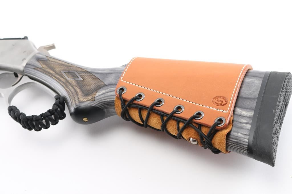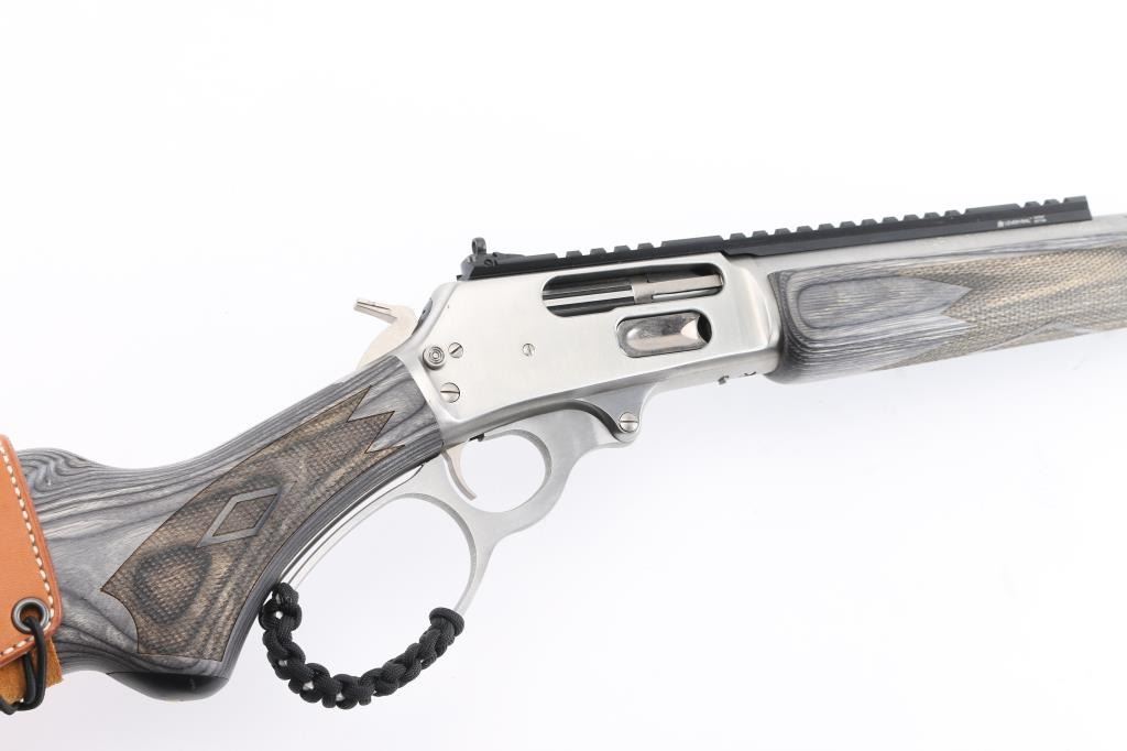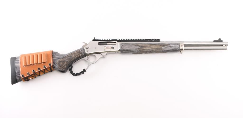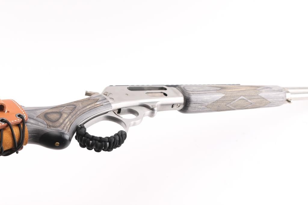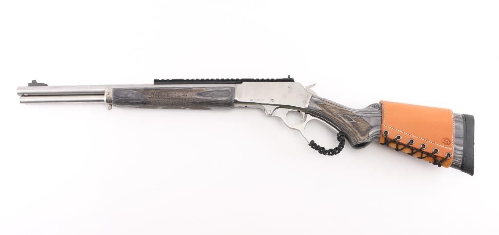 Stainless Steel lever action rifle with Ilion NY barrel address. Features: 18" barrel, blade front sight, Picatinny rail section across top of receiver and rear of barrel with integral peep rear sight, full length magazine tube, push button safety, sling studs. Large loop finger lever has added paracord ladder laced finger protective wrap. Two piece laminate hard wood stocks are checkered, curved wrist, with a solid rubber recoil pad, black plastic grip cap, tan leather lace-up cheek piece and cartridge holder on butt. Bore is pristine. Overall excellent condition with minor handling marks. Condition is NRA Excellent *** Modern Firearm ***