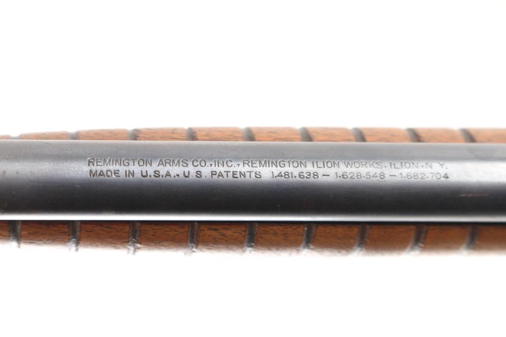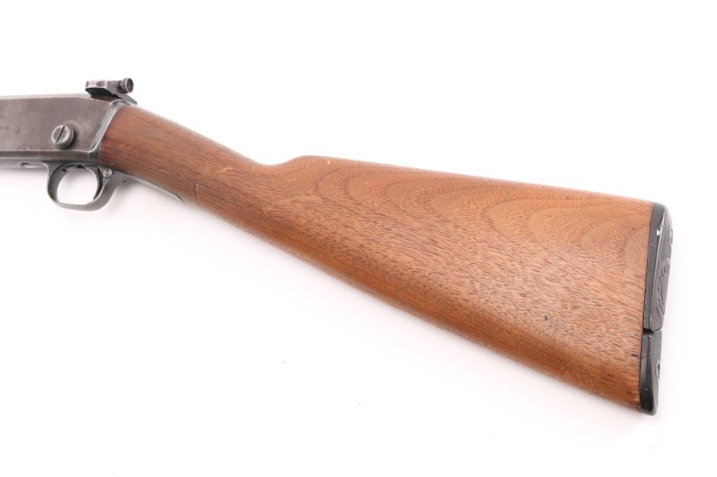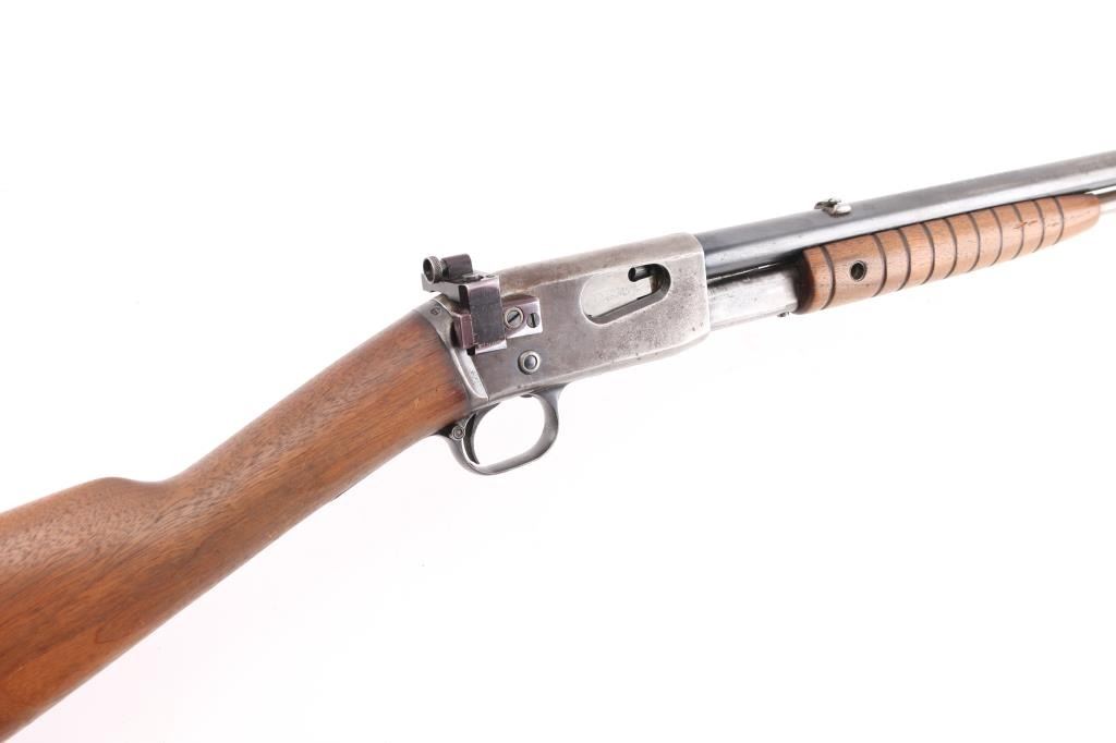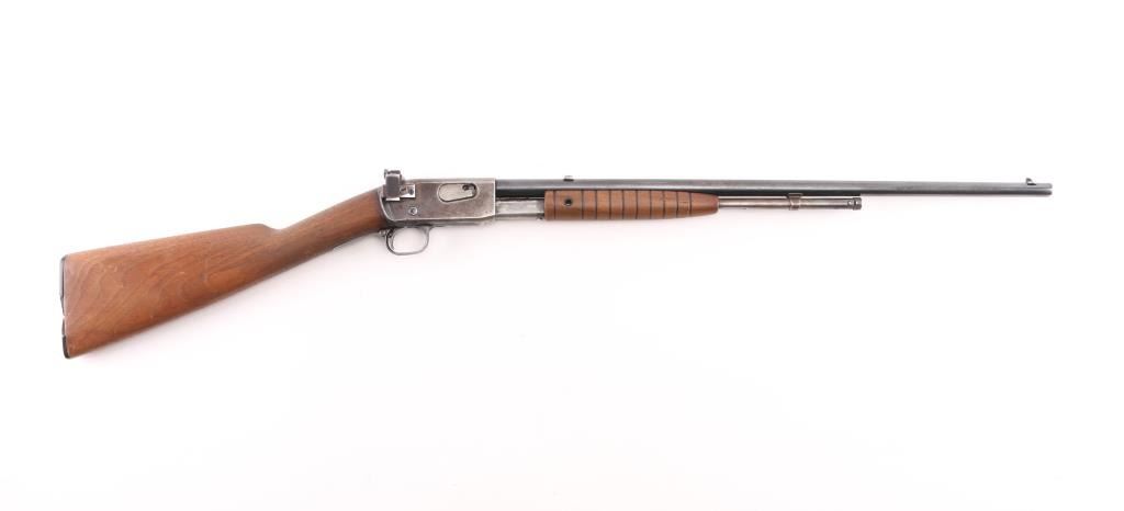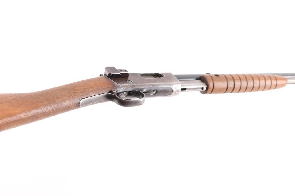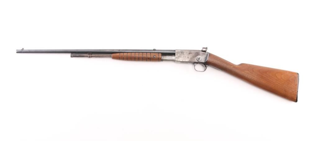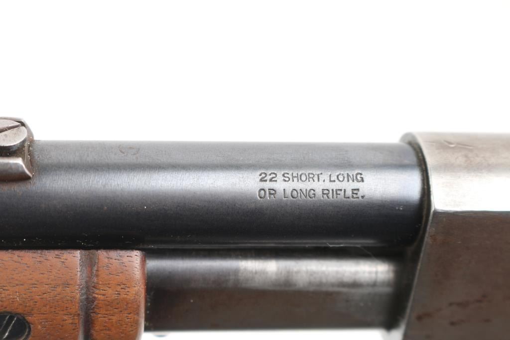 Vintage take-down slide action repeating rifle chambered for .22 Short. Long & Long Rifle, manufactured circa 1910, second year of production. Features a blued finish, 22" barrel, dovetailed blade front sight, mid-barrel rear sight removed, adjustable receiver mounted rear peep sight, 2/3 length tube magazine, smooth trigger, concealed hammer, push button safety, take-down steel receiver, grooved walnut slide handle and smooth straight grip shoulder stock with black hard rubber buttplate. Bore is very good condition. Retains 40% blue, mostly on barrel, fading and losses on receiver & mag tube. Pump handle is good condition, lightly sanded & refinished, missing attachment screw on right side. Stock is good condition, sanded, buttplate is broken and partially missing. Numbers match on receiver & trigger group. Condition is NRA Fair++ *** C&R Firearm ***