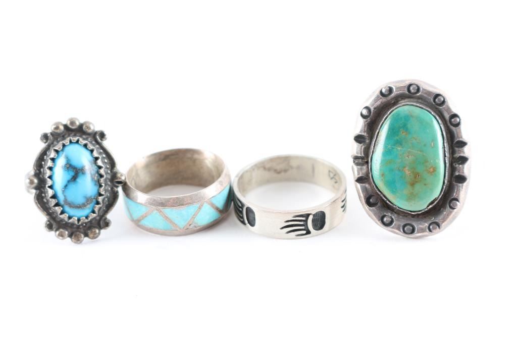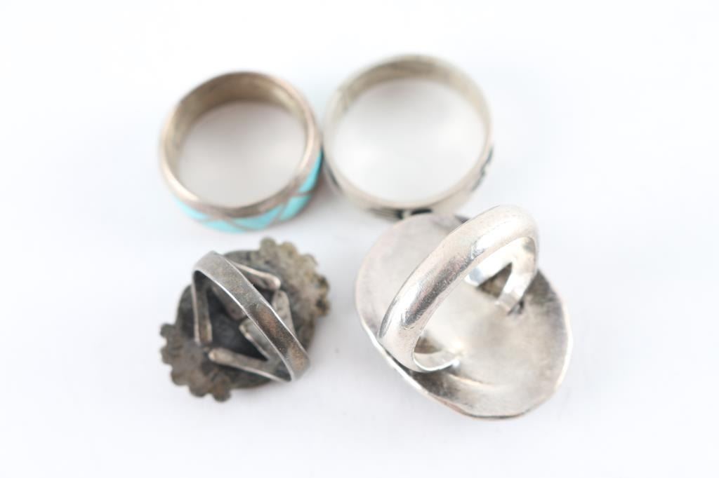 All sterling silver, some accented with turquoise, largest green turquoise ring being size 9 1/2.
