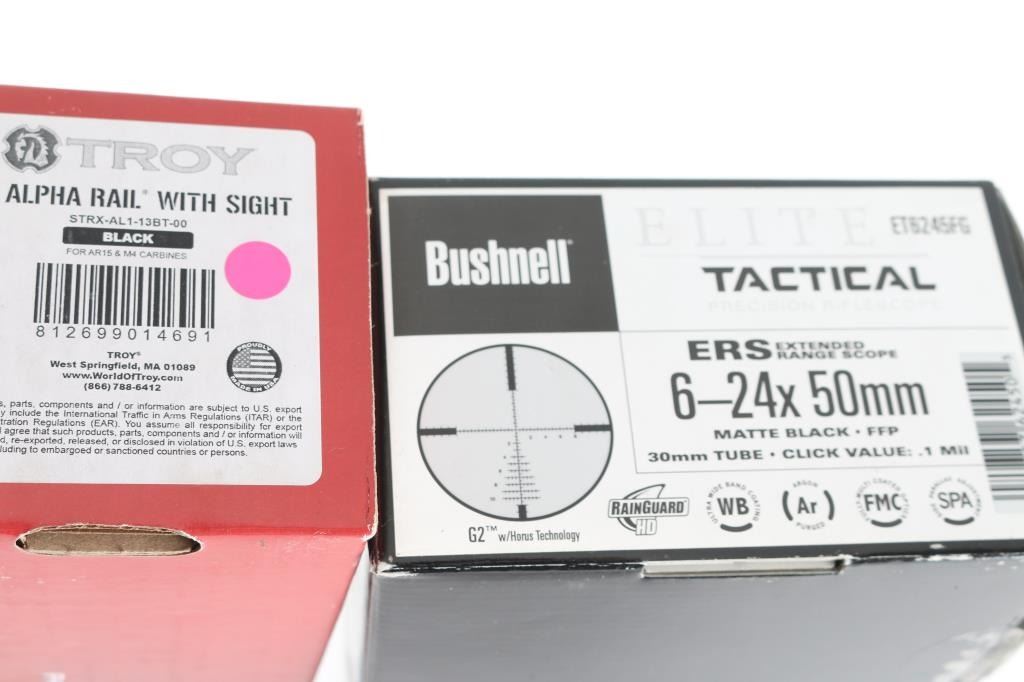 Bushnell Elite Tactical LRS Rifle Scope 30mm Tube 6-24x 50mm Side Focus 1/10 Mil Adjustments First Focal Illuminated BTR-MIL Reticle Matte. New in box Included is a 13" gas system machined aluminum handguard mounts onto your AR-15/M4 and free floats the barrel. Fits all standard size uppers and includes barrel nut, hammer spring, 3 rails with screws, sling swivel features knurled center section for secure grip. Rifle handguard has 8 slots cut in to help improve air flow and help speed cooling. Carbine handguard has 8 longitudinal flutes to save weight. Like new, comes in troy Alpha rail box.