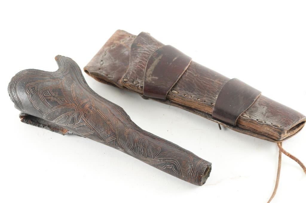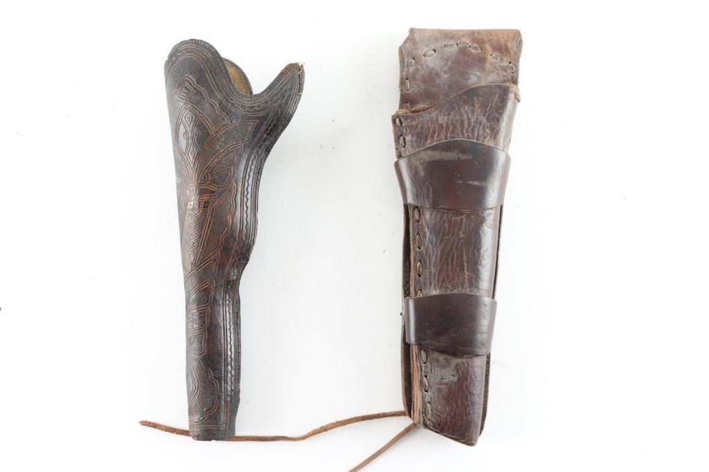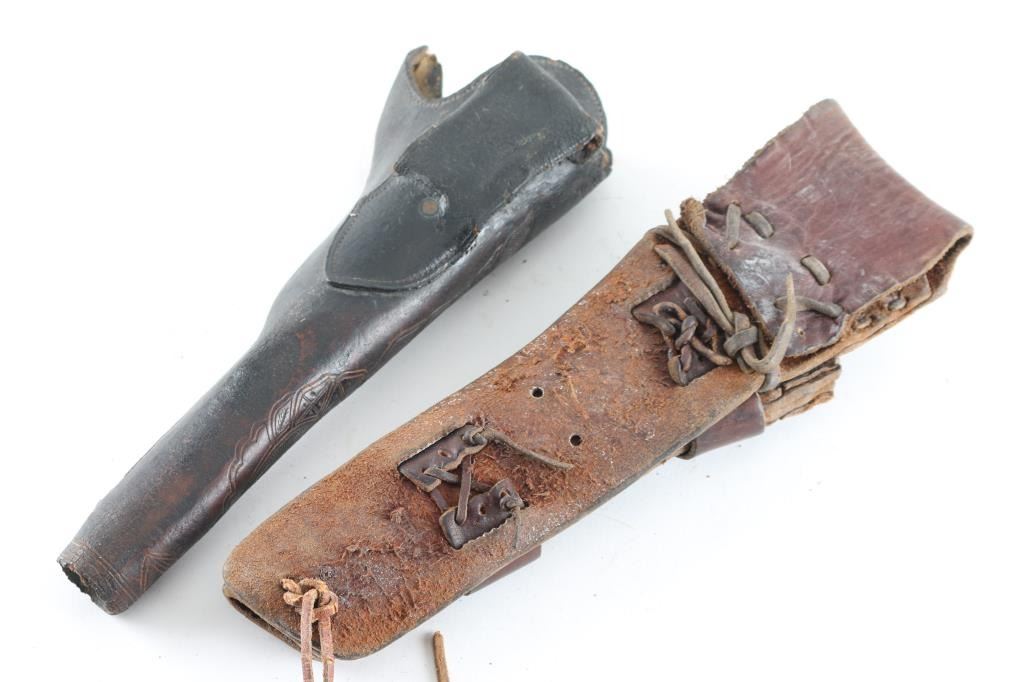 Two Total. 1) Hand carved Slim Jim Holster. Made to fit an small guard 1851 Navy or 1861 Navy Colt or conversion. This early California style holster is the type used during the 1850-60's gold rush era and the earliest style civilian holster patterned after existing military holsters, exposes the grips and allows easy draw. Prior to this, most holsters were worn on saddles and those that were made for the hip used the military type full flap. Given the gun violence in California along its gold fields , this type holster was a favorite during that time. Very few have survived and almost none with the high quality carving to the front of holster, very intricate. Very nice example of these early holsters. The stitching is intact, sound. There is a couple of very minor tears to the belt loop. 2) 19th century brown leather, double loop, hand made holster. Fits the 1851 Navy, and 1860 Army. Complete and intact.