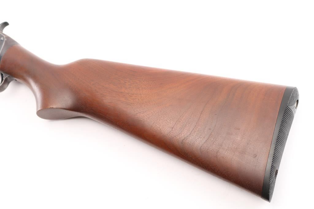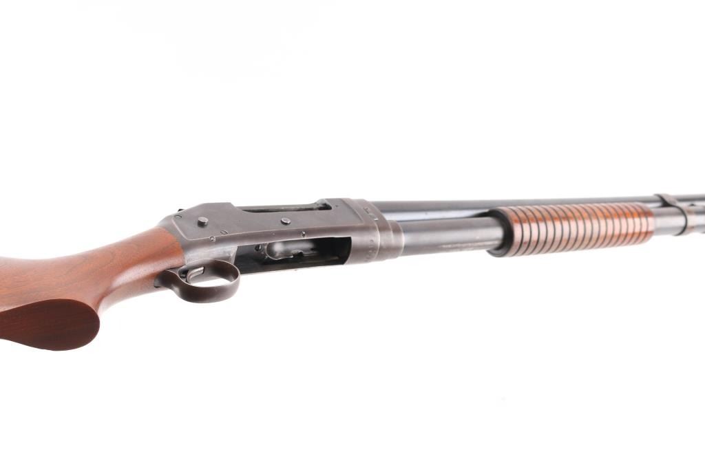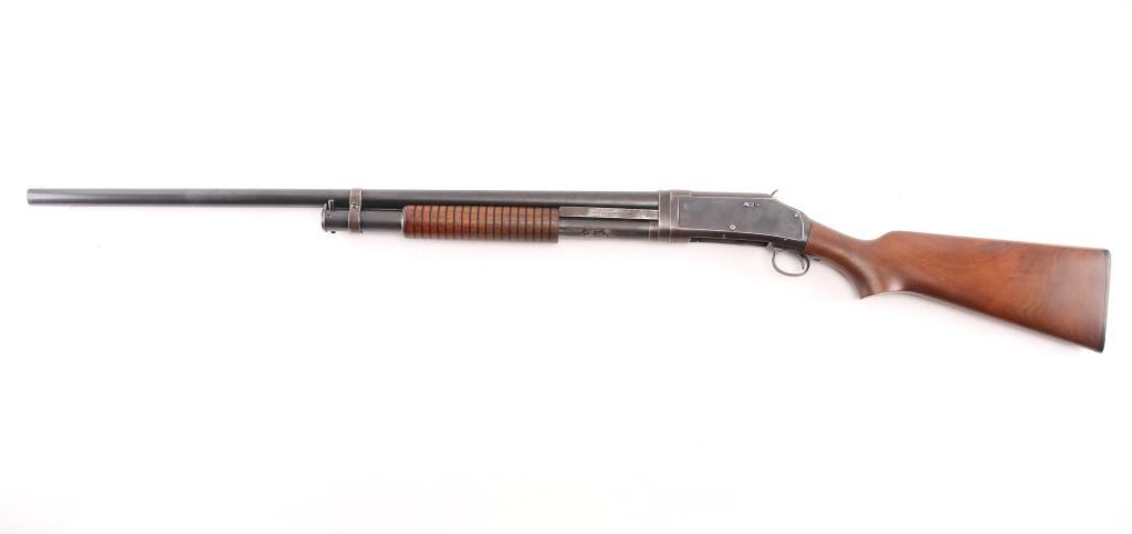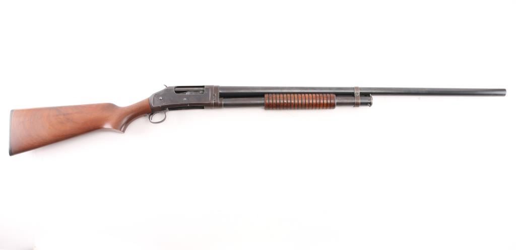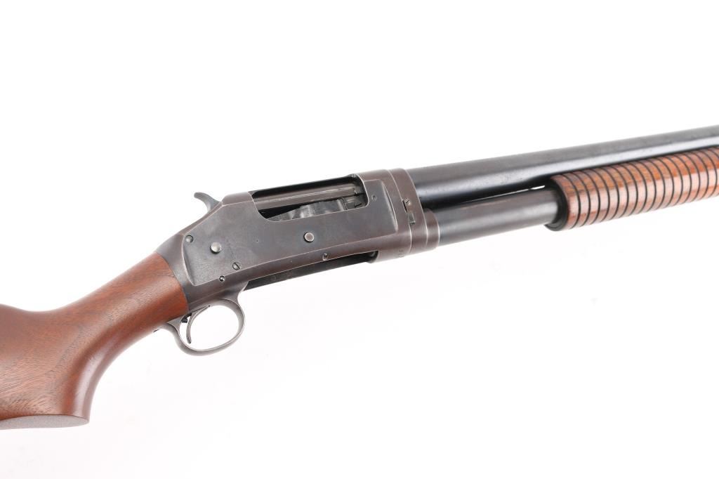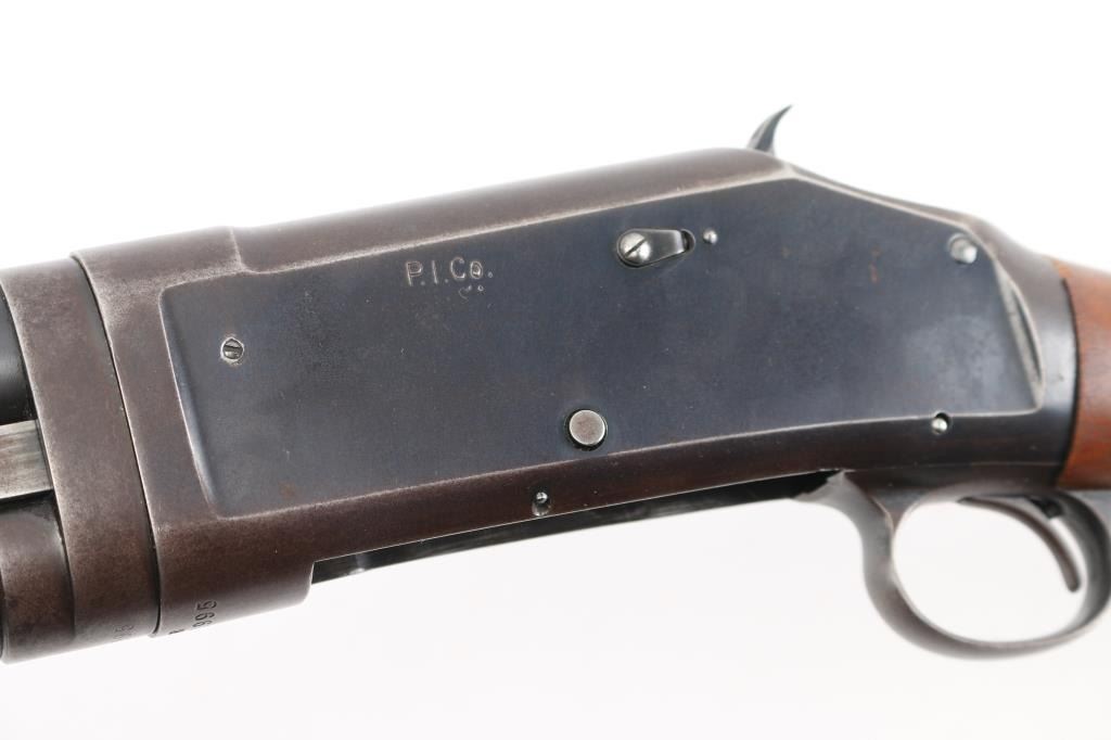 Vintage take down pump action shotgun manufactured circa 1914. Features 30" plain barrel marked FULL choke with a steel front bead, half length magazine tube, smooth wood semi-pistol grip stock & grooved pump handle. (Stock is a newer Fajen replacement) It has a thin smooth trigger and a Fajen black plastic butt plate, exposed hammer.. Bore is excellent/bright, action is crisp/tight, markings are crisp/clear, wood is very good/sound. blue finish is about 70% mostly on the barrel, tube, and bolt, receiver, bottom metal, and lower barrel/tube have turned a brown patina from handling, there are scattered spots of light pin-prick pitting, mostly on the receiver. LOP is 14 1/2". The left receiver is stamped "P.I. Co". (?) NRA Condition-Good. C&R Firearm.