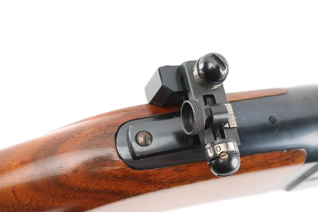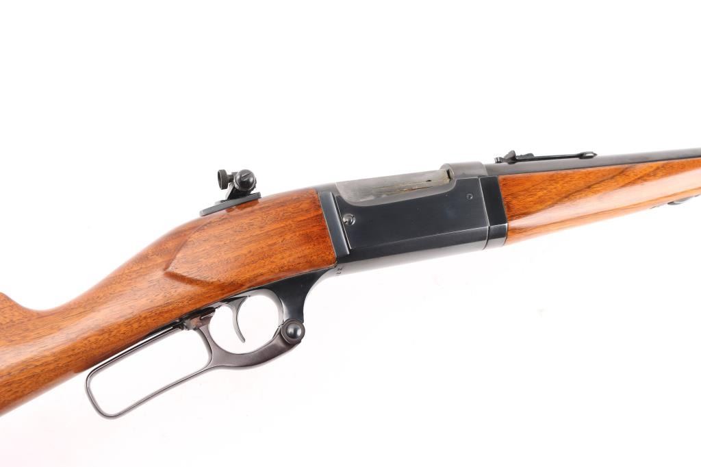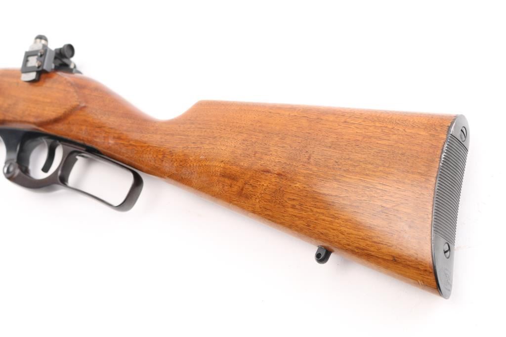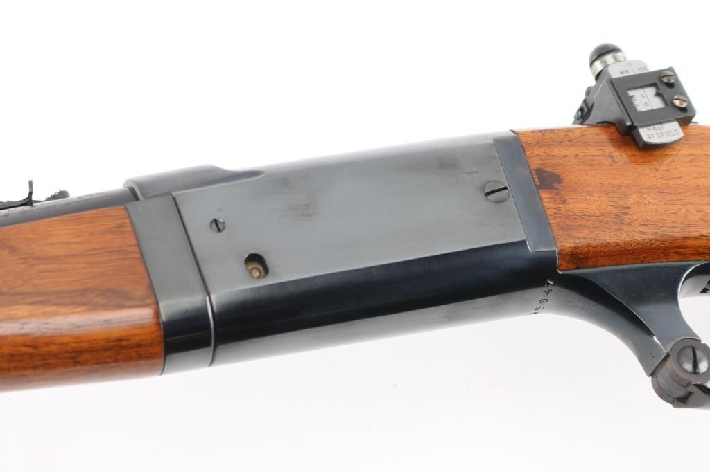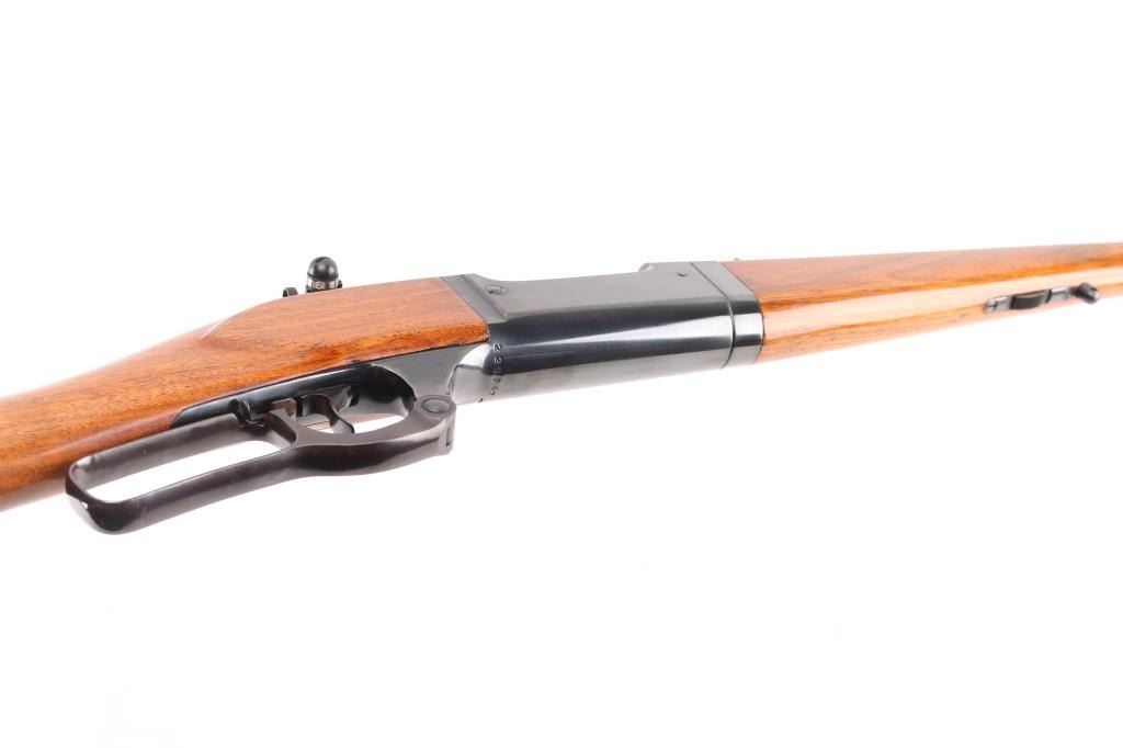 Restored vintage lever action rifle manufactured circa 1920. Barrel marked with Utica, New York address. Features reblued finish, serrated trigger, two piece wood stock with curved grip, schnabel forend, serrated steel butt plate, 24" barrel, German silver blade front sight, rear sporting sight, Redfield adjustable peep sight installed on the tang, take-down lever on the forearm, fixed rotary magazine with brass cartridge counter,cocking indicator. Bore is excellent/bright. Retains 98% reblue, with minor edge wear/scratches. Wood has a gloss refinish and is near excellent with minor scratches/dings. Action is smooth. NRA Condition-Excellent as Restored. C&R Firearm.