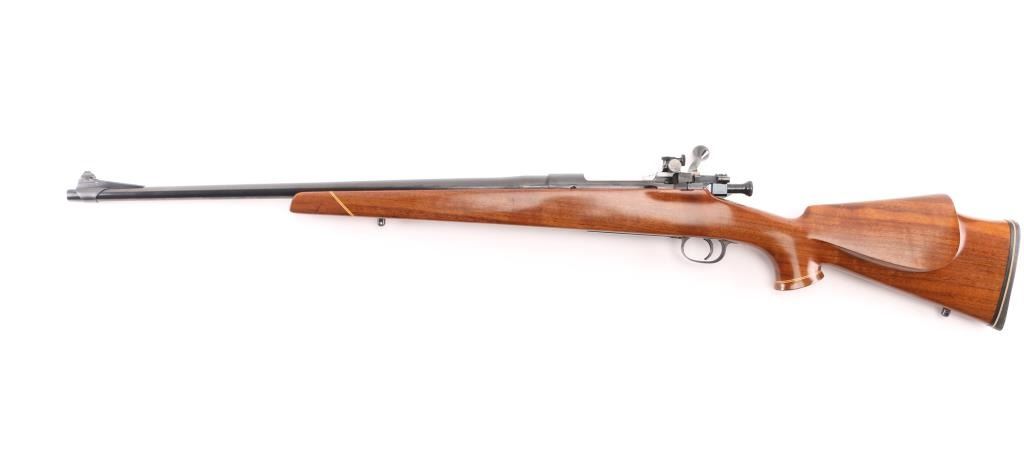 SN: 3626710. Sporterized US Military bolt action rifle features 22" shortened barrel, Raised Lyman blade/brass bead front sight, receiver mounted adjustable Lyman peep sight,chrome bolt, & bent bolt handle, manual safety, nice high-polish reblued finish, nice Monte-Carlo style stock with shadow line cheek piece, contrasting grip cap, and fore end, solid rubber recoil pad, sling swivel studs. Bore is excellent/bright. Blue is 99%. Wood is excellent. A really nice job. NRA Condition-Excellent as Restored. C&R Firearm.