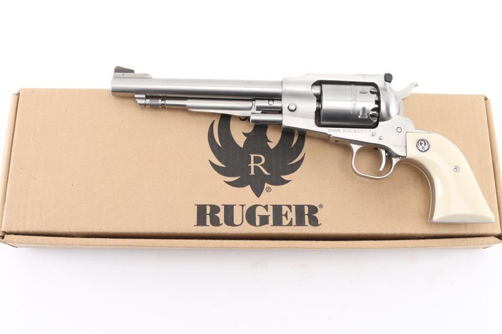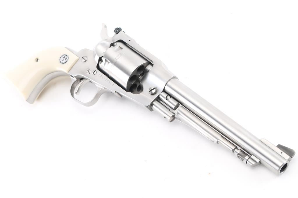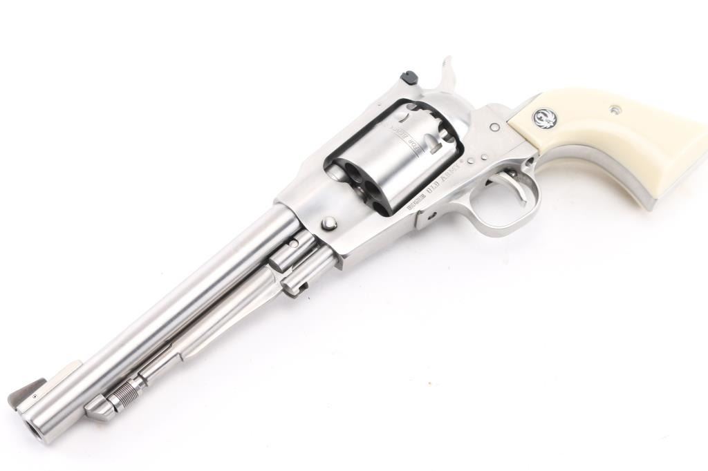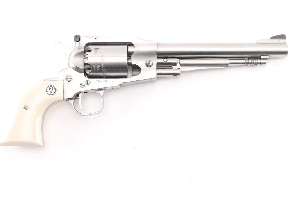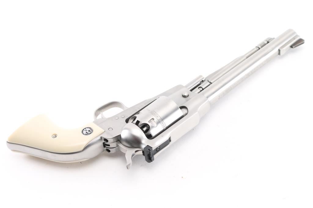 Single action black powder percussion revolver, manufactured circa 1994. Features stainless steel construction, 7.5" barrel, loading lever, raised serrated ramp front sight, adjustable rear sight, smooth trigger, serrated hammer spur, non-fluted cylinder with safety stops, three-screw steel frame, two-piece smooth faux ivory polymer grips with Ruger medallions. Bore and charge holes are pristine, appear unfired. External appearance is like new with few handling marks. Action is smooth with tight lock-up. Includes factory plain brown cardboard box, extra set of nipples. Condition is NRA Excellent - like new *** "Antique" Firearm ***