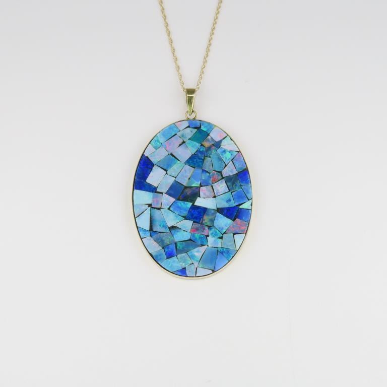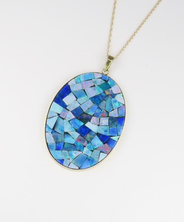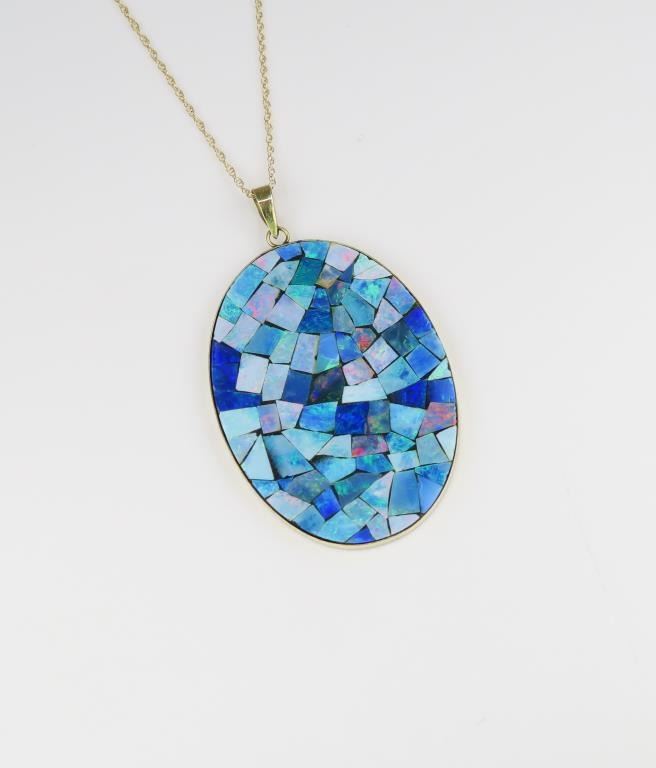 featuring highly detailed oval shaped Mosaic design set with multi-colored Opal inlay set in 1.5” x 1.00” 14 karat yellow gold pendant.