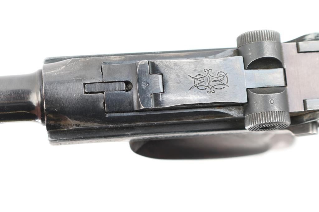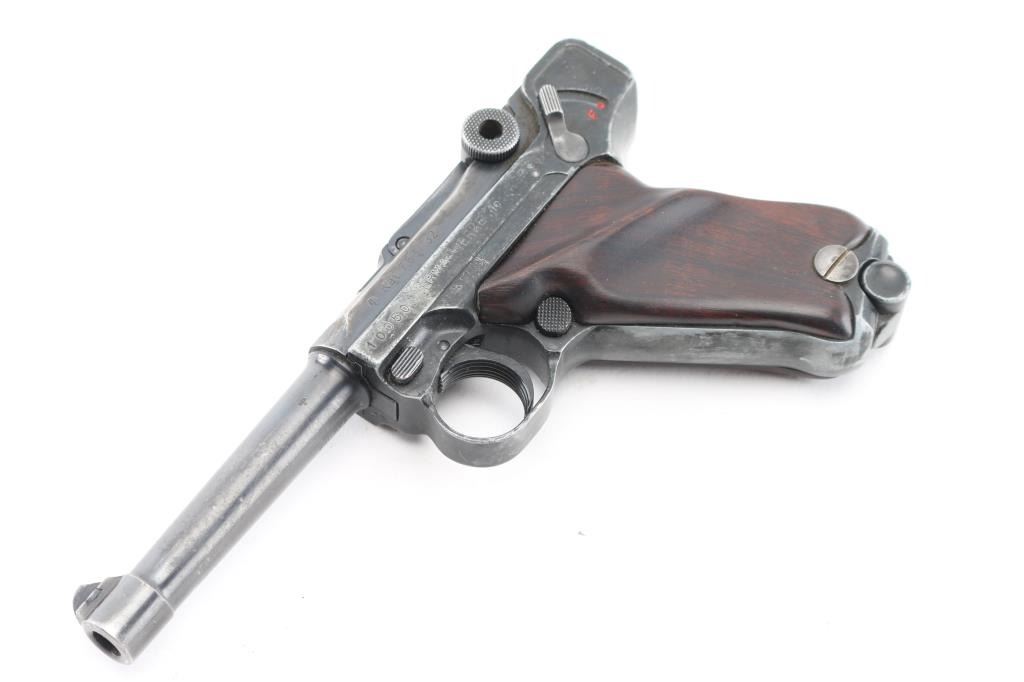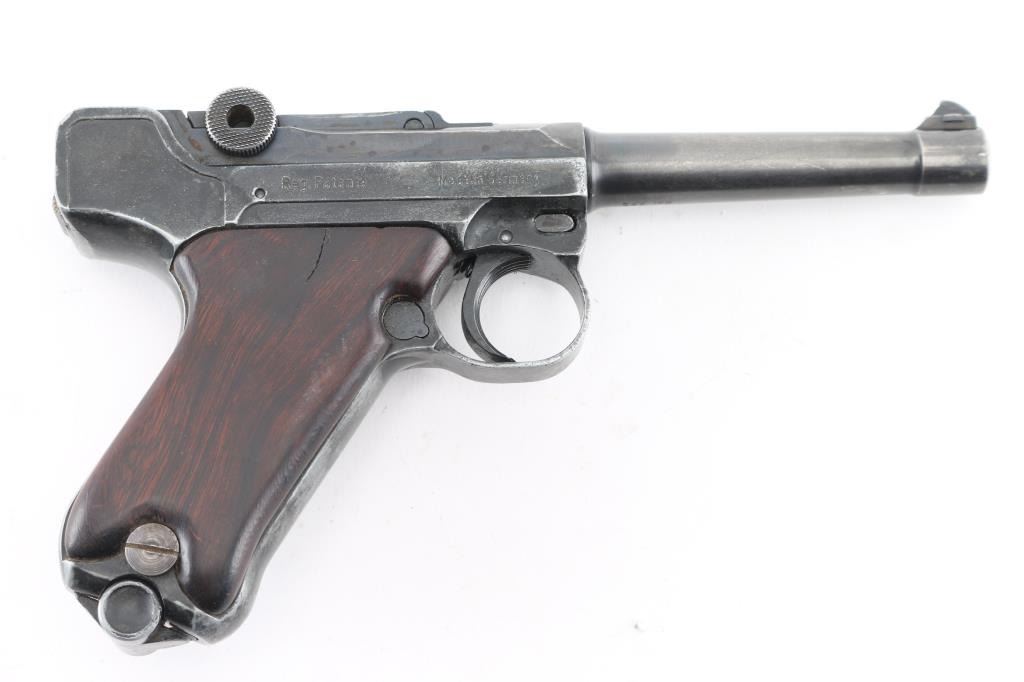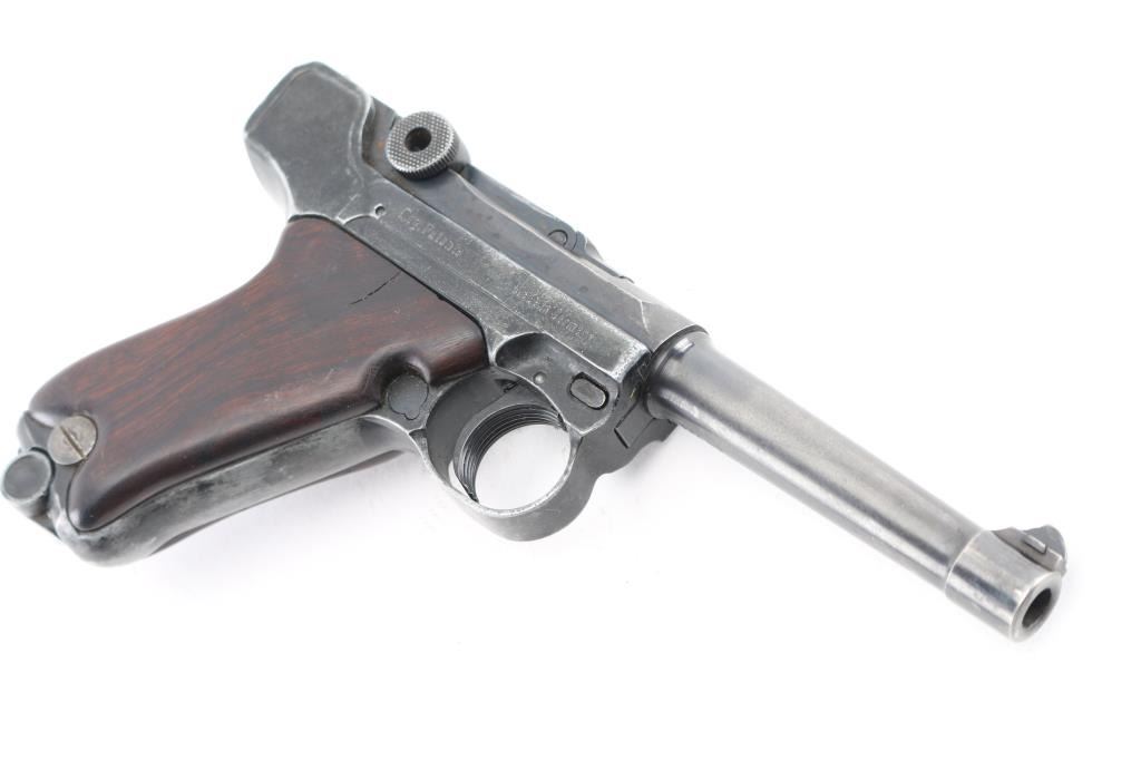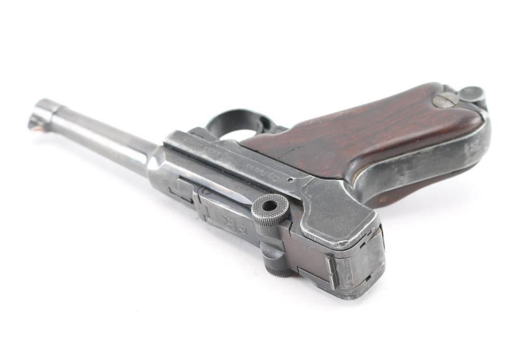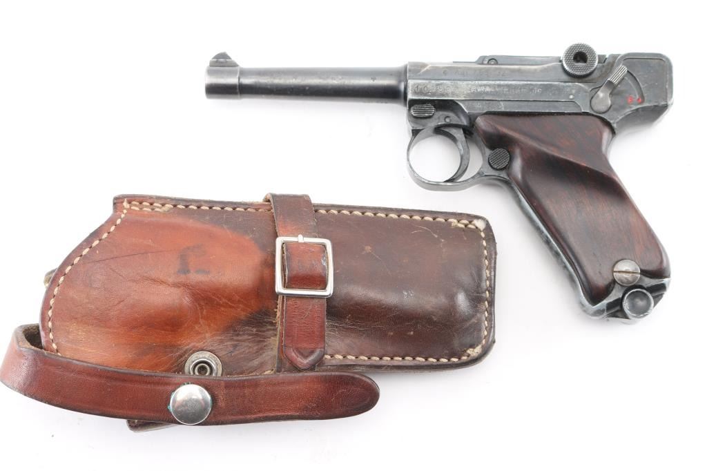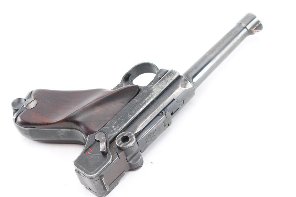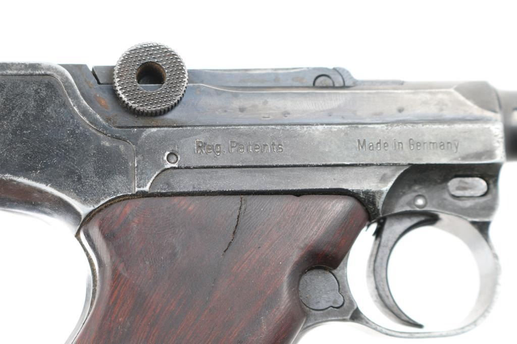 Semiautomatic pistol made in Germany in 1969, no visible import marks. Has the appearance of an approx 3/4 scale Luger. Features blued finish, contoured smooth wood grips, manual safety, fixed sights, 3.5" barrel. Bore is very good. Retains about 60% finish with handling loss, holster wear. Grips are sound. Includes one magazine, and brown leather snap holster.. Condition is NRA Good. C&R Firearm.