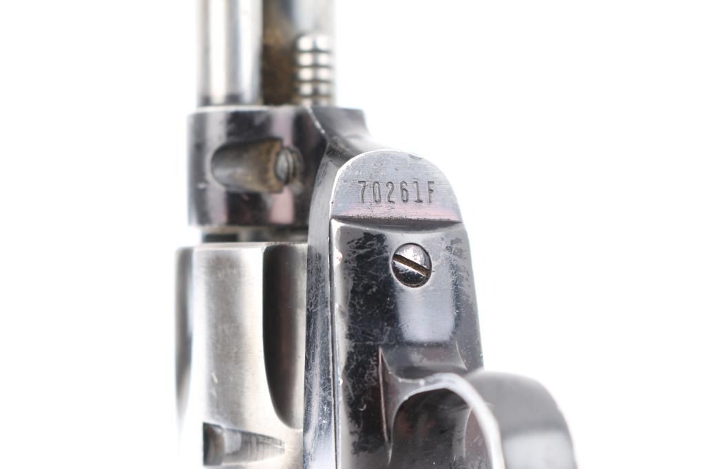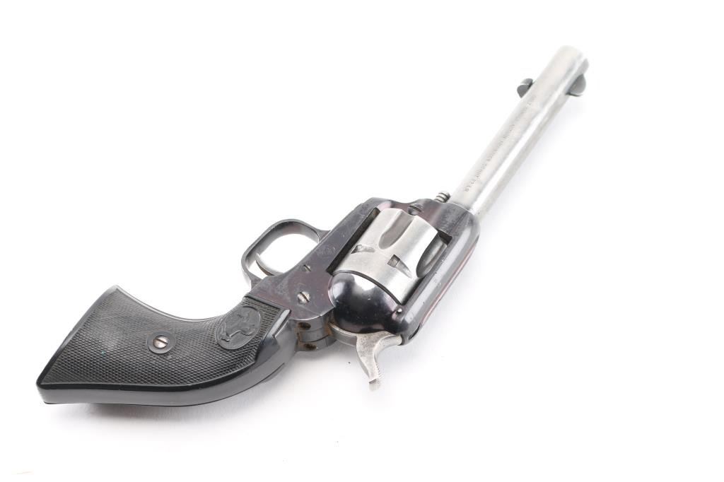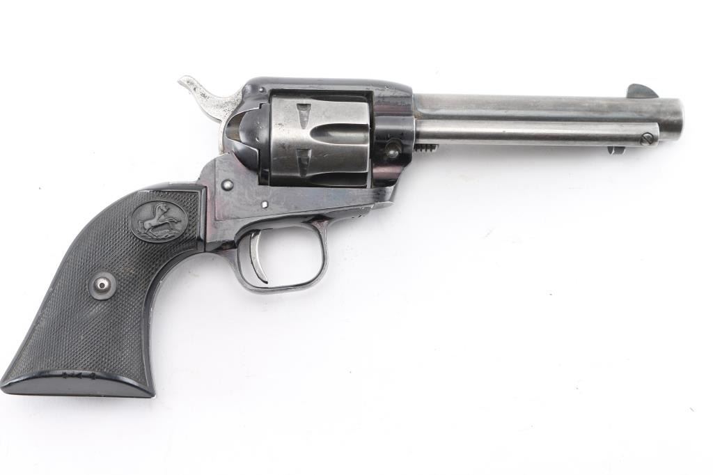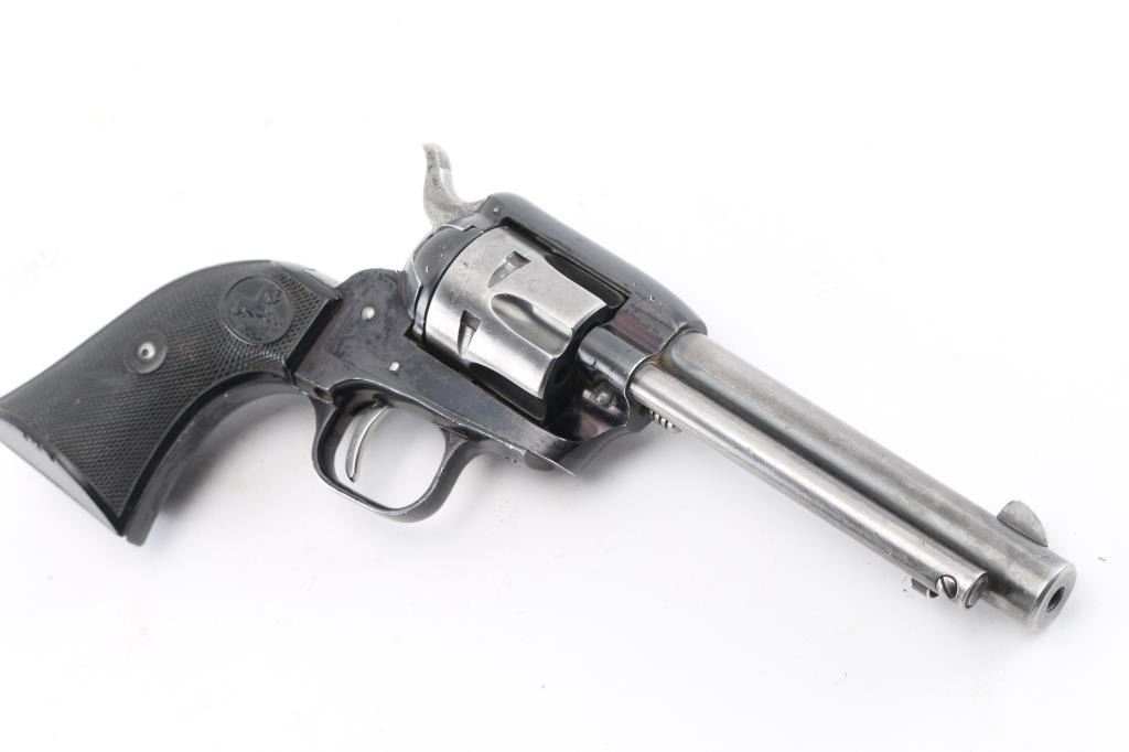 Vintage western style single action rimfire revolver manufactured circa 1959. Scaled down copy of a Colt Single Action Army. Features blued finish, checkered black hard rubber grips with Rampant Colt motifs, 4.75" barrel, fixed sights, 6 shot fluted cylinder. Bore and charge holes are excellent condition. Retains 50% original blue with holster wear leaving most of the barrel and cylinder in the white. Grips are very good condition, someone has carved 3 small notches in the bottom right grip panel.. Action is smooth/tight. Condition is NRA Good. C&R Firearm.