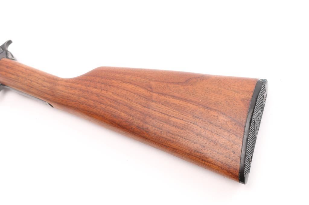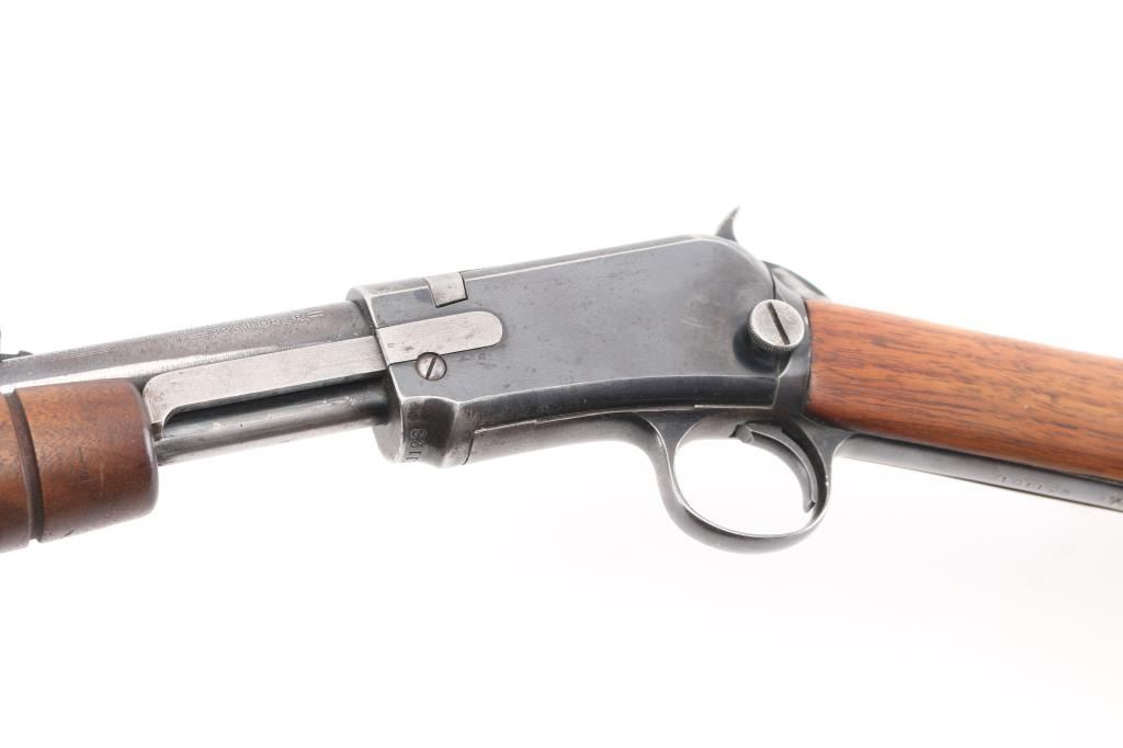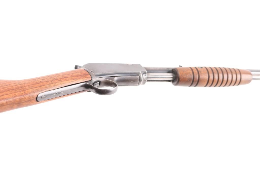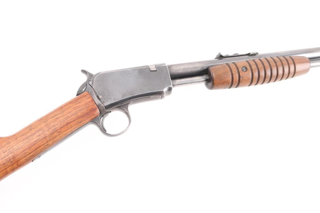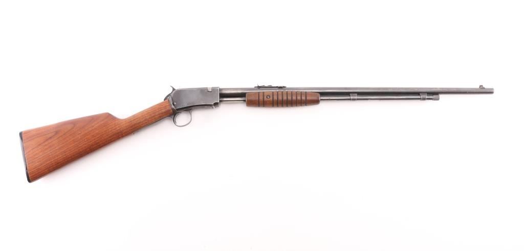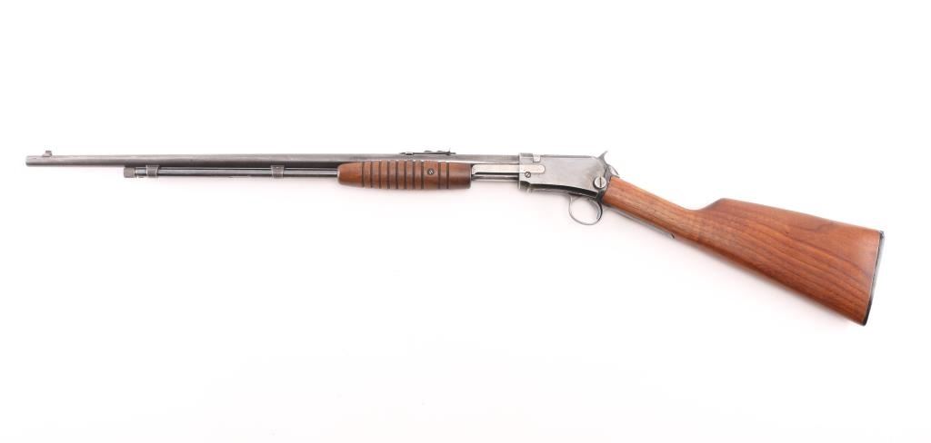 Vintage pump action rimfire rifle manufactured circa 1940. Features blued finish, grooved wood pump handle, wood butt with straight grip area, factory hard rubber buttplate, 23" round barrel, blade front sight with bead top, sporting rear sight, magazine tube under barrel, external hammer, take down screw in receiver. Bore is very good bright condition. Retains 40% original blue, much remaining dark color has faded to patina brown or shows thinning, with edge losses & handling marks. Bolt is dull gray bare metal. Wood is very good condition overall, pump handle shows age, shoulder stock appears newer replacement, buttplate has a chip missing at edge of heel. Numbers match on receiver cover & lower tang. Condition is NRA Very Good *** C&R Firearm ***