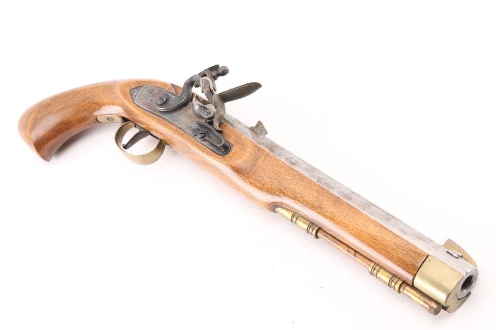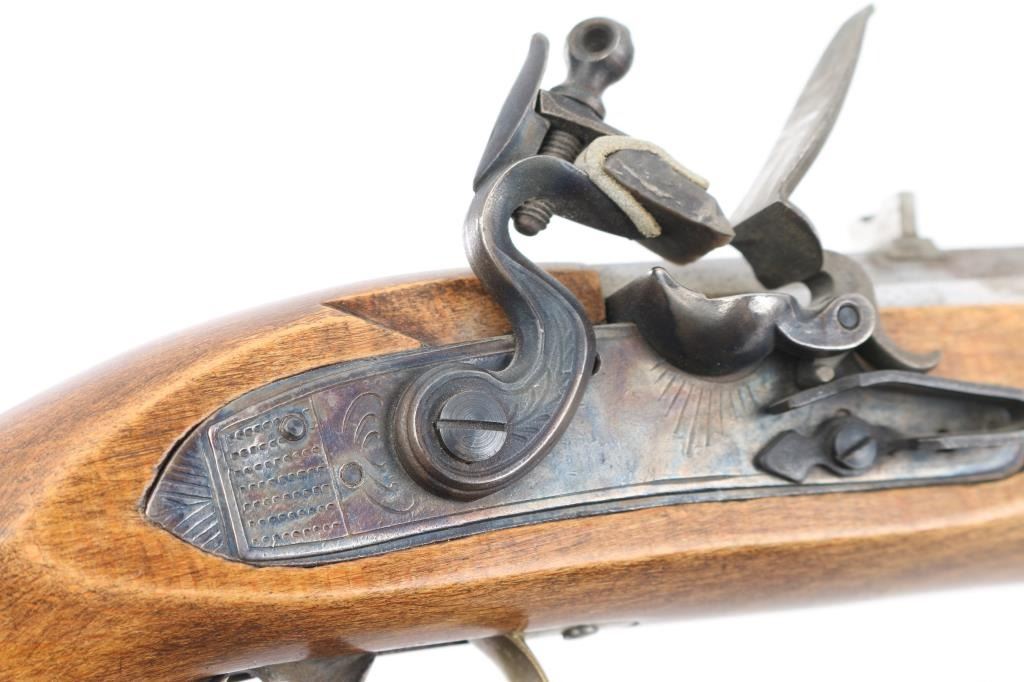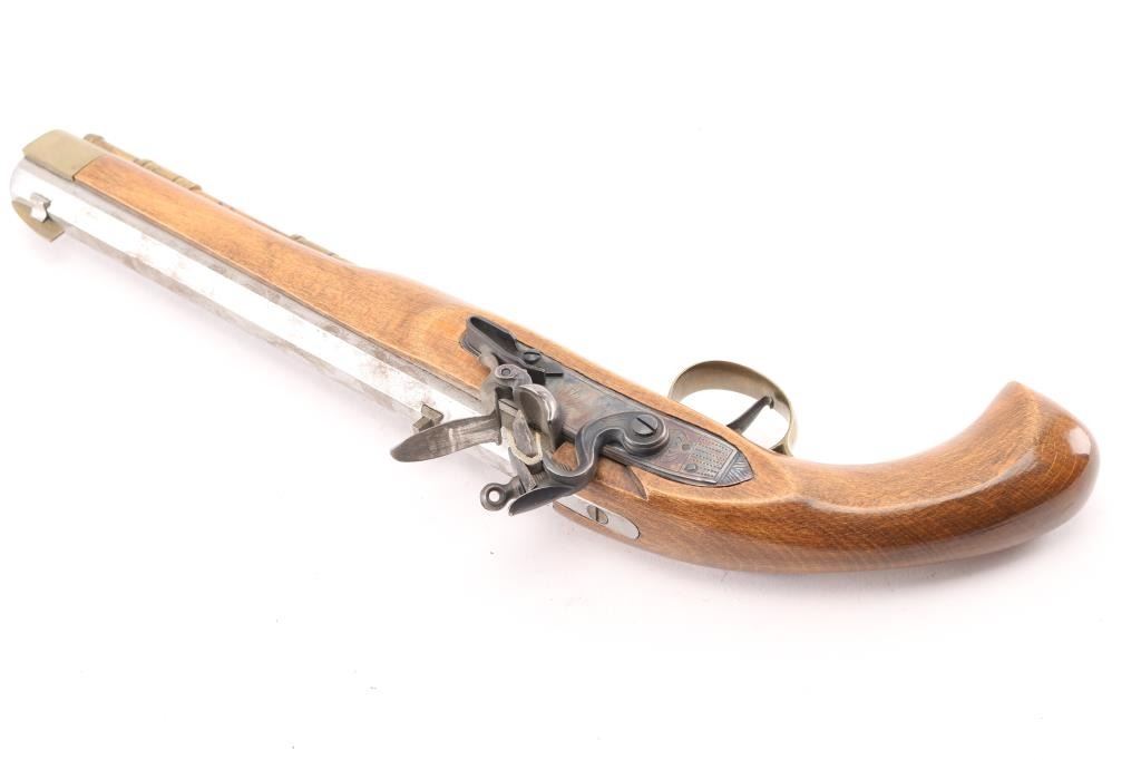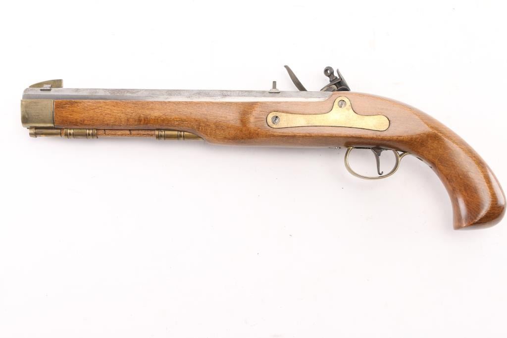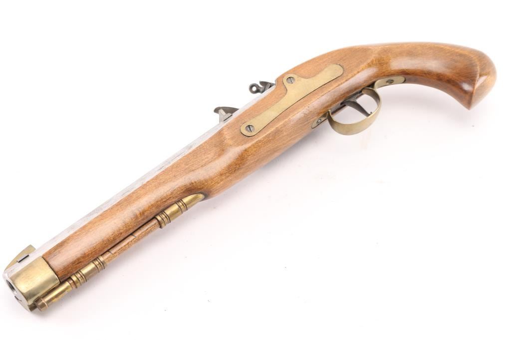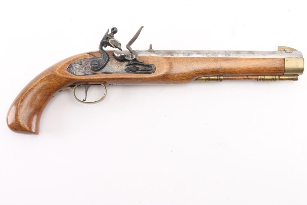 Recently manufactured Spanish single shot flintlock pistol, for black powder only. Features a bare metal 10" heavy octagonal barrel, brass blade front sight, dovetailed rear notch sight, brass tipped wood ram rod, engraved case hardened lock, smooth trigger, brass furniture and one-piece wood stock with bird's head grip. Bore is very good, bright condition. Barrel shows scattered light rust. Overall very good condition with few signs of handling, appears possibly unfired. Condition is NRA Very Good *** "Antique" Firearm ***