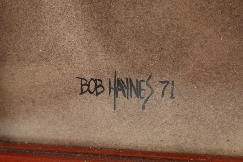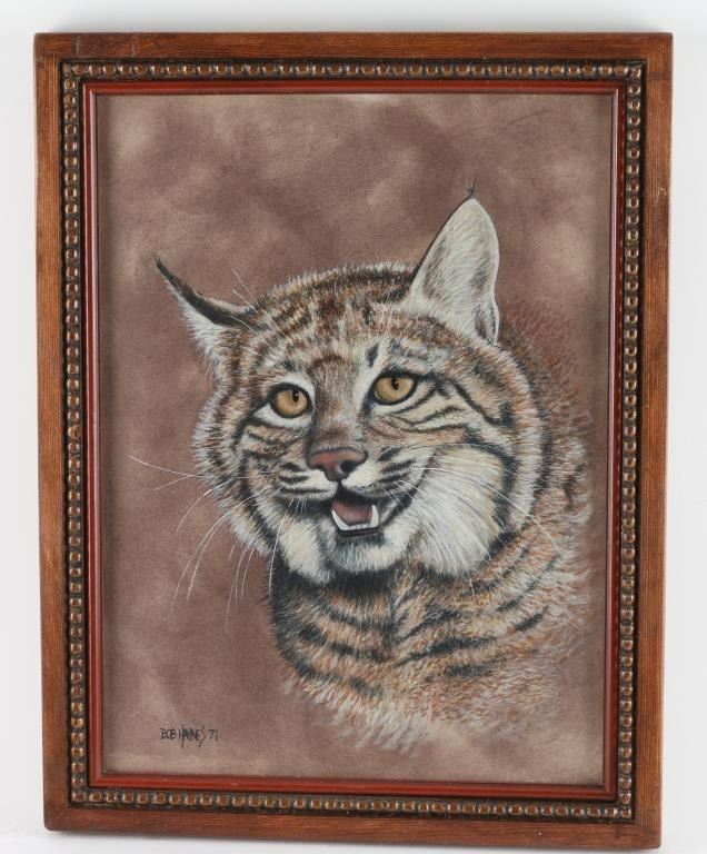 By artist "Bob Haynes" depicting Bob-Cat, this piece is signed and dated 1971 in lower left corner. Framed in carved wood frame. Image size measures "16x11.5"