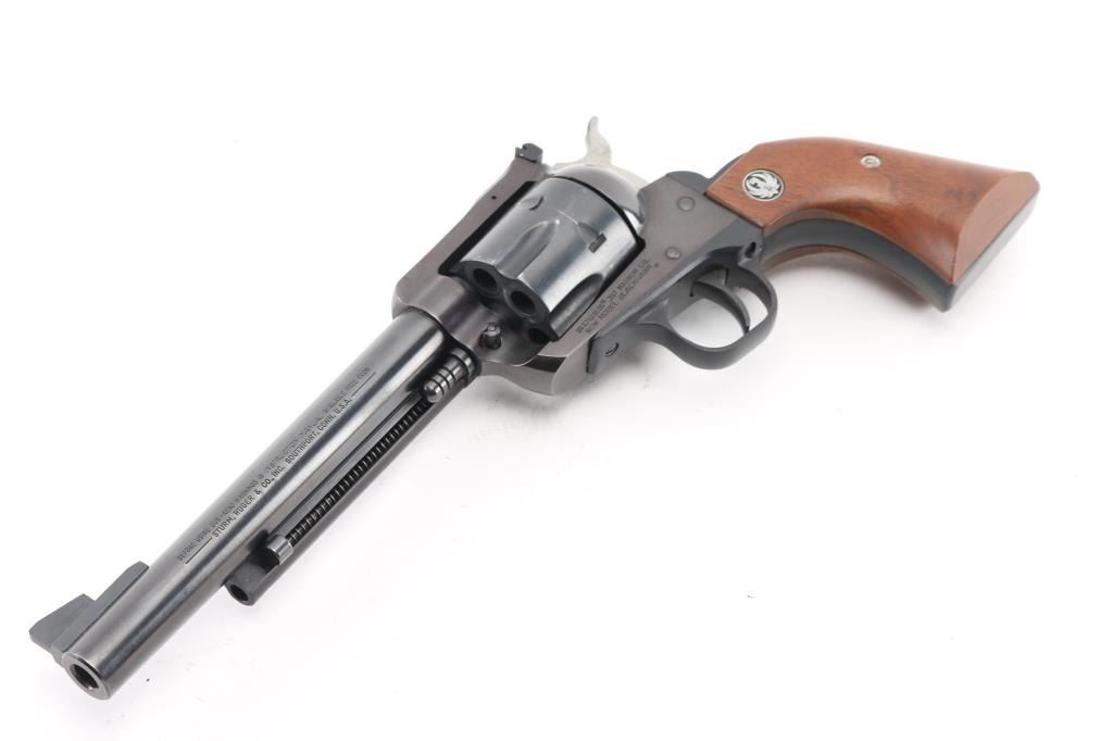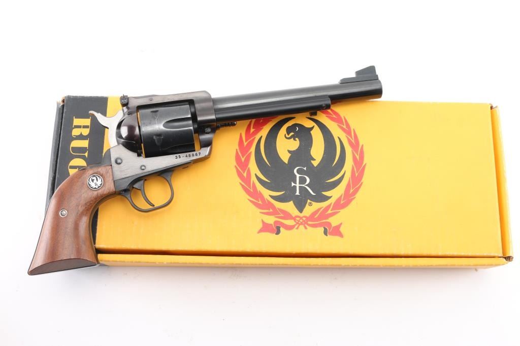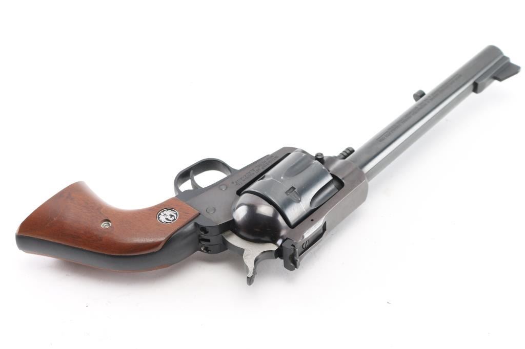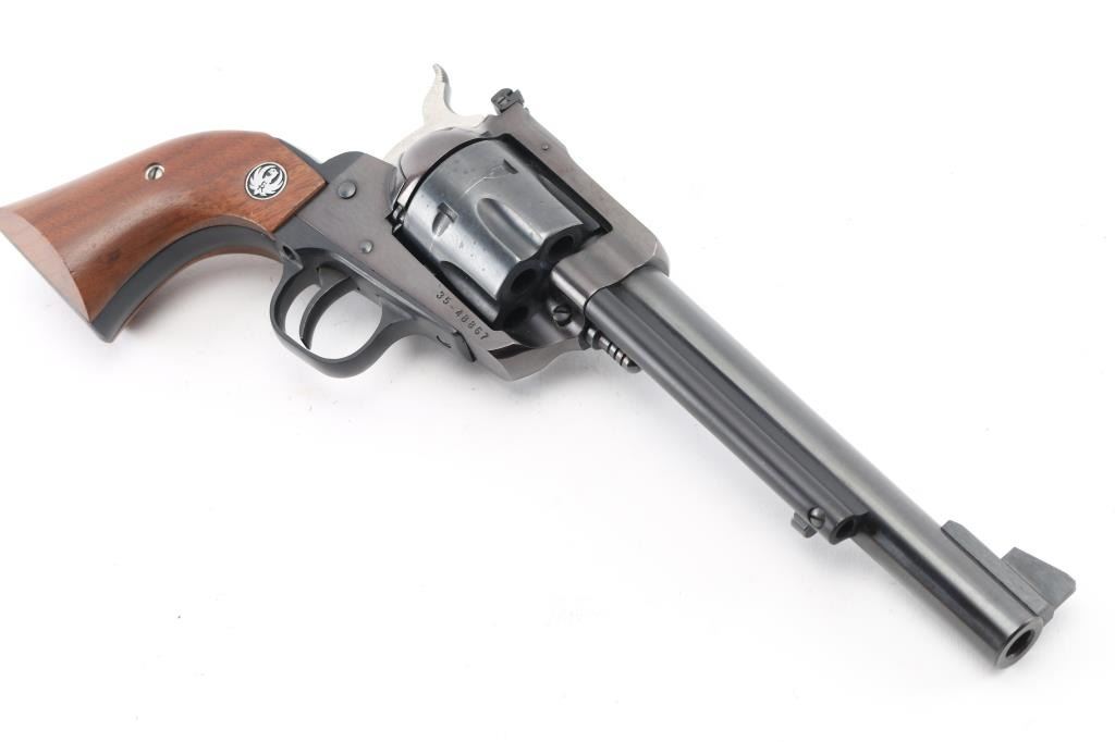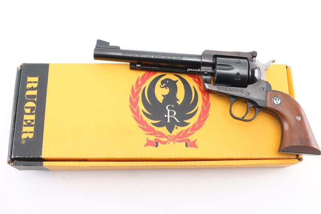 New Model, American made single action revolver chambered in .357 Mag. Features a blued finish, 6 1/2" barrel, raised serrated ramp front sight, Micro adjustable rear sight, thin trigger, serrated hammer spur, fluted six-shot cylinder, flat top frame, black finished aluminum alloy grip frame and two-piece smooth walnut grips with Ruger medallions. Revolver retains most of it's original blued finish showing scattered light handling marks, tracking on cylinder. Good lock-up, the bore appears excellent and the wood grips are very good. Comes with factory box with trigger lock Condition is NRA Very Good. Modern Firearm.