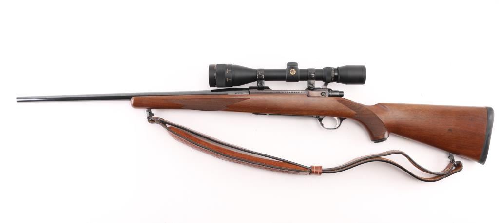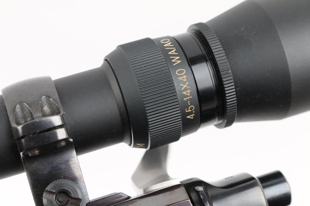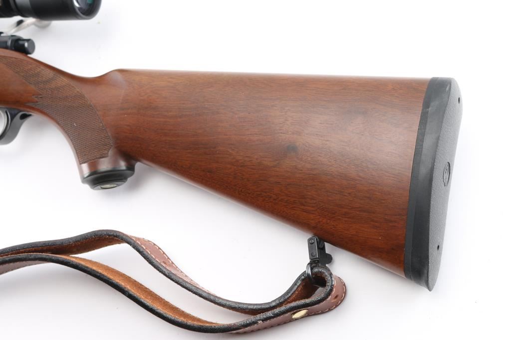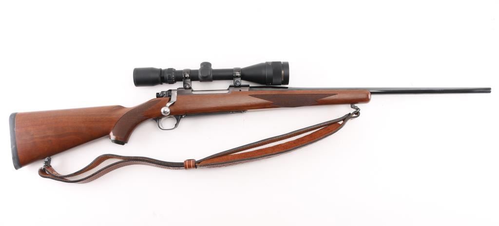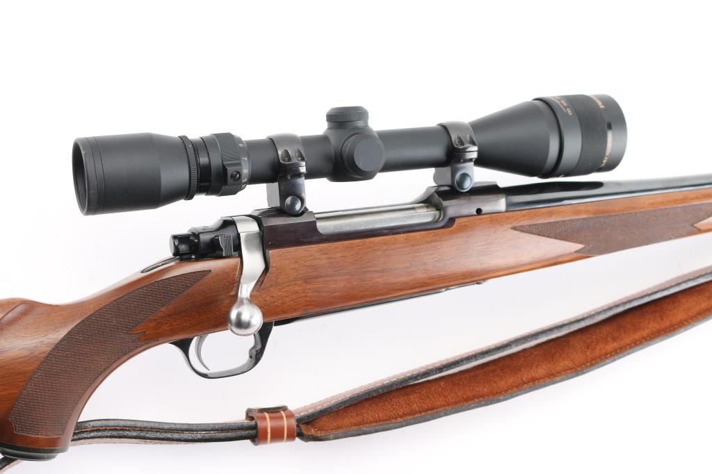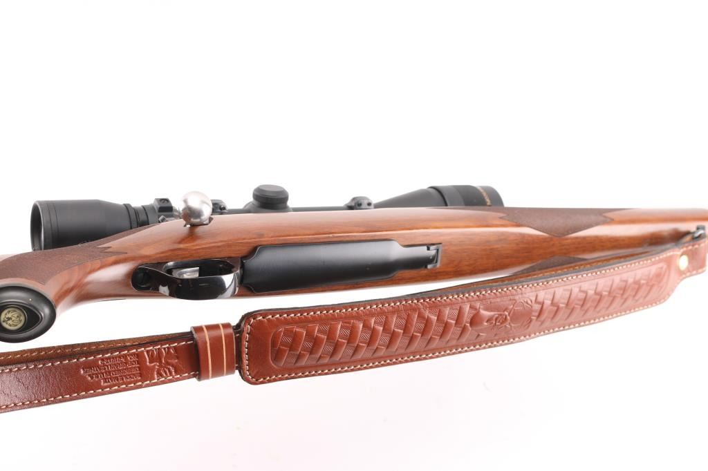 Bolt action rifle manufactured circa 2000. Features blued action with bright stainless bolt, 22" tapered barrel, no sights, checkered wood stock, no cheekpiece, thin solid rubber recoil pad, sling studs, scalloped dovetails on receiver for scope mounting, hinged floorplate, side swing safety at right rear of receiver. Bore is very good condition. Retains 95% blue with handling marks. Wood is very good condition with minor handling marks. Mounts a very good condition Simmons ATV 4.5-14x scope with adjustable objective, duplex reticle, clear optics. Includes very good condition padded leather sling. Condition is NRA Excellent *** Modern Firearm ***