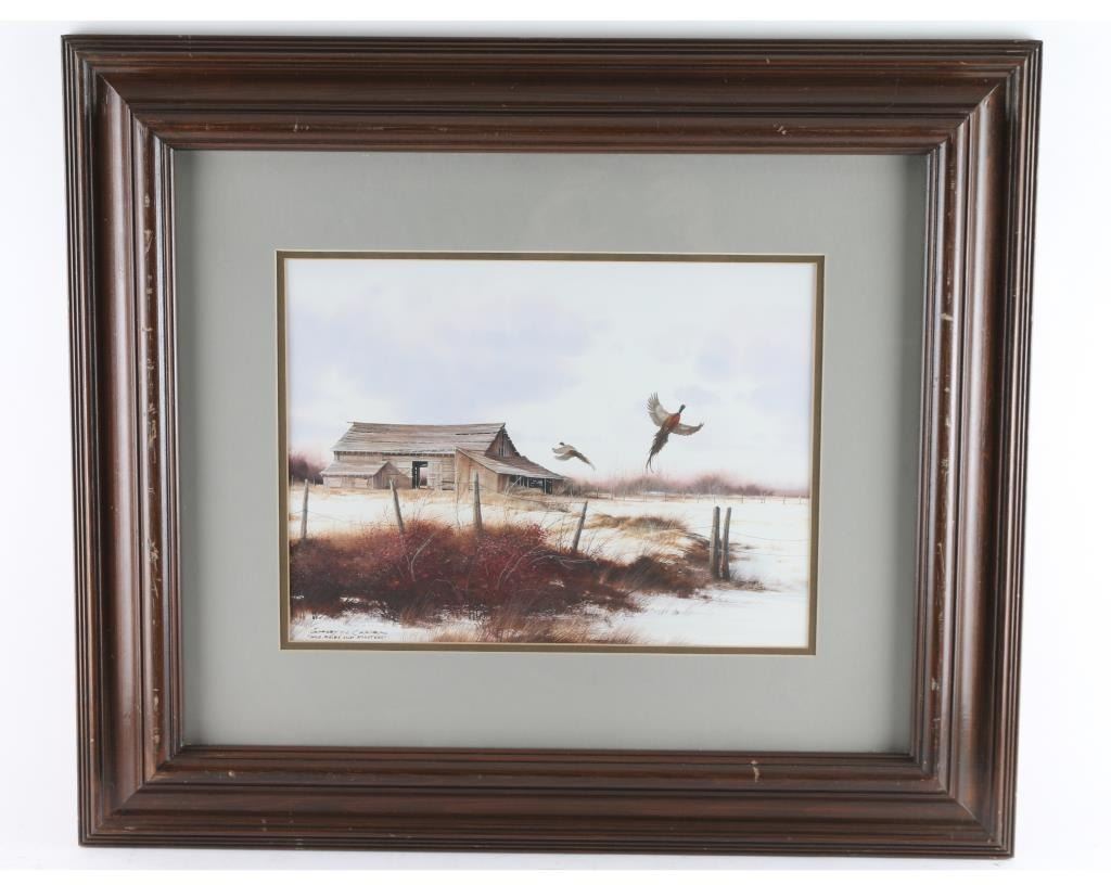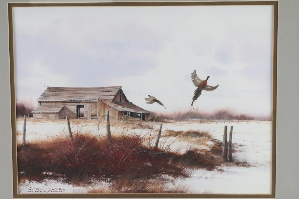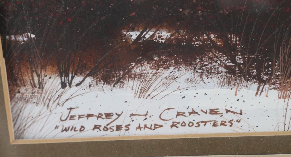 By artist "Jeffrey Craven" entitled "Wild Roses An Roosters". Triple matted and framed in wood frame. Image size measures 15x11.Great piece, very talented artist.