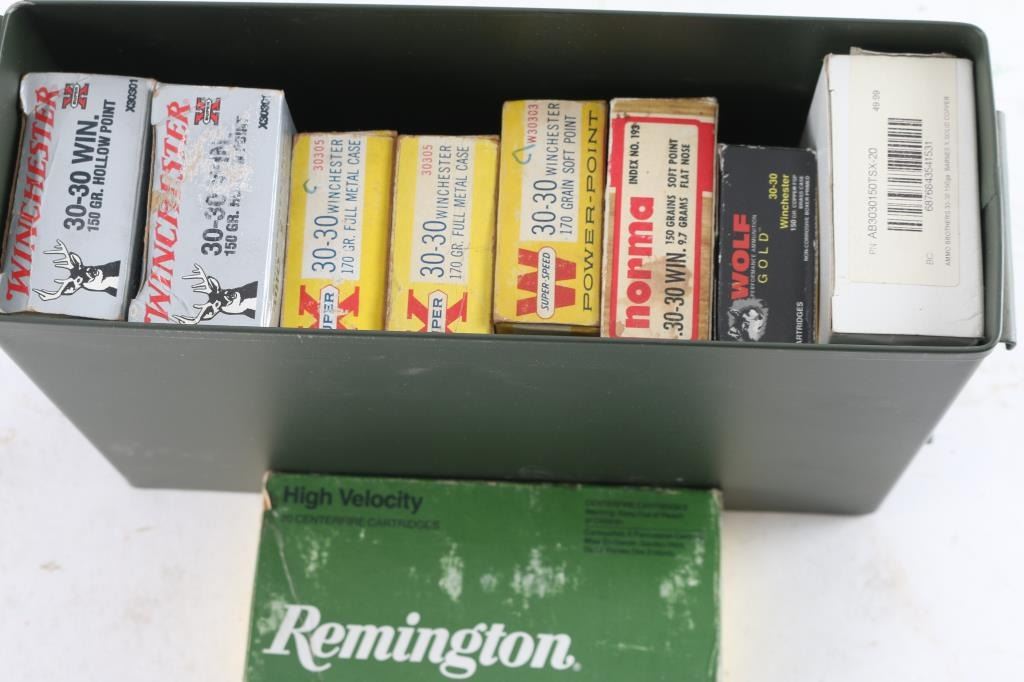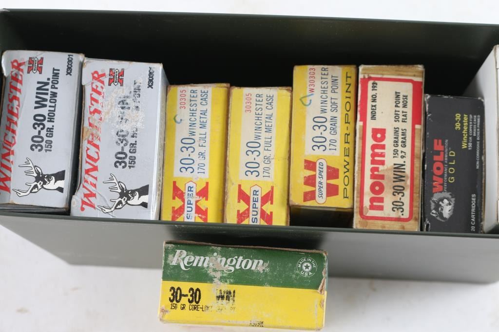 Approx. 180 rounds of 30-30 Winchester factory new & reloaded ammunition. Various makers, weights & bullets. All in metal ammo can.