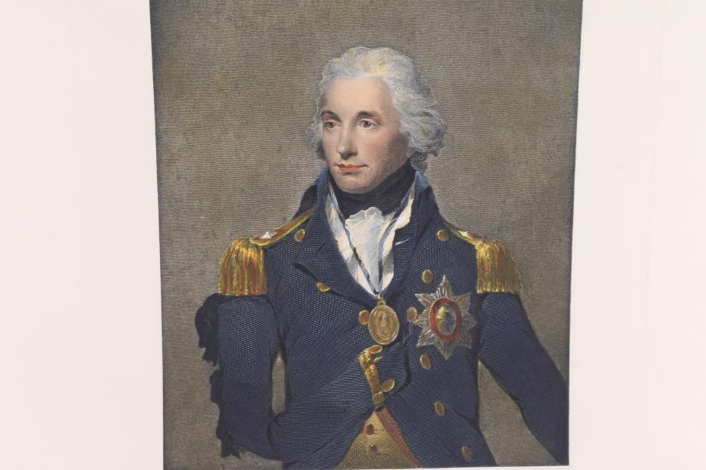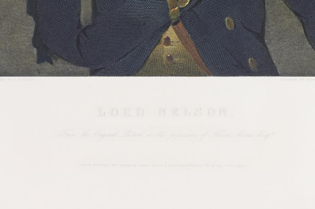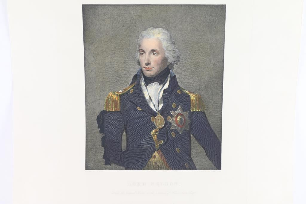 of Lord Horatio Nelson, who is generally regarded as the greatest officer in the history of the Royal Navy. His reputation is based on a series of remarkable victories, culminating in the Battle of Trafalgar where he was killed in his moment of triumph. The poet Byron referred to him as 'Britannia's God of War'. The image measures approx 9 1/2" x 11 1/2". Under the image on the left side, states, "Painted by L. F. Abbott" and under the image on the right side has, "Engraved by Robt Graves A.R.A.". Approx 1" below the image and centered says "LORD NELSON" and 1" below that says, "From the original picture in the pofsession of Huson Morris, Esq" and about 1" underneath that sentence says " London Published Nov 6th 1847 by Henry Graves & Comp Publishers to the Queen 6.Pall Mall". Overall measurement is 20"x22". Very good condition. A rare find. From the Estate of Joseph Musso.