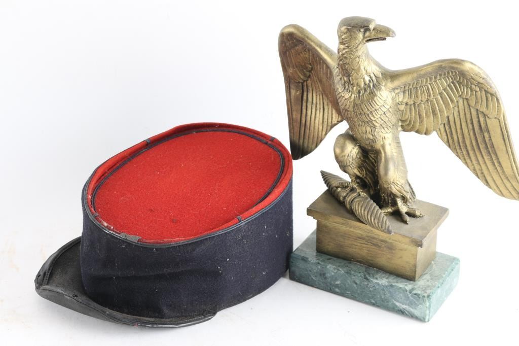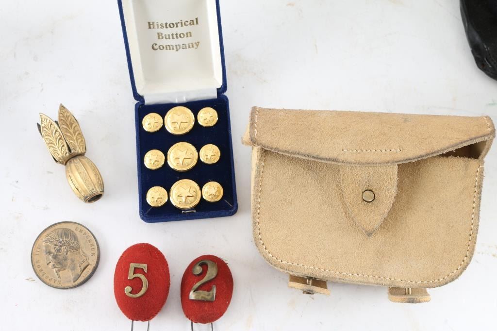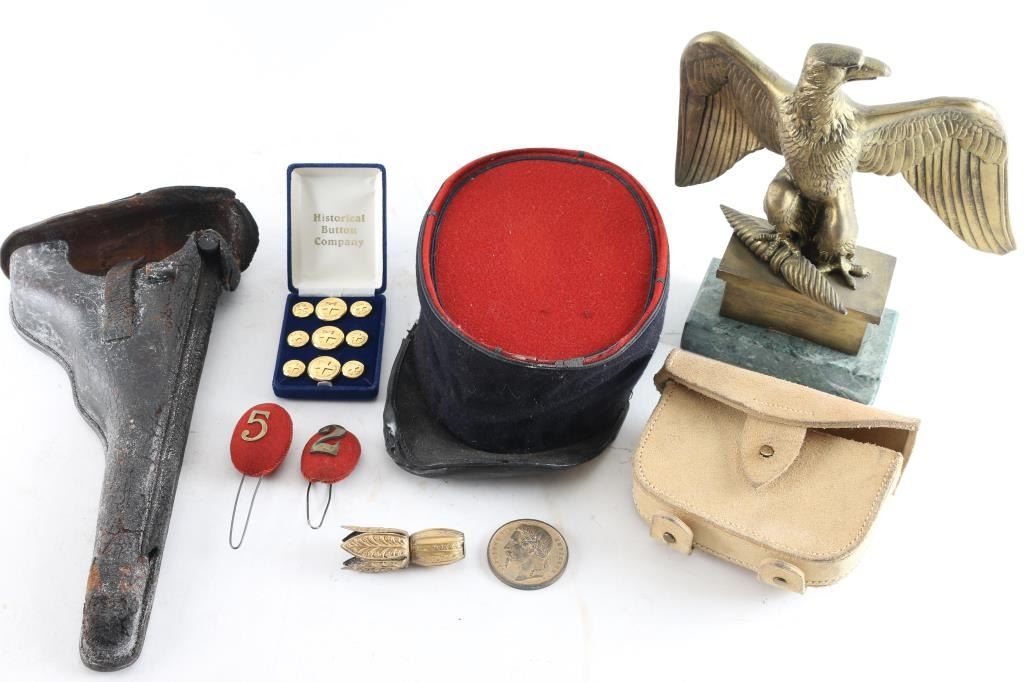 Artillery Luger Leather holster, reproduction British military cartridge box, helmet pommels, reproduction buttons, helmet finial, Reproduction, French Foreign Legion and reproduction Napoleon First Empire Eagle.