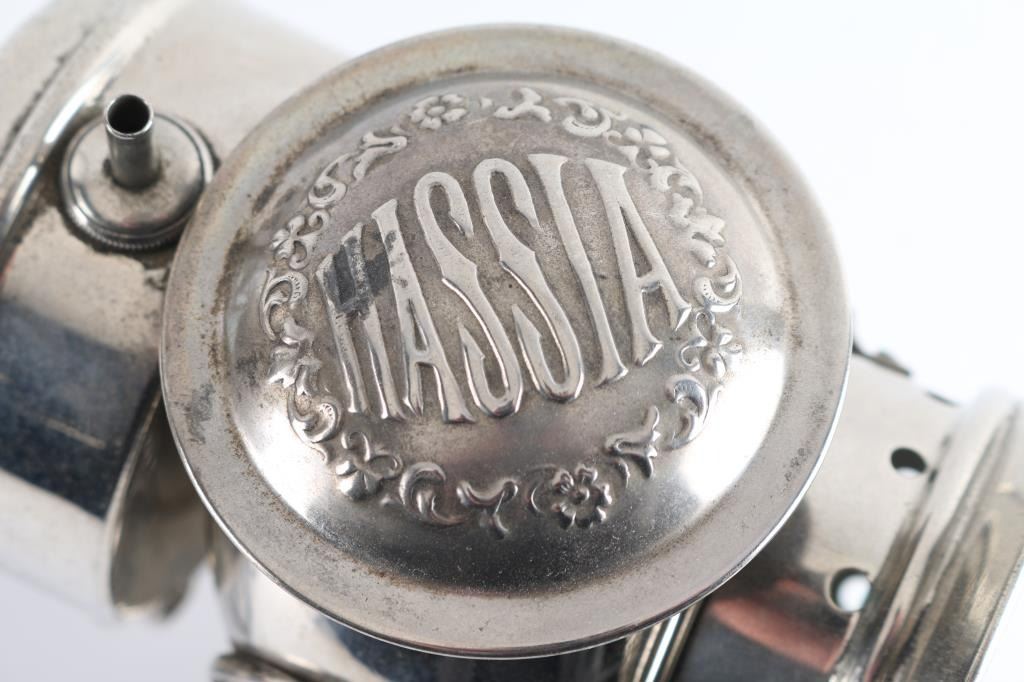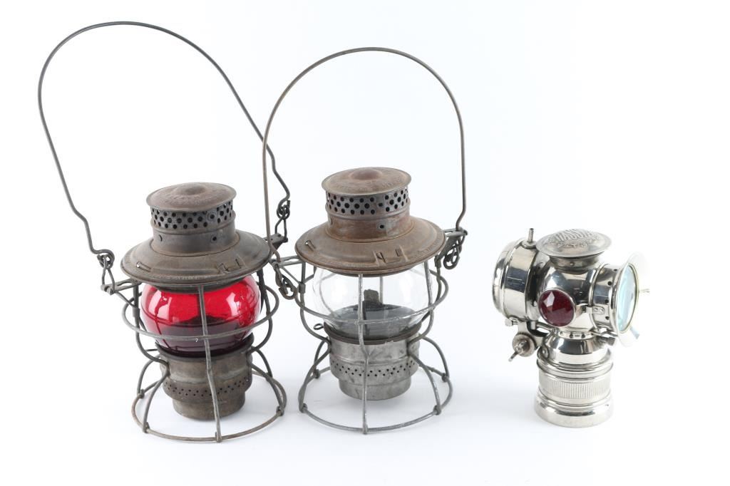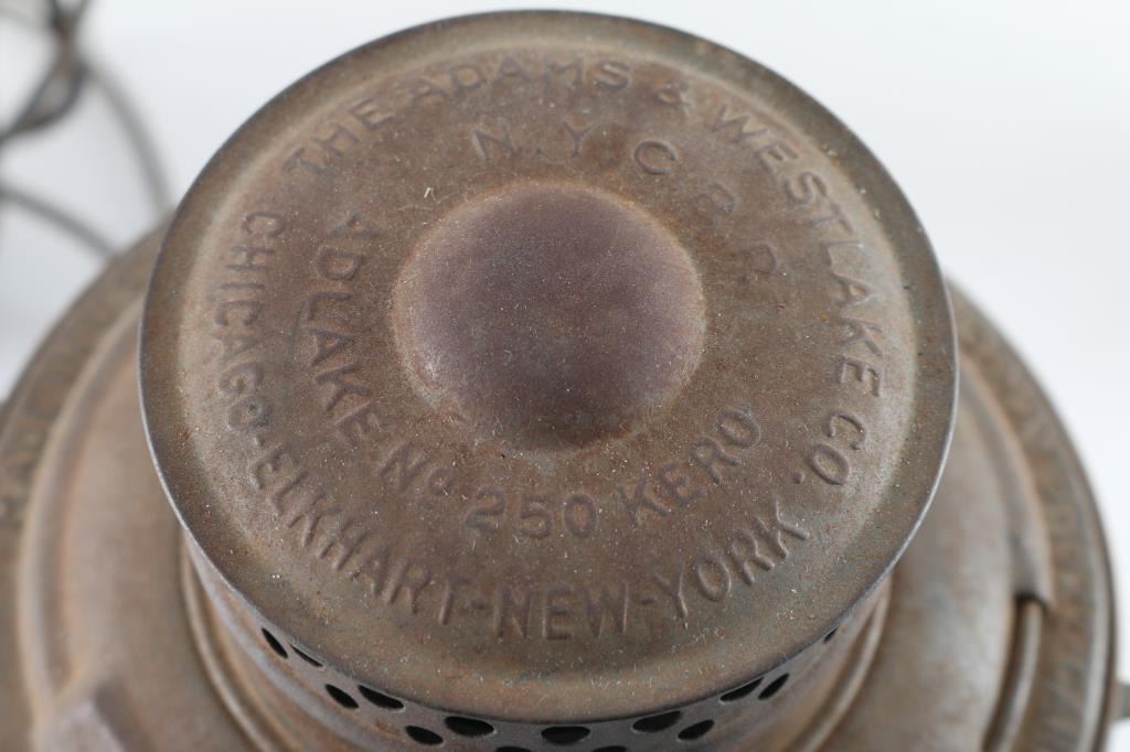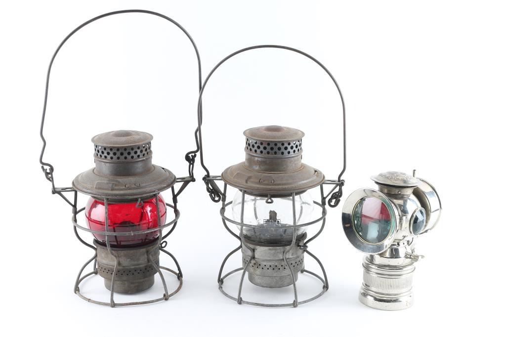 includes two kerosene lamps (one clear & one red globe) marked "Adams & Westlake", in good condition, even brown rust colored; "Hassia" marked carbide type miner's lamp, bright metal, in very good condition, with clear main lens, red & green side lenses.