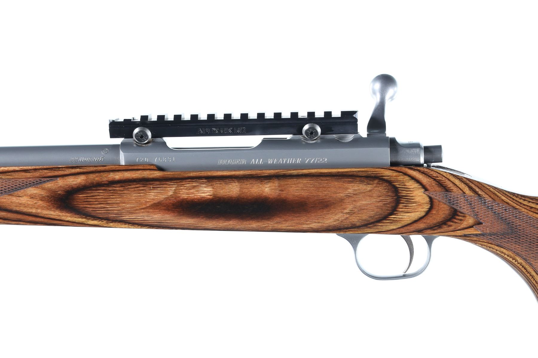 .22 Hornet Serial # 720-76831 Ruger M77/22 All Weather" 22 Hornet with stainless steel construction . Detachable rotary magazine. laminated wood stock. Muzzle threaded. Condition, very fine with little use. Excellent bore. Mechanically excellent.