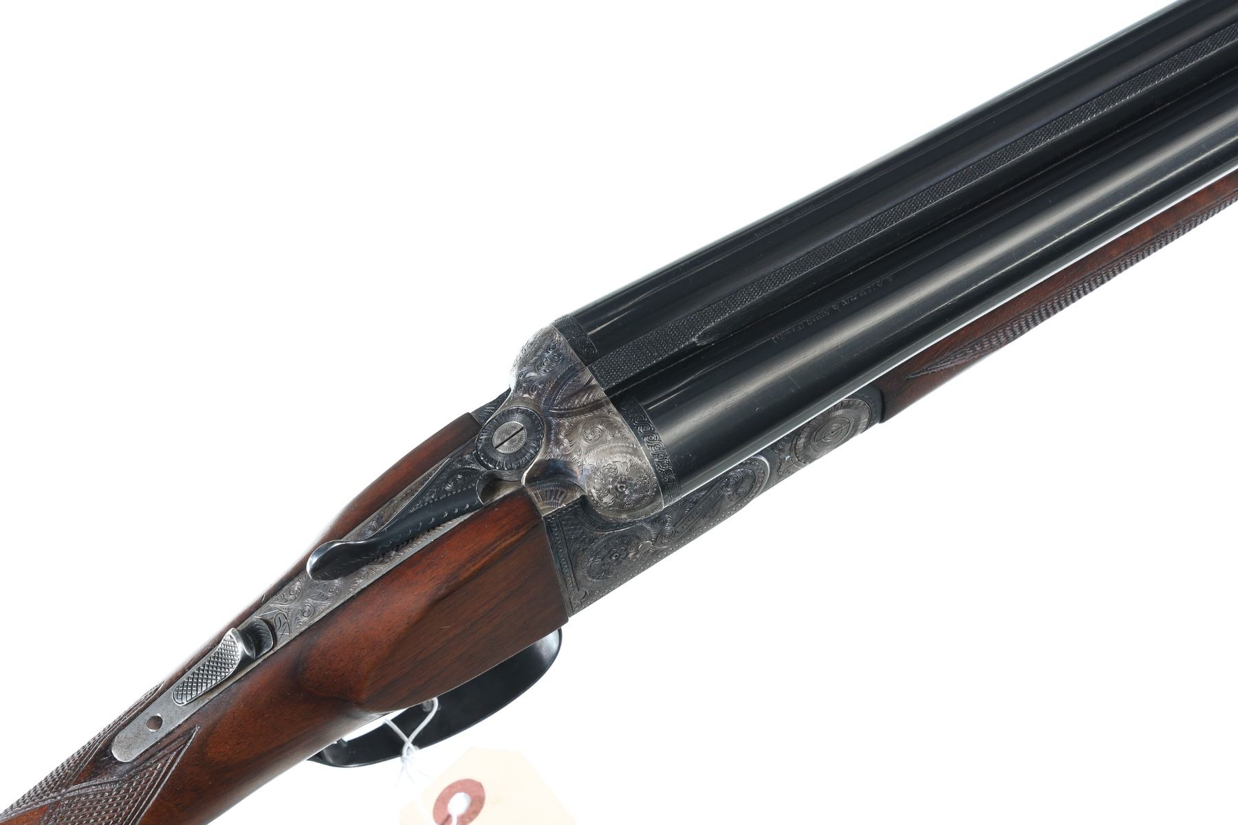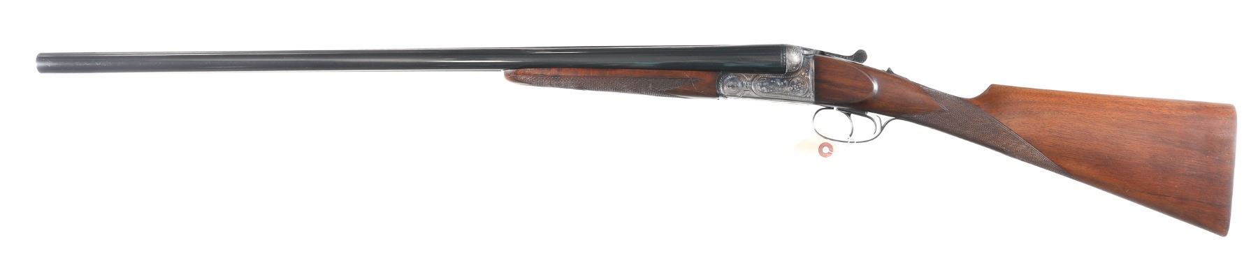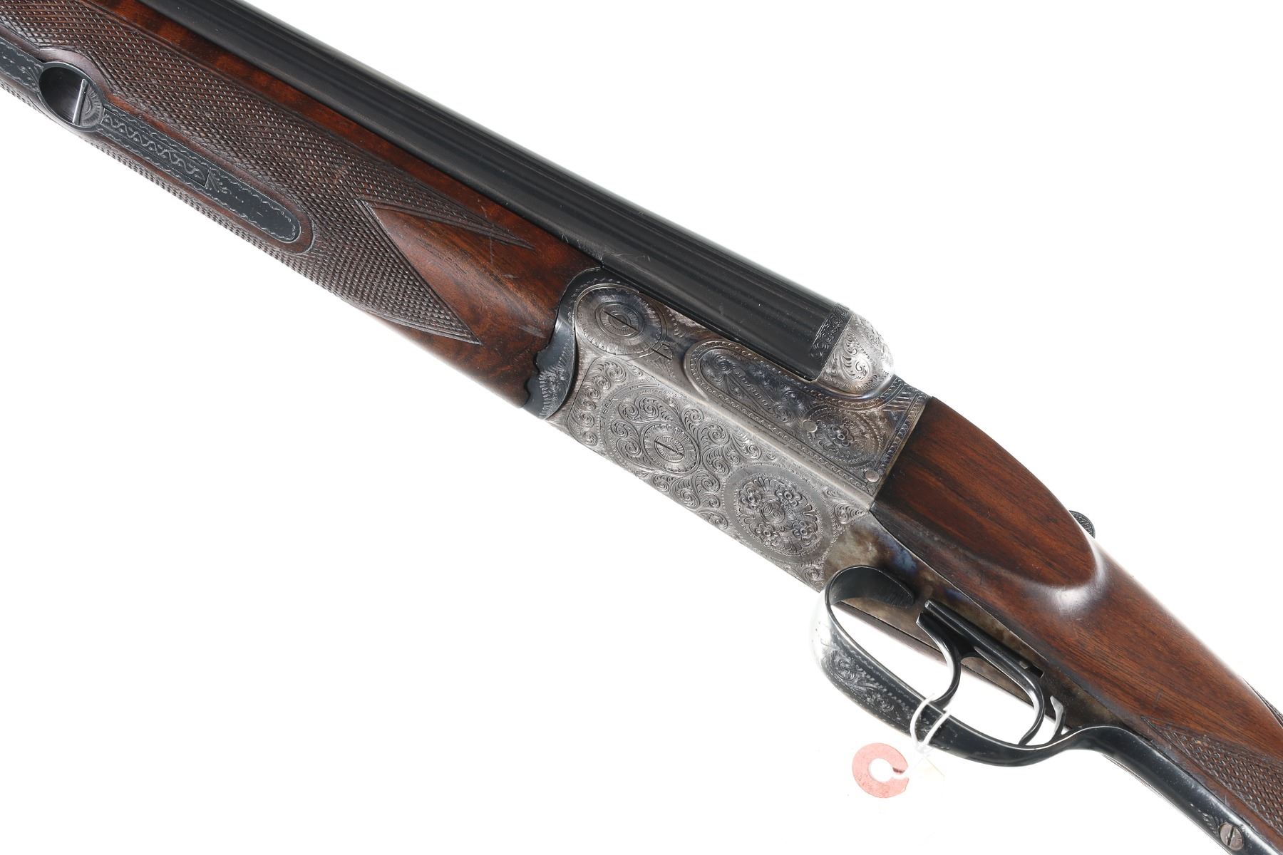 12ga Serial # 143165 Laurona Blue and case color boxlock double 12 bore shotgun with 28" Bbl, choked Full & Imp, Cyl with 2-3/4" chambers. Double triggers with ejectors. Engraved with scrolls and rose. English straight stock with matching splinter forearm. LOP 14 1/2" DAC 1 1/2" DAH 2 1/8" Condition. Very fine with metal rating excellent with most finish remaining. Bright bores and solid lock up. Stocks are very fine with some minor bruises. Mechanically excellent. Barrel 28" C&R