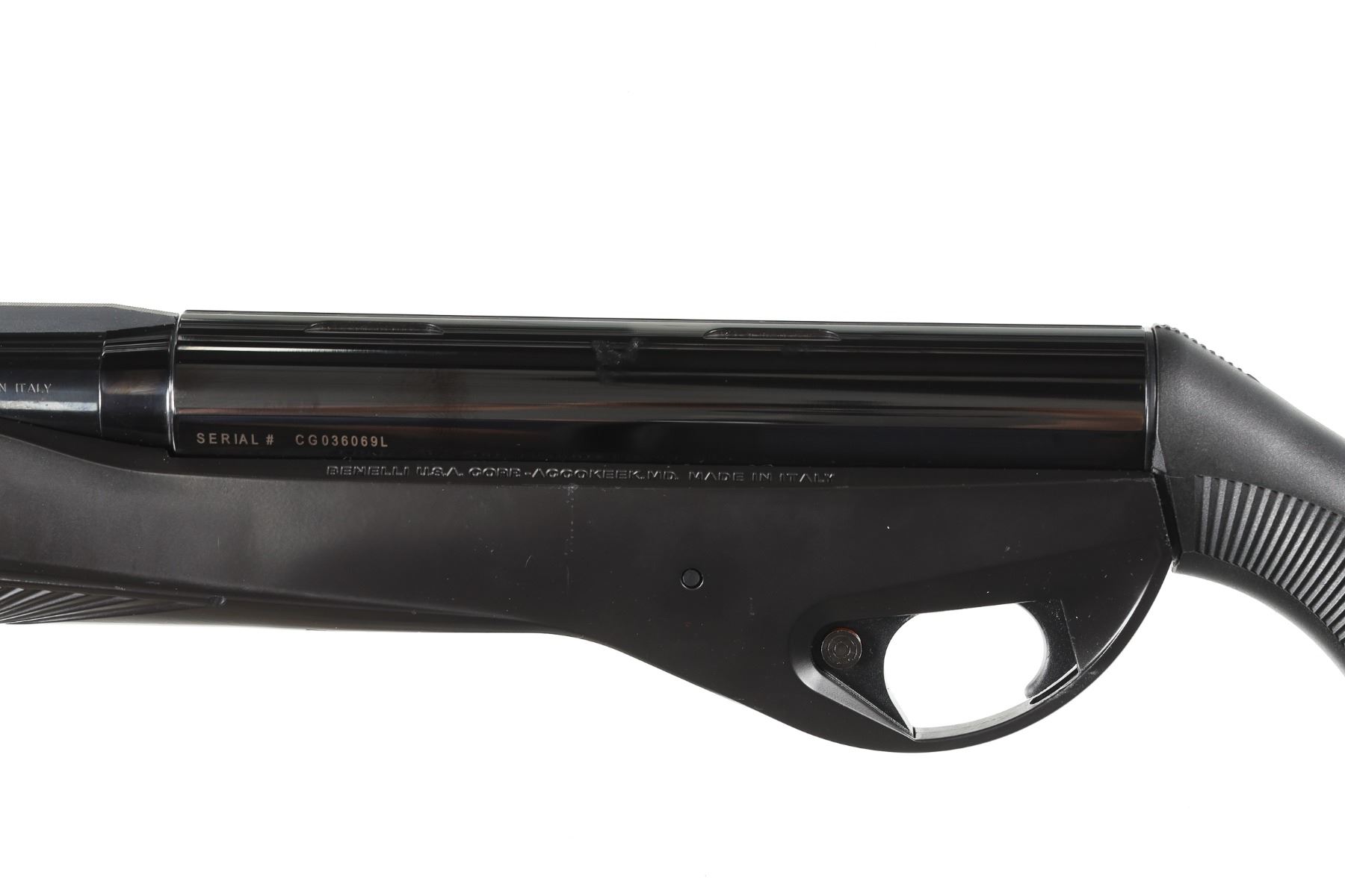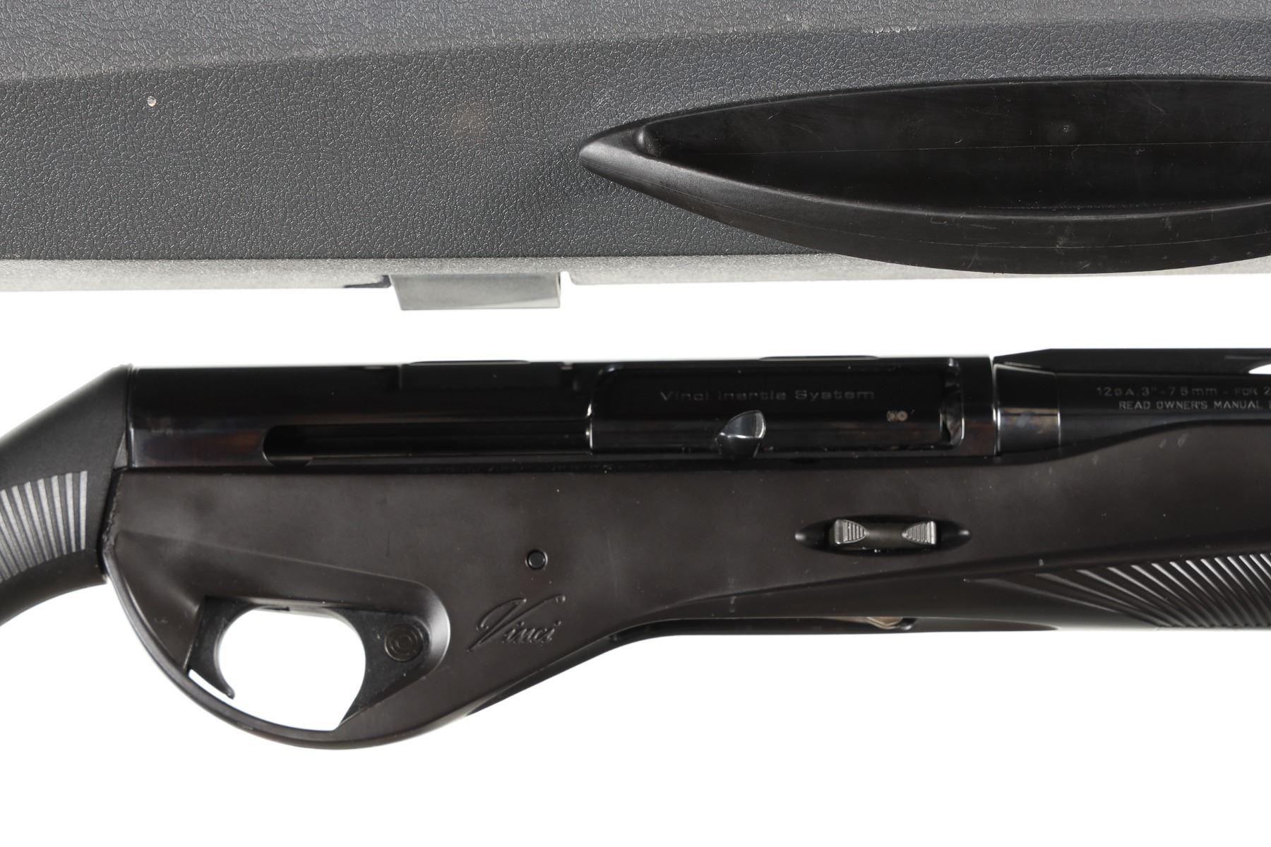 12ga Serial # CG036069L Benelli Vinci 12 Ga, semi-automatic shotgun with 30"Ventilated rib with factory interchangeable chokes and wrench. Black synthetic stocks. with factory box. Condition Very fine with most all blue finish remaing. Bright bore and properly operating action. Recoil pad is flaking