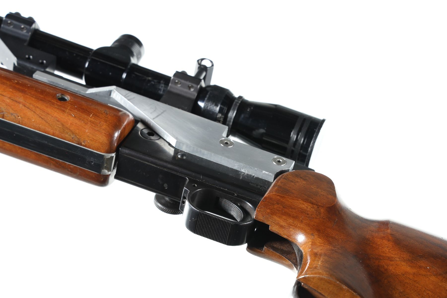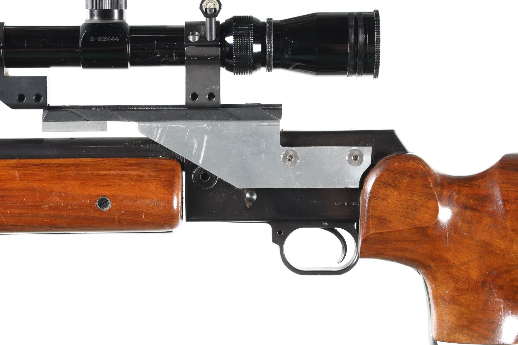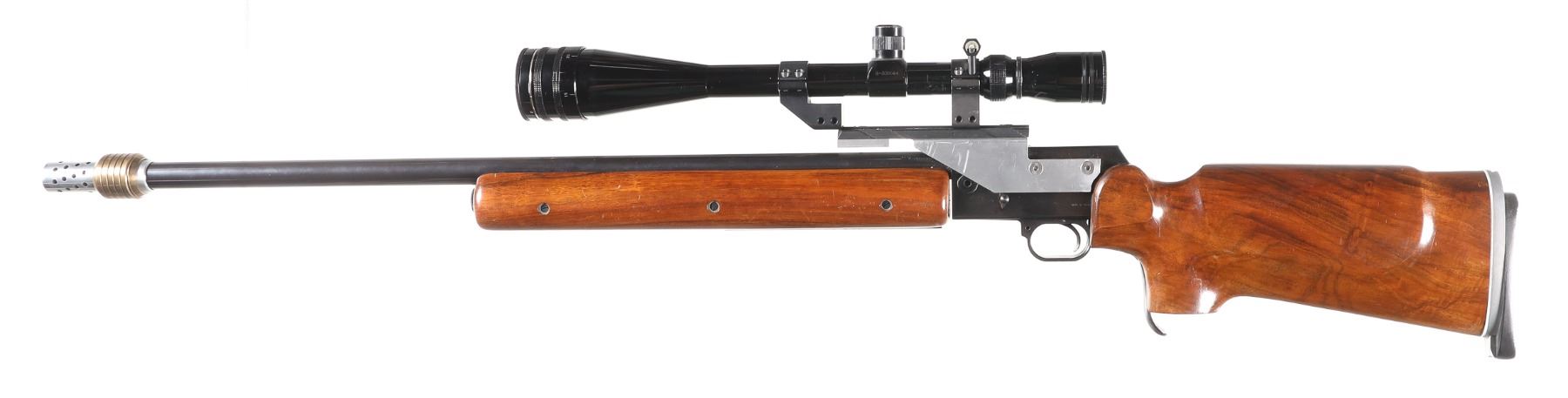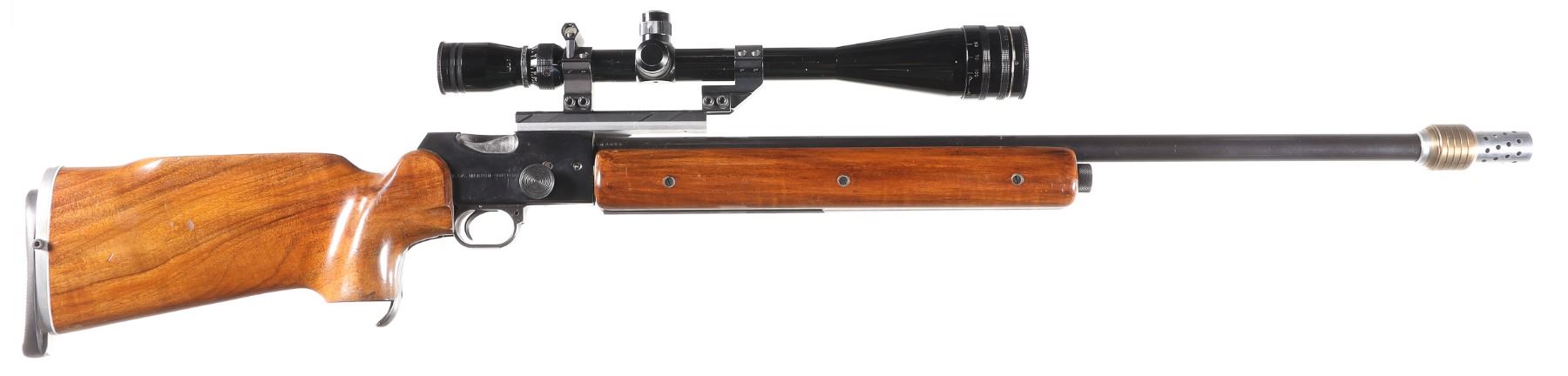 .22 LR Serial # FG0226 BSA International Martin Heavy Bbl single shot target rifle with 8-32 power target scope with spirit level with adjustable butt. , palm stop rail and muzzle brake and barrel harmonics system. 13 1/2" LOP. Condition Very fine with most finish remaining bright bore and mechanically fine with clear optics. Barrel 27" 1964 C&R
